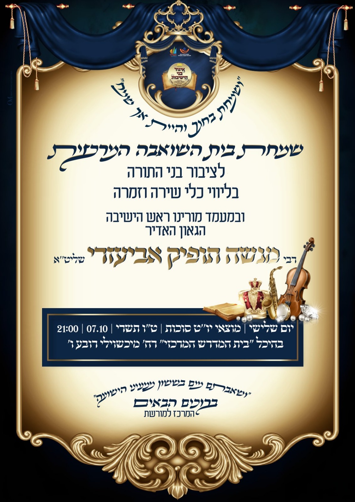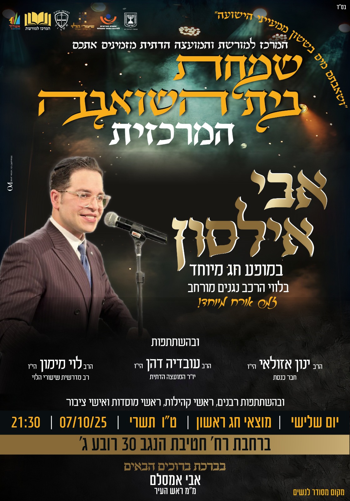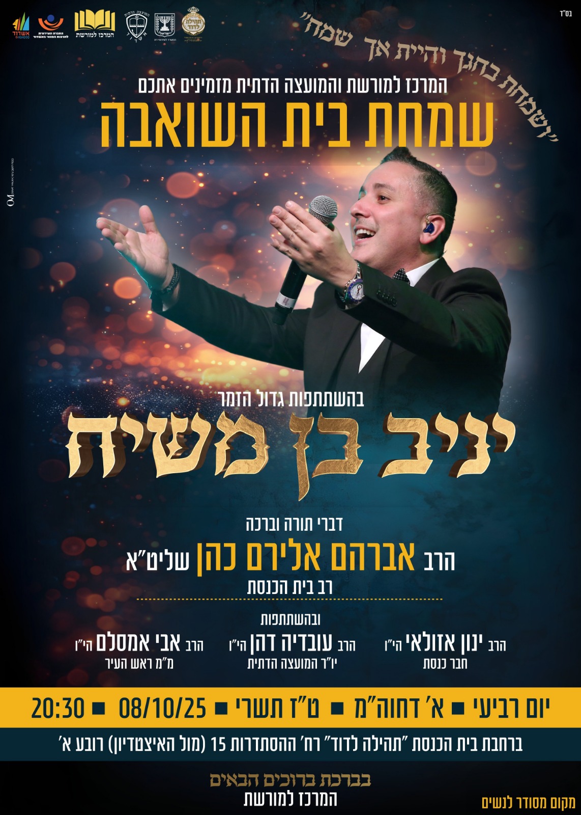 ביום רביעי, א' דחול המועד, ט"ז תשרי, תיערך שמחת בית השואבה המרכזית ע"י 'המרכז למורשת' בשיתוף המועצה הדתית ברחבת בית הכנסת "תהילה לדוד" רח' ההסתדרות 15 ברובע א' (מול האיצטדיון) במעמד רב בית הכנסת הרב אברהם אלירם כהן שליט"א שיישא דברי תורה וברכה, כמו"כ יכבדו בנוכחותם מ"מ ראש העיר הרב אבי אמסלם, חה"כ הרב ינון אזולאי ויו"ר המועצה הדתית הרב עובדיה דהן. את הערב ינעים גדול הזמר המזרחי יניב בן משיח בליווי תזמורת מורחבת עם מיטב הנגנים.