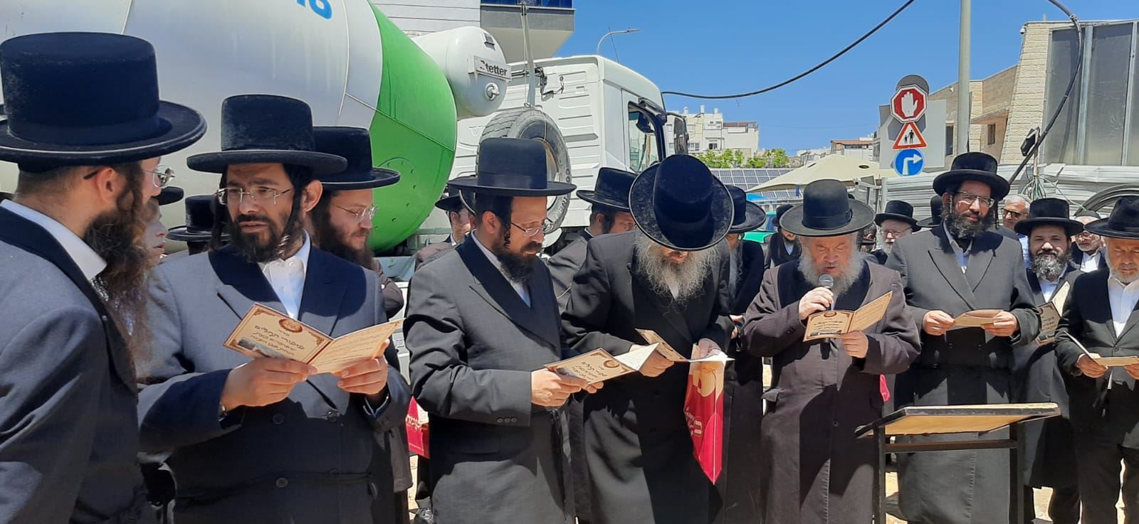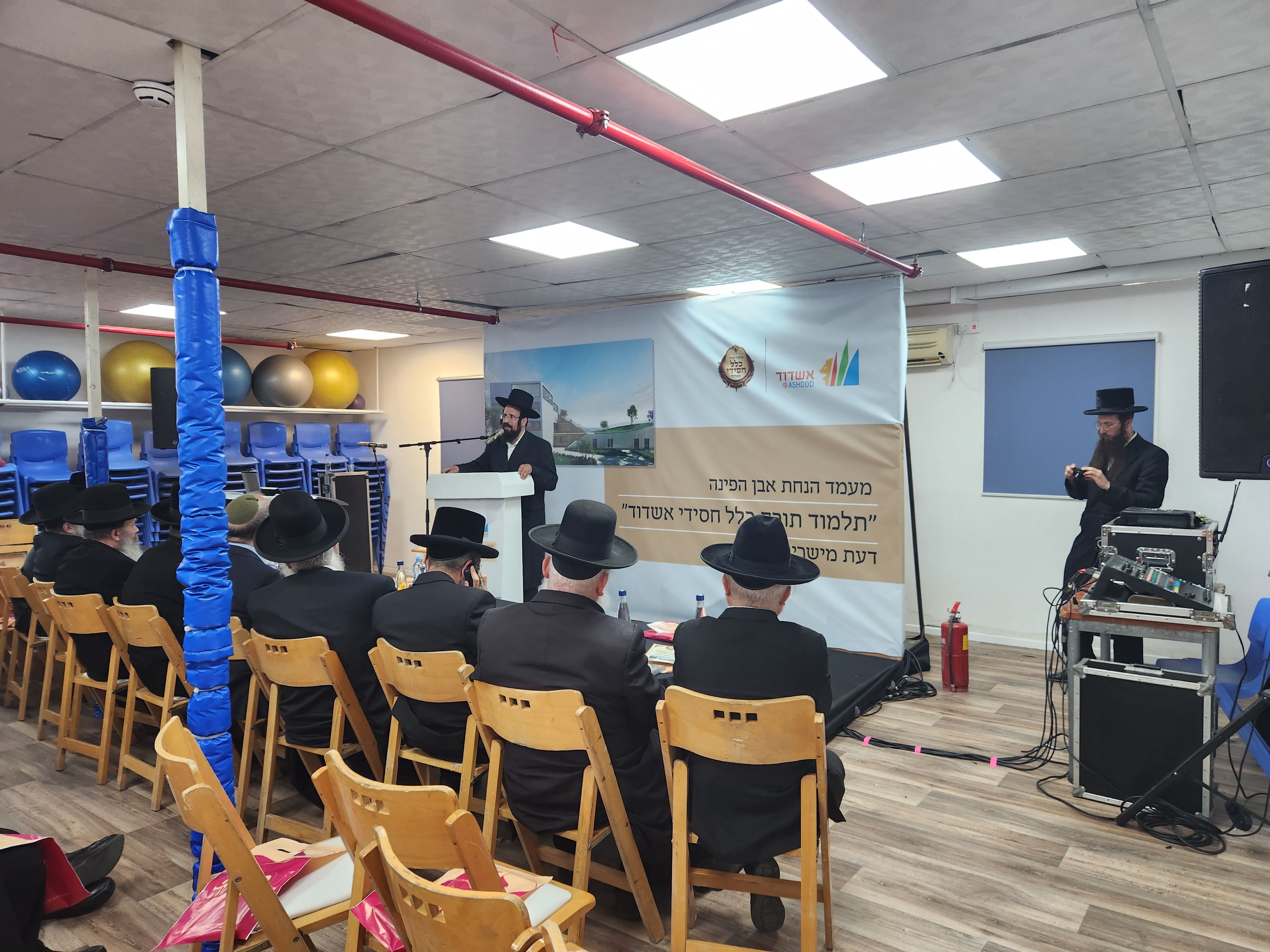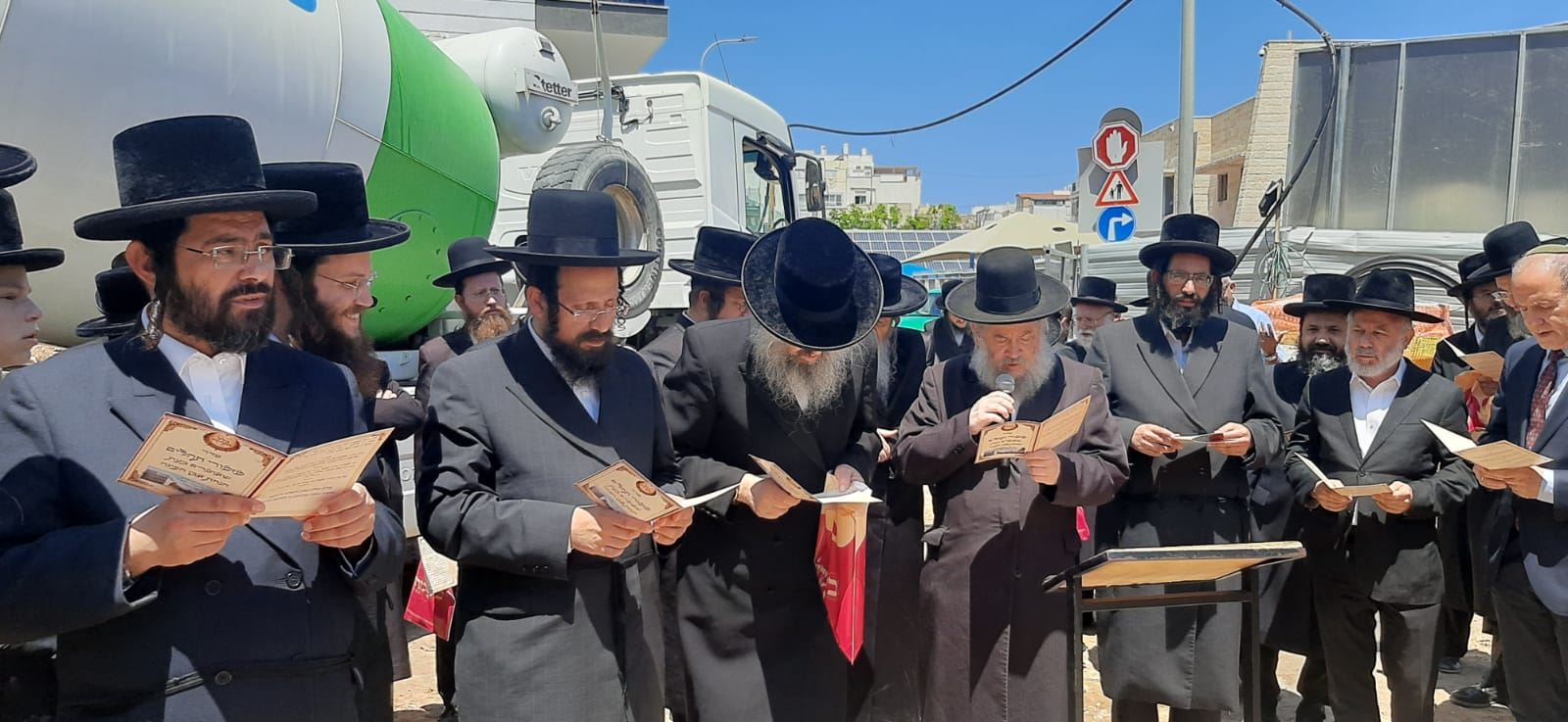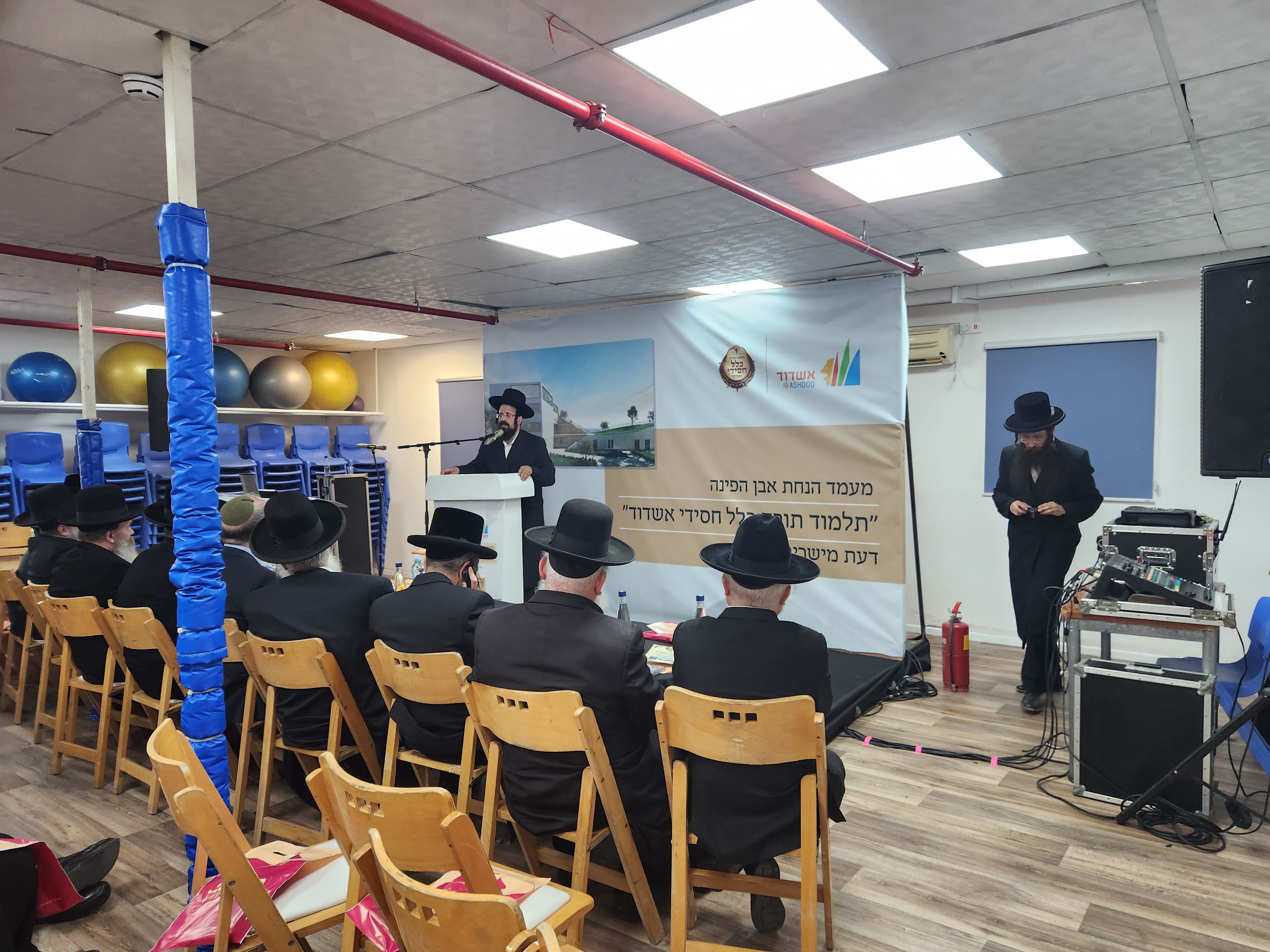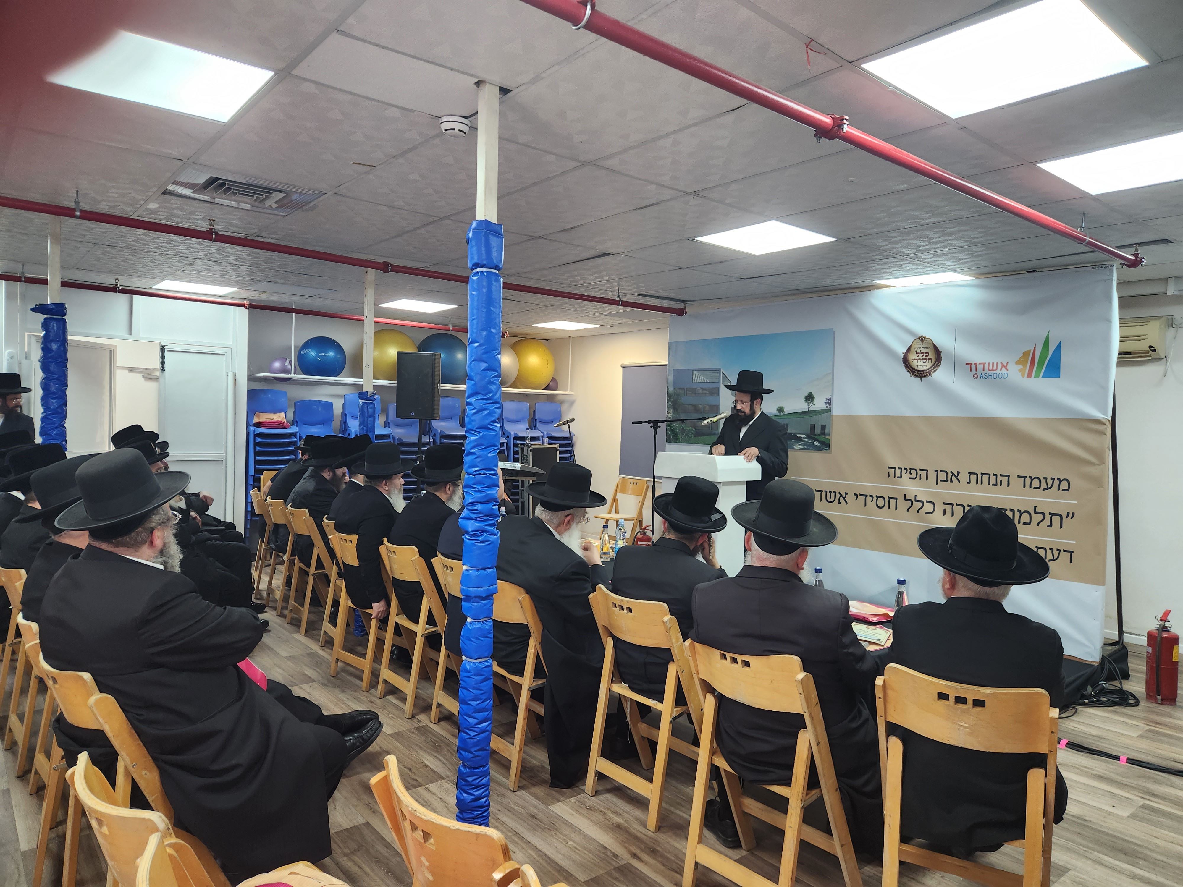 לאחר מכן יצאו המוזמנים למתחם שבו הולך ומוקם הת"ת, שם התקיים מעמד הנחת אבן הפינה כשבהתאם למנהג נאמרו פרקי תהלים בידי מנהל הת"ת הרב גולדמן, רבני הקהילות הרב חרז, הרב פרום והרב ישראלי, וכן השתתף במעמד כ"ק האדמו"ר משומרי אמונים שליט"א. לאחר מכן נוצקה האבן כאשר האורחים מוזמנים בזה אחר זה להניח עליה טיט. בסיום הארוע נישאו הרגליים כמו מאליהם בריקוד של שמחה, לאור המילים שנאמרו אף הן היום בתפילת ההלל: זה היום עשה ה' נגילה ונשמחה בו.