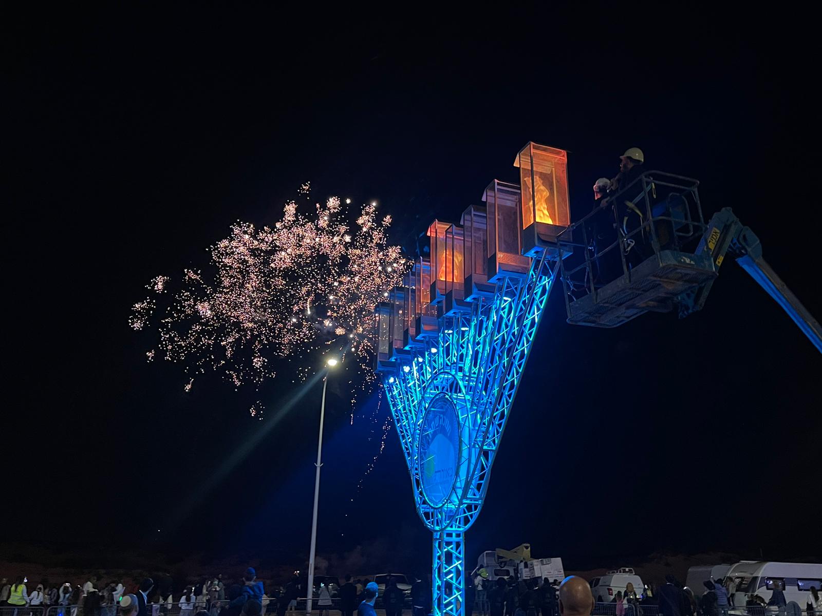 עם מנוף מיוחד שהובא למקום עלו יחד הרב מנחם עמאר עם ראש העיר ד"ר יחיאל לסרי והדליקו את הנר הראשון בברכות כשקהל ההמונים ענו בקול רם "אמן".