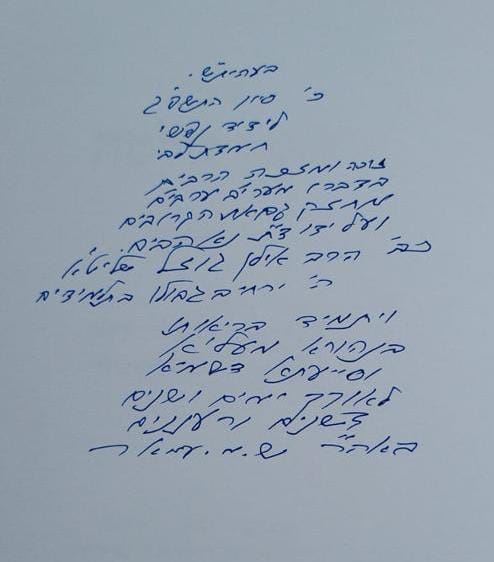 בהקדשה כתב: "לידיד נפשי חמדת לבבי, זוכה ומזכה הרבים בדברים מעריב ערבים, מחזק גם את הקרובים ועל ידו דברי תורה נאהבים, כבוד הרב אילן גוזל שליט"א, ה' ירחיב גבולו בתלמידים ויתמיד בריאותו בנהורא מעליא וסייעתא דשמיא לאורך ימים ושנים דשנים ורעננים. באהבה רבה שלמה משה עמאר. לאחר מכן בירך את כל המשתתפים בשיעורי התורה במרכז לצעירים "ילדי שגיא ויעקב".