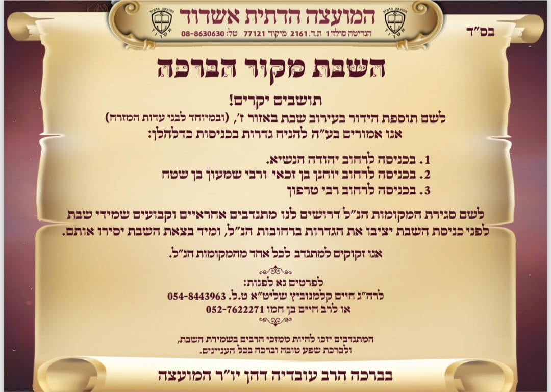 המועצה הדתית פונה לציבור במציאת מתנדבים קבועים שיהיו אחראים על הצבת והסרת הגדרות בכל שבת.