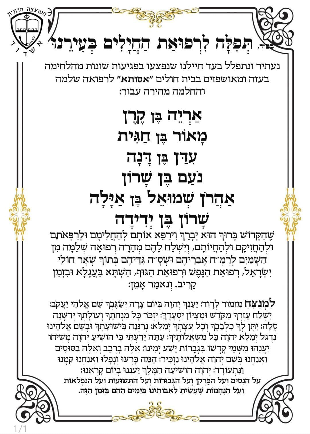 $(function(){ScheduleRotate([[function() {setImageBanner('a1d5a6e5-359a-44d3-803f-b2bf63f1391d','/dyncontent/2025/12/10/958d8cbf-4b13-4015-b34d-b241d2b15b7b.jpg',19091,'סטארטאפיסטים? זו ההזדמנות שלכם!',510,80,true,50858,'Image','');},15],[function() {setImageBanner('a1d5a6e5-359a-44d3-803f-b2bf63f1391d','/dyncontent/2025/12/14/495c8feb-fa31-4a7b-aeda-7f8c71605a23.jpg',20552,'עושים חשבון. פועלים',510,80,true,50858,'Image','');},15],[function() {setImageBanner('a1d5a6e5-359a-44d3-803f-b2bf63f1391d','/dyncontent/2025/12/10/b56ee83e-306e-49d6-a0b5-17e54d1247ed.jpg',18989,'נוסעים בביטחה. אפיקים',510,80,true,50858,'Image','');},15]]);}) בשעה היעודה התאספו רבים בקומת הכניסה לבית החולים, הרב גודמן קידם בברכה את הרב עובדיה דהן יו"ר המועצה הדתית שהוזמן להדלקת הנר השישי והסביר את מהותה של מצות הדלקת נר החנוכה. הרב דהן קידם בברכה את המשתתפים וקודם שהדליק אמר, בהדלקת נרות החנוכה כולנו נושאים תפילה להחלמת החיילים הפצועים כאן בבית החולים ובכל מקום שהם, שיצליחו בכל מעשי ידיהם ויזכו לעטרת ישועה וכתר ניצחון, עלינו לזכור ולהתפלל בכל עת עבור החטופים השבויים שישובו לביתם במהרה. הרב דהן בירך והדליק את נרות החנוכה ואחר כך שר עם המשתתפים "מעוז צור ישעתי" ובירך את כל החולים בבית החולים שיזכו לרפואה שלמה במהרה וברכת חג חנוכה שמח. לאחר מכן פצחו במעגל ריקוד שהלך והתרחב כשאליו מצטרפים מתנדבים, כך הפיצו שמחה ותקוה בקרב החולים ובני משפחותיהם. בטרם צאתו, נגשו אימהות של חיילים המאושפזים וסיפרו לרב דהן על ניסים ונפלאות שעברו ילדיהם מאז שנפצעו בעזה, ובקשו בכל לשון להמשיך ולהרבות בתפילות כי אנו רואים ממש שהתפילות עוזרים. הרב דהן הפתיע את האימהות כשהוציא מכיסו דף של ברכות עם פרקי תהילים מיוחד עבור חיילי צה"ל שנפצעו ובו מוזכרים שמותיהם של בניהם החיילים ואמר שכל יום אנו מזכירים אותם לרפאה שלמה בשיעור תורה ובאמירת פרקי תהילים לזכותם. האימהות ובני המשפחות הודו נרגשות לרב דהן והביעו תקוה שנזכה לניסים ונפלאות כולנו בזכות חג החנוכה.