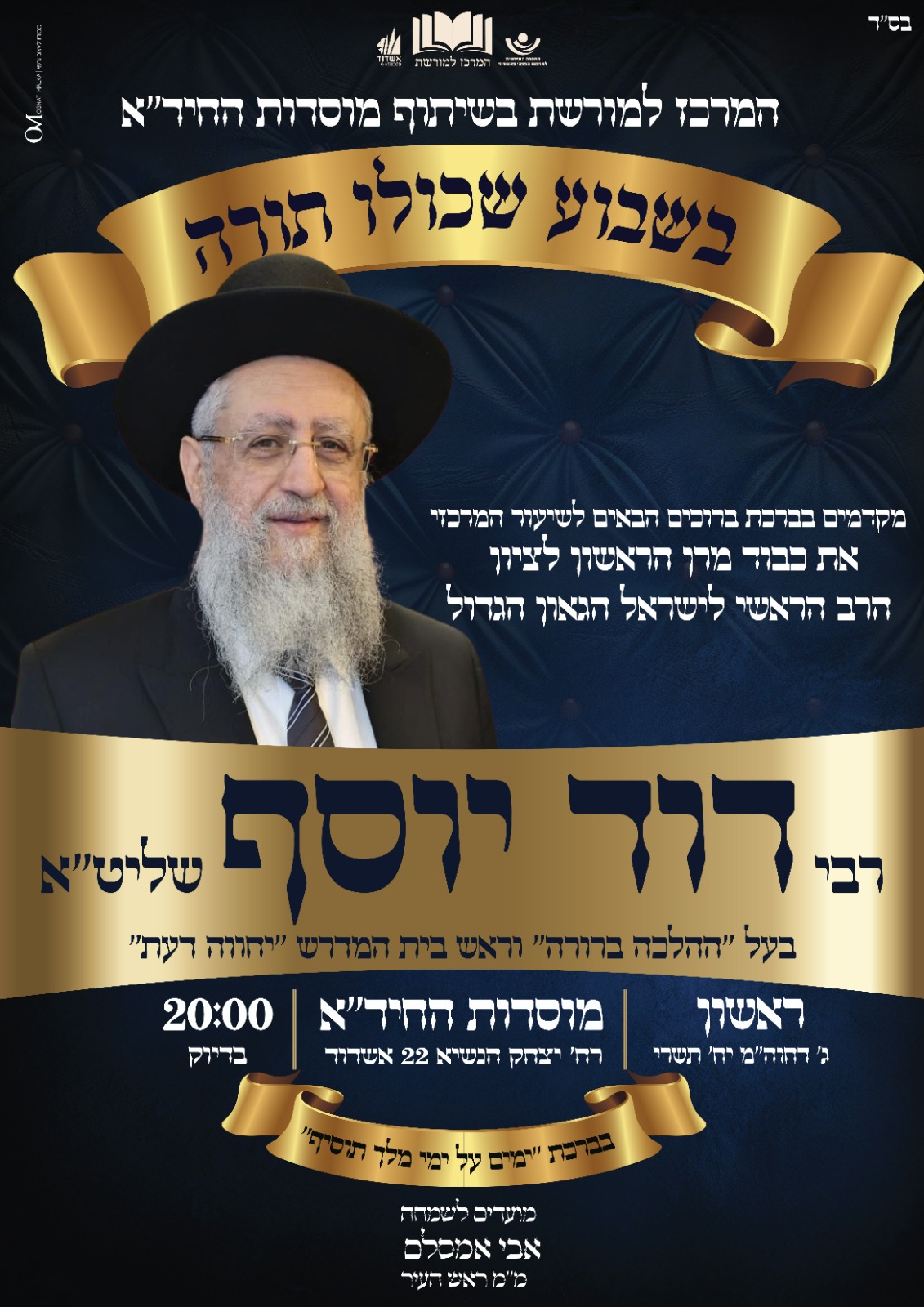 מעמדים אדירים לכבודה של תורה: התרגשות עצומה בקרב בני התורה ושדרות הציבור התורני בעיר אשדוד לקראת המעמדים העוצמתיים של שיעורי התורה והקבלת פני רבו שייערכו ביום ראשון הקרוב במעמד הגאון הגדול, מורינו ורבינו, הראשל"צ מרן רבי יצחק יוסף שליט"א בעל ה'ילקוט יוסף' ובמעמד הגאון הגדול, מורינו ורבינו, הראשל"צ והרב הראשי לישראל מרן רבי דוד יוסף שליט"א בעל ה'הלכה ברורה'. השיעור והקבלת פני רבו של מו"ר כבוד מרן הראשל"צ הגר"י יוסף שליט"א יתקיים ביום ראשון, ג' דחוה"מס בשעה 19:00 בבית המדרש המרכזי בעלזא ברח' חטיבת הנגב ברובע ג' בהשתתפות מאות בני תורה מכל גווני הקשת החרדית, והוא נערך ביוזמת "המרכז למורשת" בראשות מ"מ ראש העיר, שלוחא דרבנן, ר' אבי אמסלם הי"ו. השיעור והקבלת פני רבו של מו"ר כבוד מרן הראשל"צ והרב הראשי לישראל הגר"ד יוסף שליט"א בעל ה"הלכה ברורה" ייערך ביום ראשון ג' דחוה"מס במוסדות החיד"א, רח' יצחק הנשיא 22, בשעה 20:00, ע"י "המרכז למורשת" ובשיתוף "מוסדות החיד"א", במסגרת שבוע שכולו תורה המתקיים מידי חול מועד.
