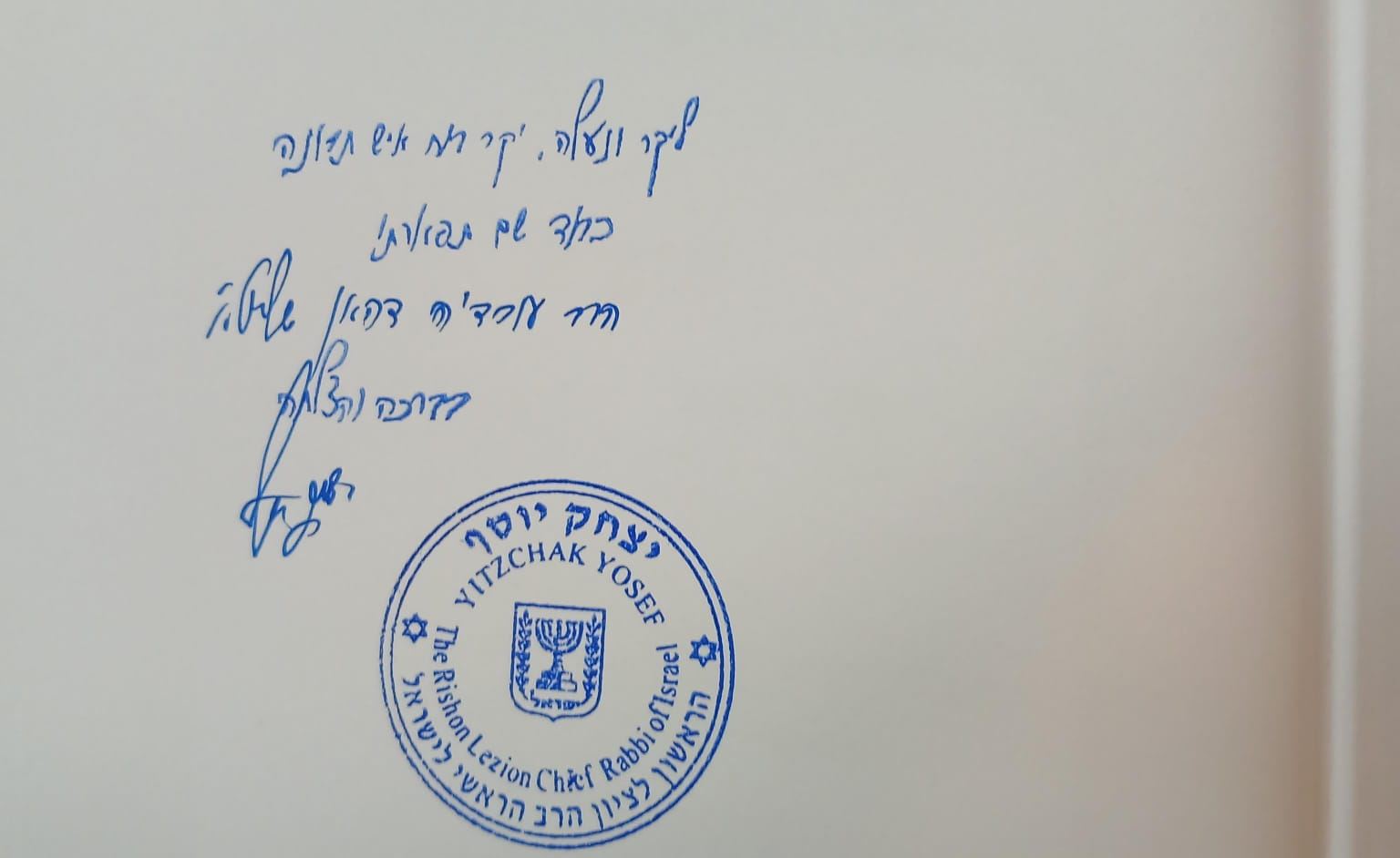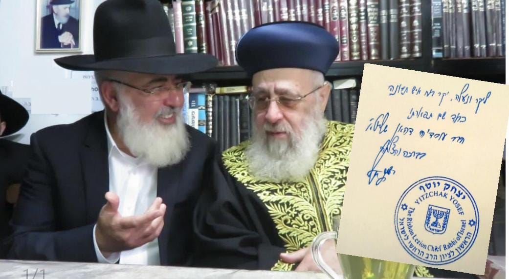 בצל הלחימהבדרום שיגר הראשל"צ הרב יצחק יוסף שליט"א ספר עם הקדשה אישית ליו"ר המועה"ד בו ביטא את הערכתו בעיקר על הפעילות בימים אלו