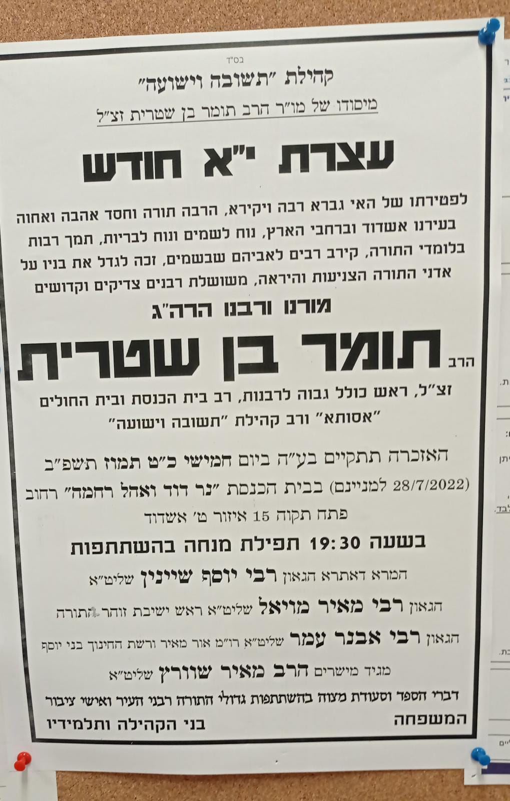 י"א חודש והכאב עדיין צורב: במלואת י"א חודש לפטירתו של מזכה הרבים הרה תומר בן שטרית זצ"ל, רב בית הכנסת 'אסותא אשדוד' שנפטר ממחלת הקורונה ביום ראש השנה האחרון, תיערך עצרת מספד לעילוי נשמתו בביה"כ 'נר דוד ואוהל רוחמה' ברובע ט' אשדוד.