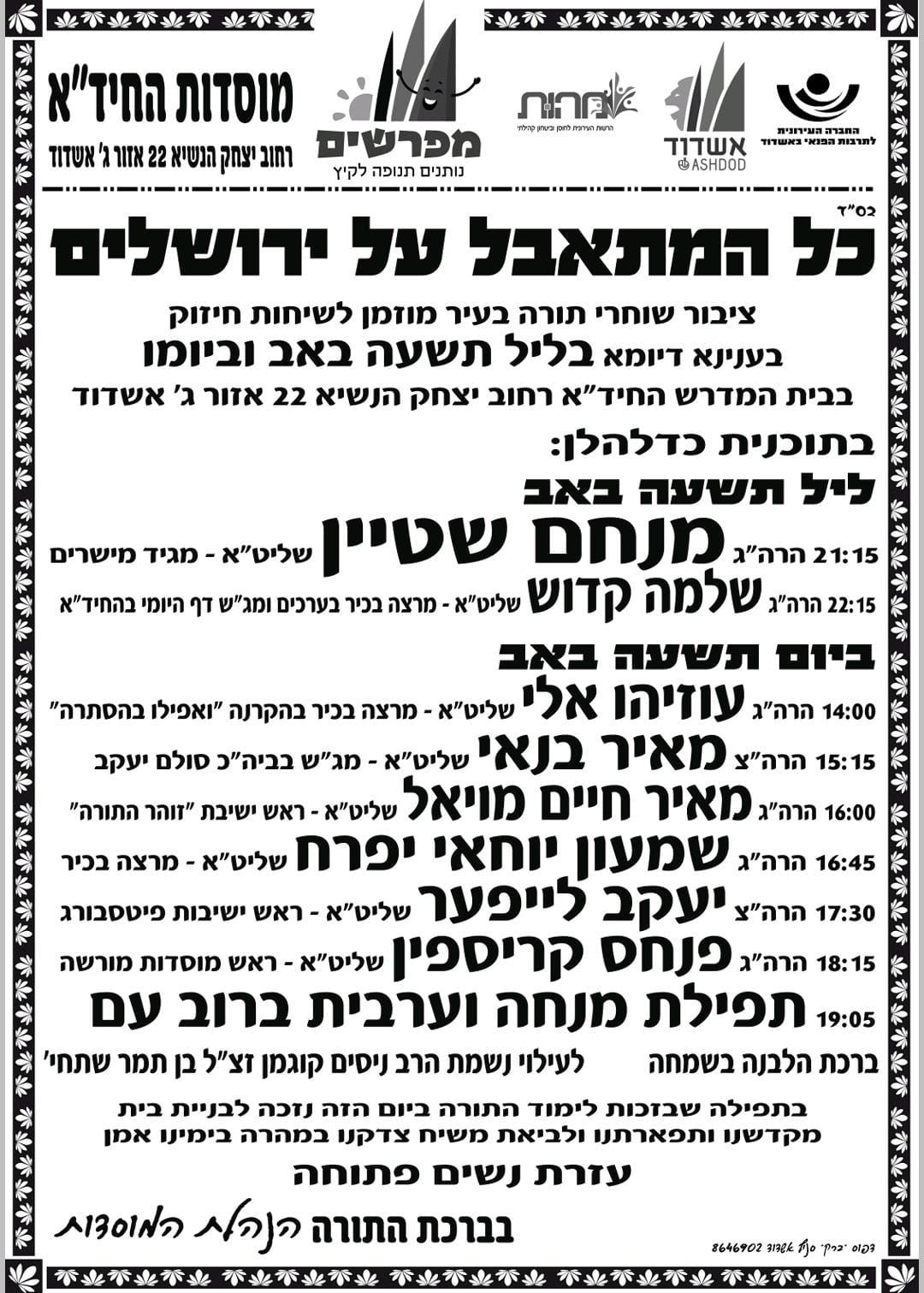 למחרת ביום תשעה באב לאחר חצות היום בשעה 14:00, יחלו סדרת שיעורים בזה אחר זה עד תפילת מנחה כמופיע במודעות שפורסמו בשבוע האחרון. הציבור הרחב מודה למארגני מפרשים שיזמו את שיעורי ההתעוררות בשבוע האחרון ברחבי העיר לחיזוק ימים אלו.