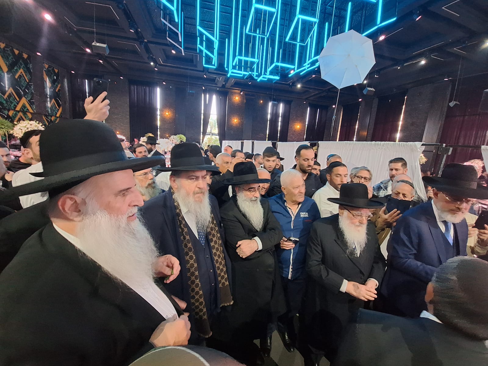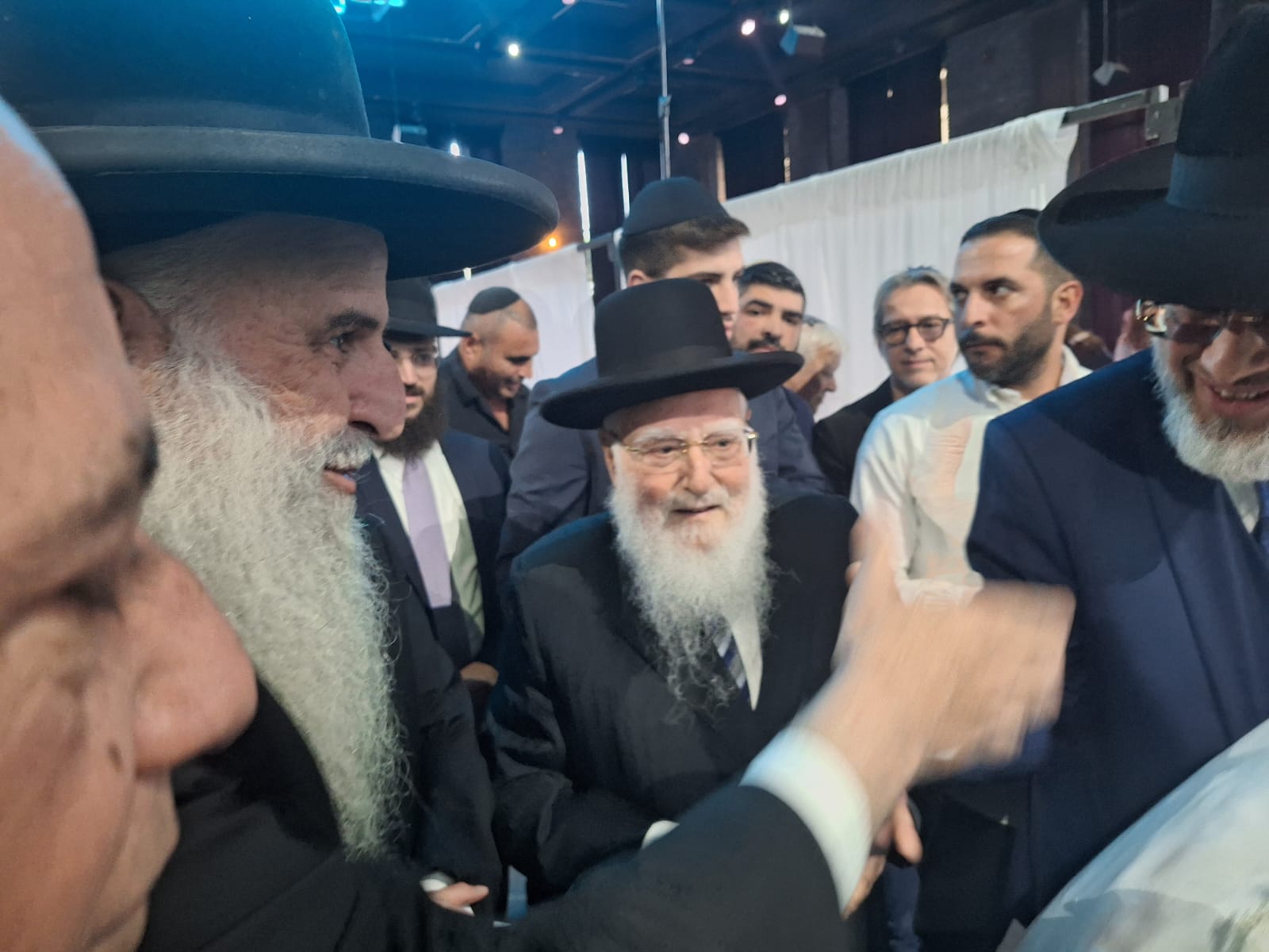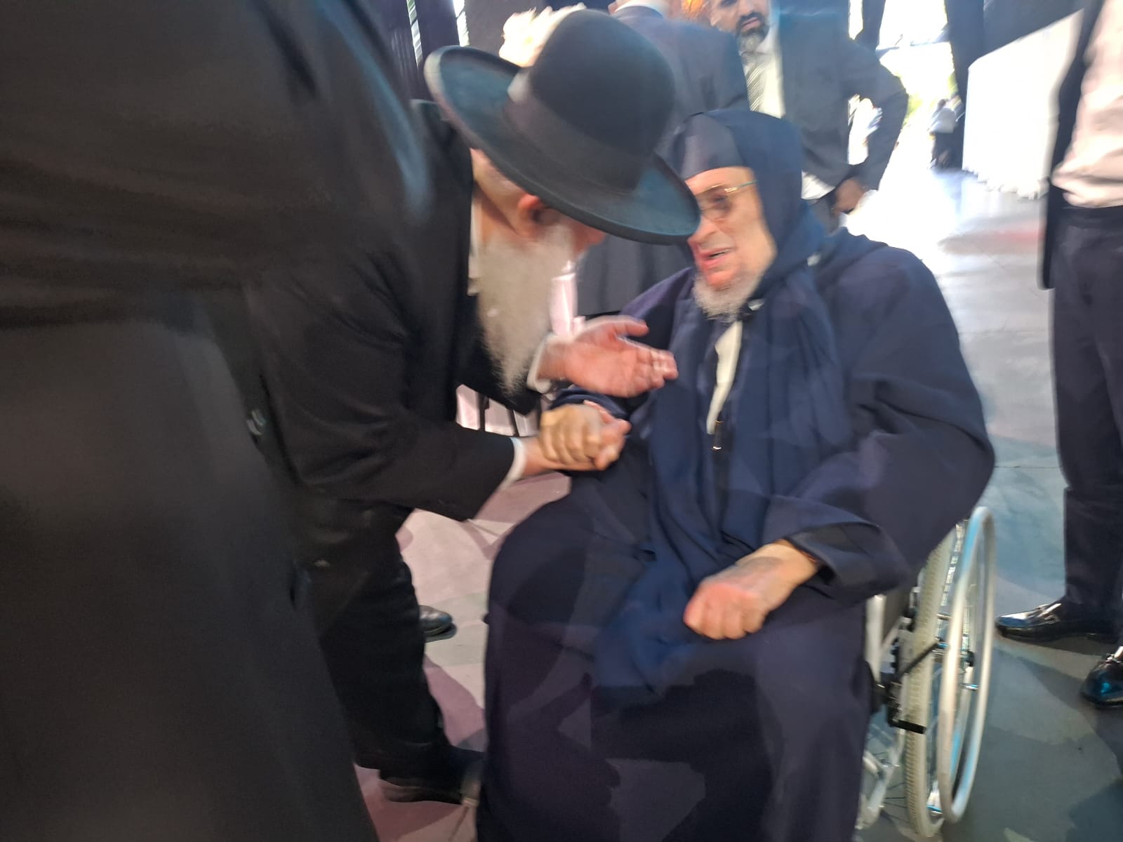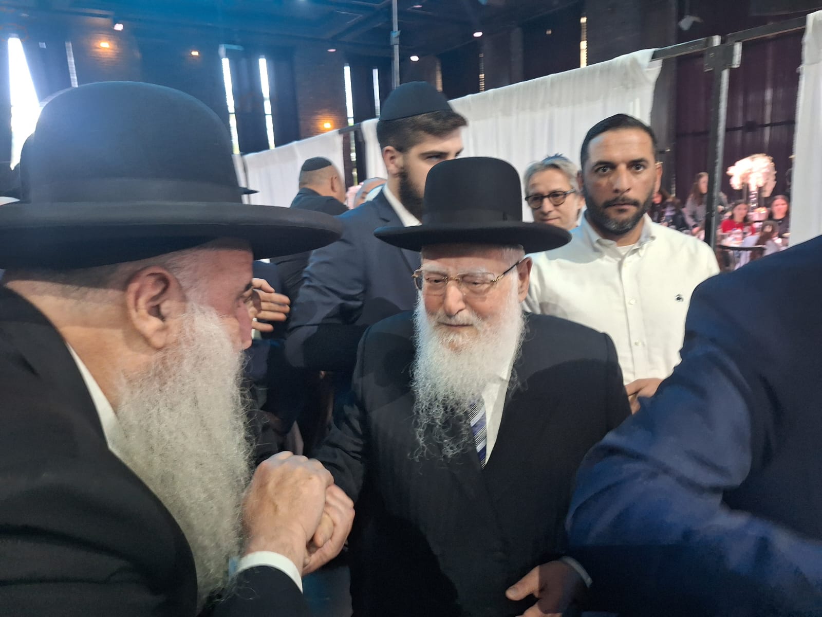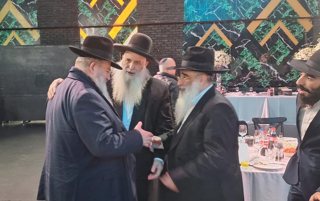 מיד אחר כך, קהל האורחים ניגשו לעבור לברך ולהתברך מהאדמור"ים שליט"א הבבא ברוך והמרא דאתרא הגר"ח פינטו.