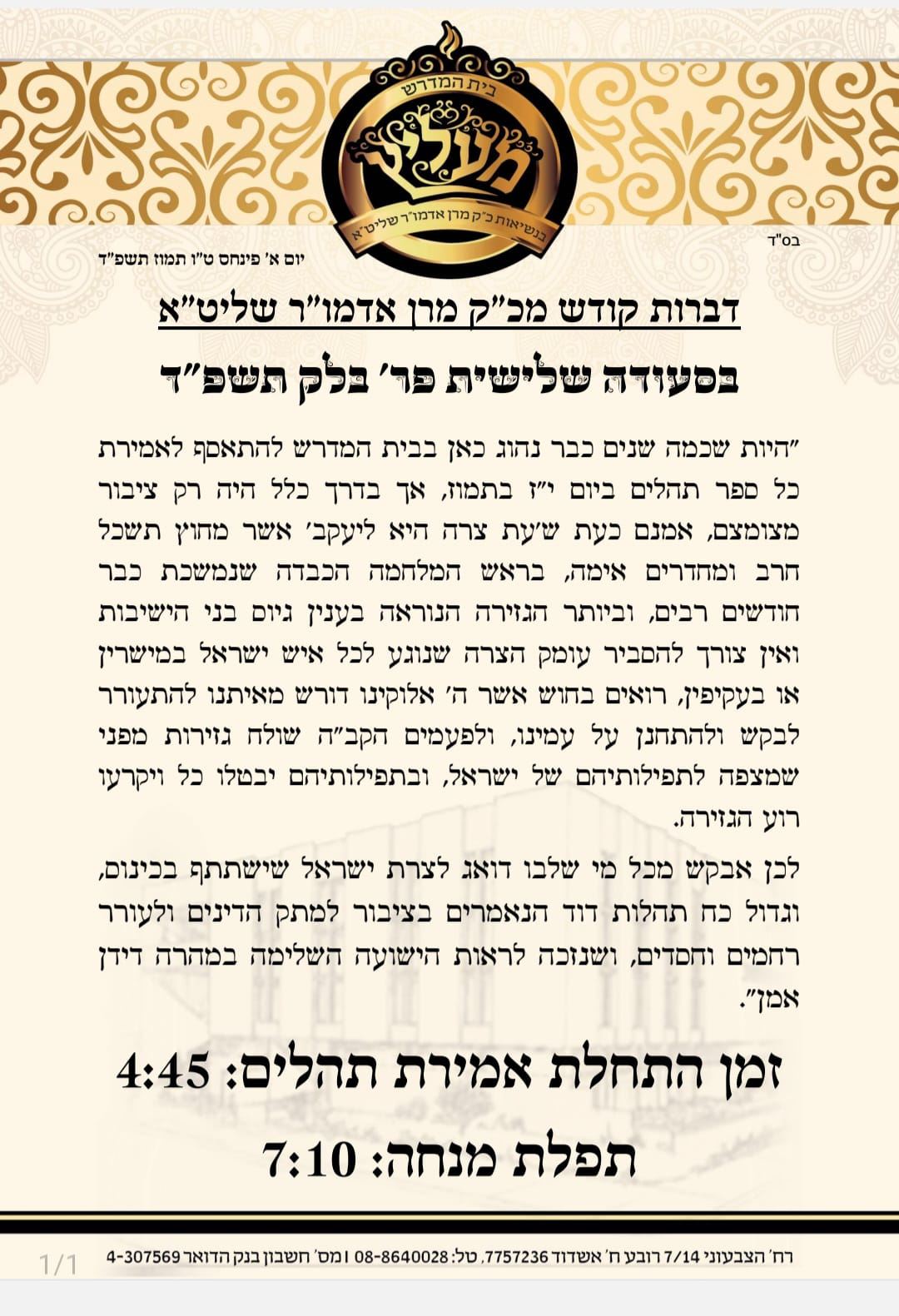 "היות שכמה שנים כבר נהוג כאן בבית המדרש להתאסף לאמירת כל ספר תהלים ביום י"ז בתמוז, אך בדרך כלל היה רק ציבור מצומצם, אמנם כעת ש'עת צרה היא ליעקב' אשר מחוץ תשכל חרב ומחדרים אימה, בראש המלחמה הכבדה שנמשכת כבר חודשים רבים, וביותר הגזירה הנוראה בענין גיוס בני הישיבות ואין צורך להסביר עומק הצרה שנוגע לכל איש ישראל במישרין או בעקיפין, רואים בחוש אשר ה' אלוקינו דורש מאיתנו להתעורר לבקש ולהתחנן על עמינו, ולפעמים הקב"ה שולח גזירות מפני שמצפה לתפילותיהם של ישראל, ובתפילותיהם יבטלו כל ויקרעו רוע הגזירה.