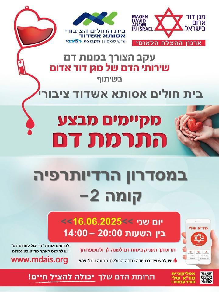 תנו את הדם: עקב חוסר במנות דם, מד"א פותח אתר התרמה בבית החולים 'אסותא' במטרה לגייס כמה שיותר מנות דם, מכל הסוגים.