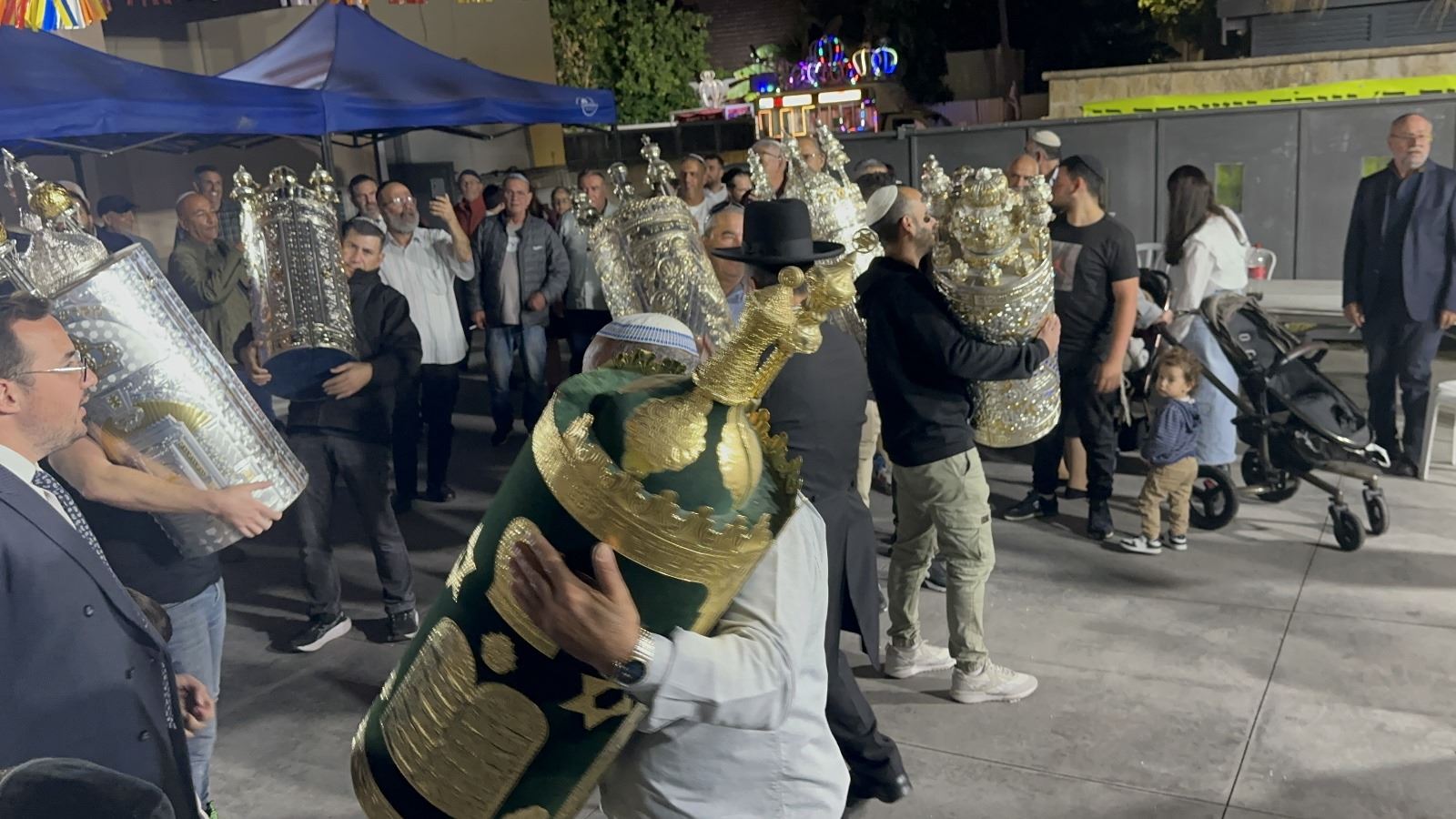 עם הגעתם לאולם שע"י בית הכנסת "כולל תורה וחסד", יצאו המתפללים לקדם את פניהם עם ספרי תורה בידיהם ופתחו בריקודים ומעגלים. לאחר קבלת עול מלכות שמים ולאחר אמירת מזמור לדוד וימלוך ד' כנהוג, הובא ספר התורה לאולם, שם הונח אחר כבוד מיוחד, ברוב שמחה והתרגשות.