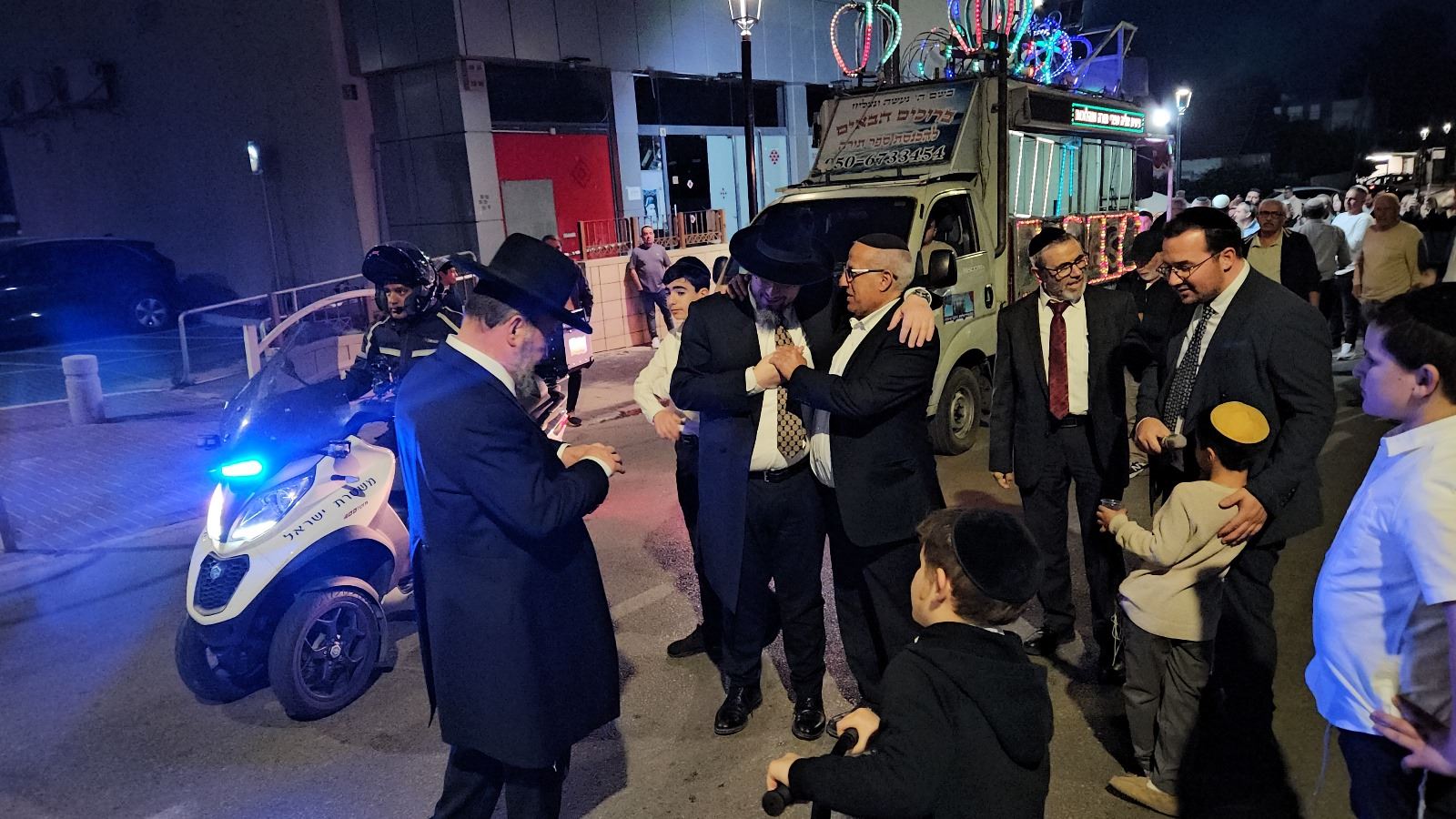 משם יצאו בשירה ובריקודים לתהלוכה שאותה ליווה רכב תפאורה שהשמיע כל העת שירים שמחים לכבודה של תורה, כשרבים רוקדים עם ספר התורה תחת אפריון מואר בשלל מנורות צבעוניות, עוברי אורח ושכנים רבים יצאו לחלונות ביתם לקול צלילי השירה והריקודים והשתתפו אף הם בשמחה כשהם מוחאים כף ומשליכים סוכריות על ראשי החוגגים, כך גם רכבים עצרו בצד התנועה, יצאו מרכבם והניחו את ידם על ראשם ונגשו ברטט לנשק את ספר התורה בהתרגשות מיוחדת, תוך כדי בקשה לברכה והצלחה ונסחפו למעגלי הרוקדים להשתתף בשמחה הגדולה של הכנסת ספר תורה לקול צלילי השירים.