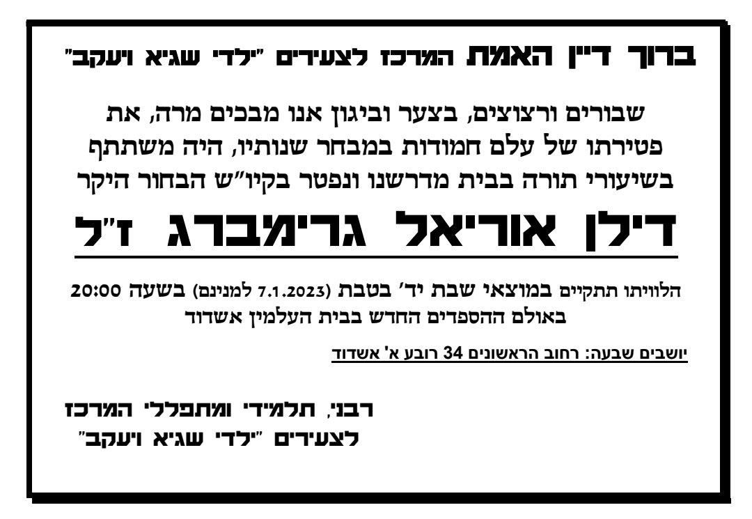 המונים רווי צער ויגון ביכו את האבדה כשליוו למנוחות את פטירתו של עלם חמודות במבחר שנותיו, הבחור היקר דילן אוריאל גרימברג ז"ל שנפטר באופן פתאומי במקסיקו בעת טיול והיה מבאי בית המדרש המרכז לצעירים "ילדי שגיא ויעקב" כשהוא בן 23 שנים בלבד.
