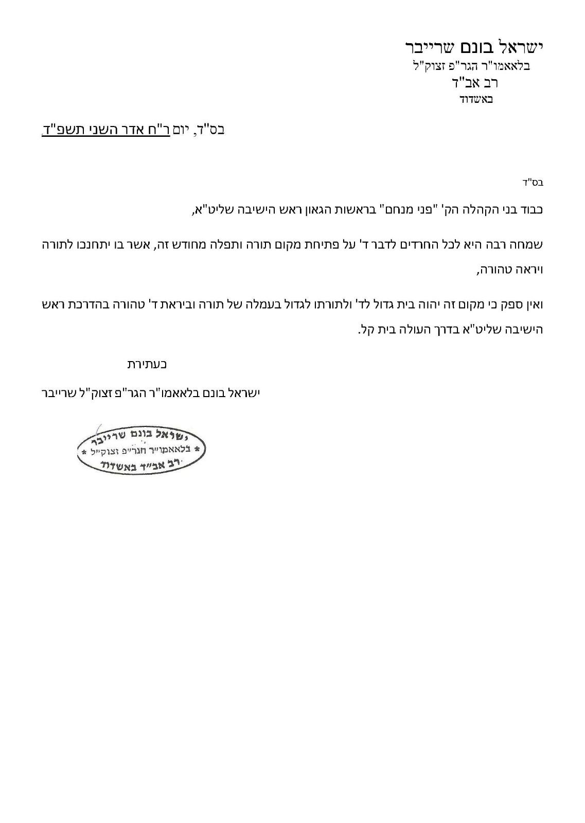 אחר נשא דברים הרה"ג רבי יחיאל צוקר שליט"א, שהקריא את מכתבו של הגרי"ב שרייבר שליט"א, שנבצר ממנו להשתתף במעמד בשל חתונת תלמידו. במכתבו כתב הגרי"ב לבני הקהילה "שמחה רבה היא לכל החרדים לדבר ה' על פתיחת מקום תורה ותפילה מחודש זה" ובירך כי "אין ספק כי מקום זה יהווה בית גדול לה' ולתודתו לגדול בעמלה של תורה וביראת ה' טהורה בהדרכת ראש הישיבה שליט"א בדרך העולה בית קל". בהמשך עמד על התופעה המופלאה המלווה את קהילת פני מנחם באשדוד בפרט ואת תורתו הבהירה של ראש הישיבה בכלל, שמאות אלפים מכל רחבי העולם נכספים כיום לאור תורתו וכמהים לדבריו.