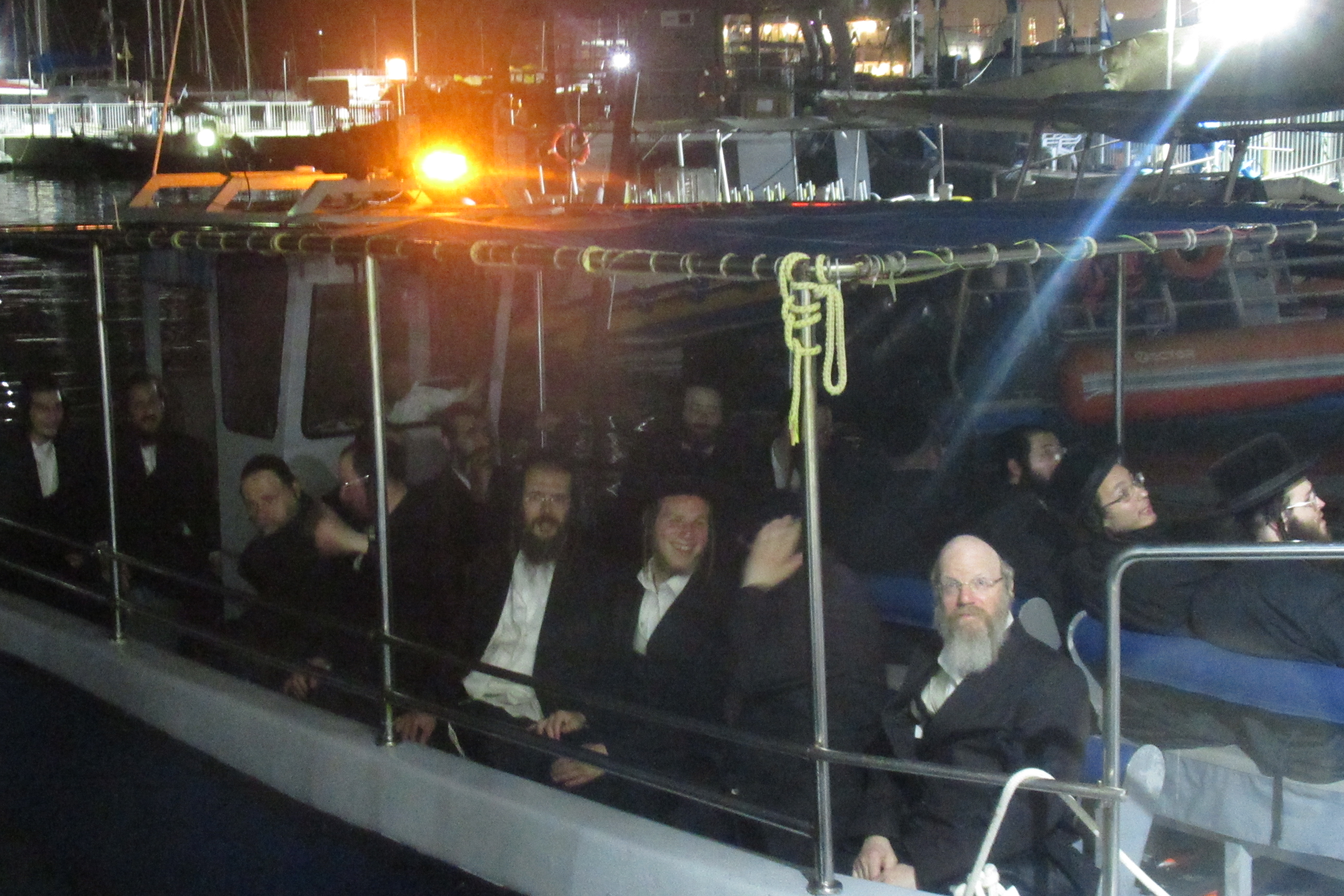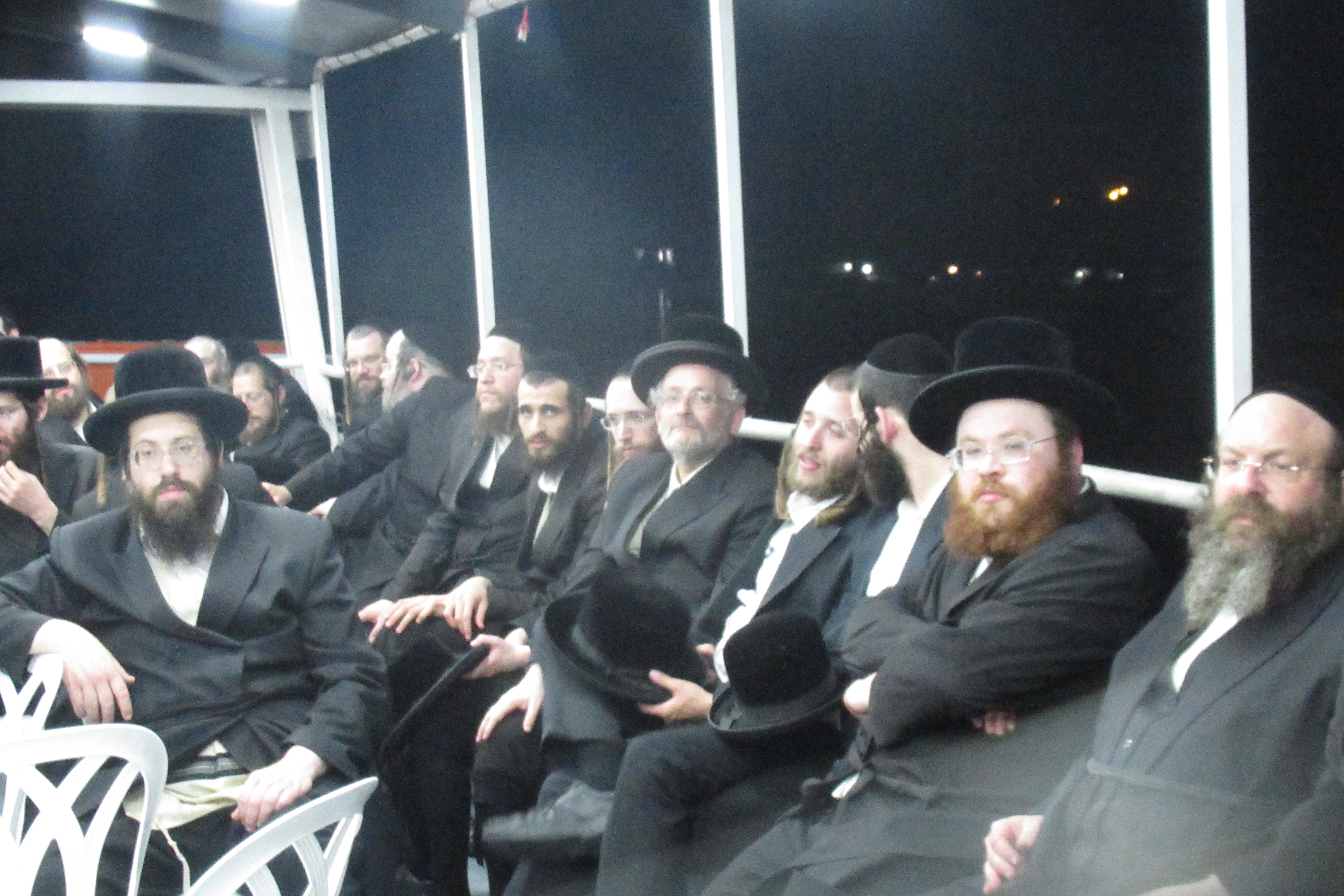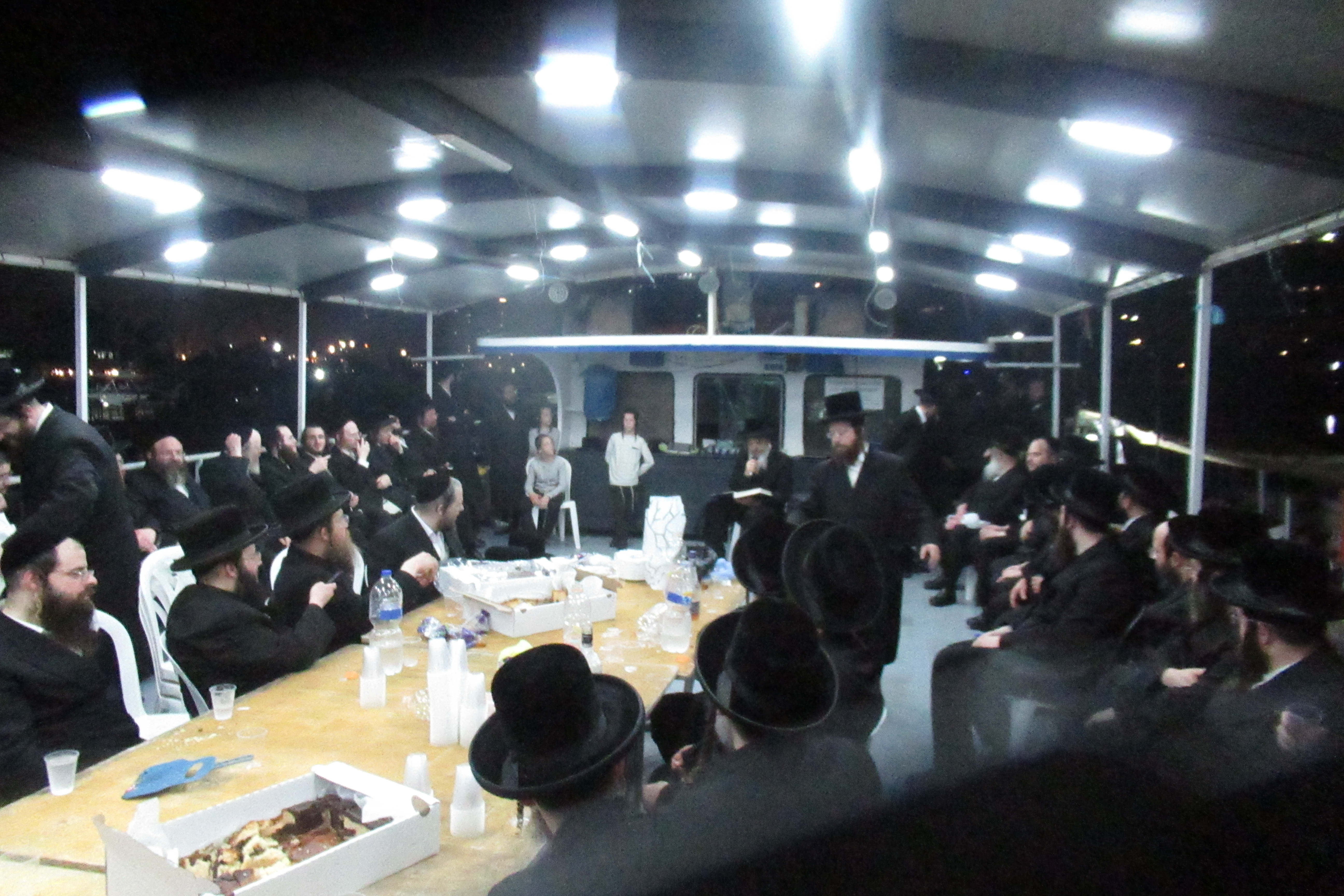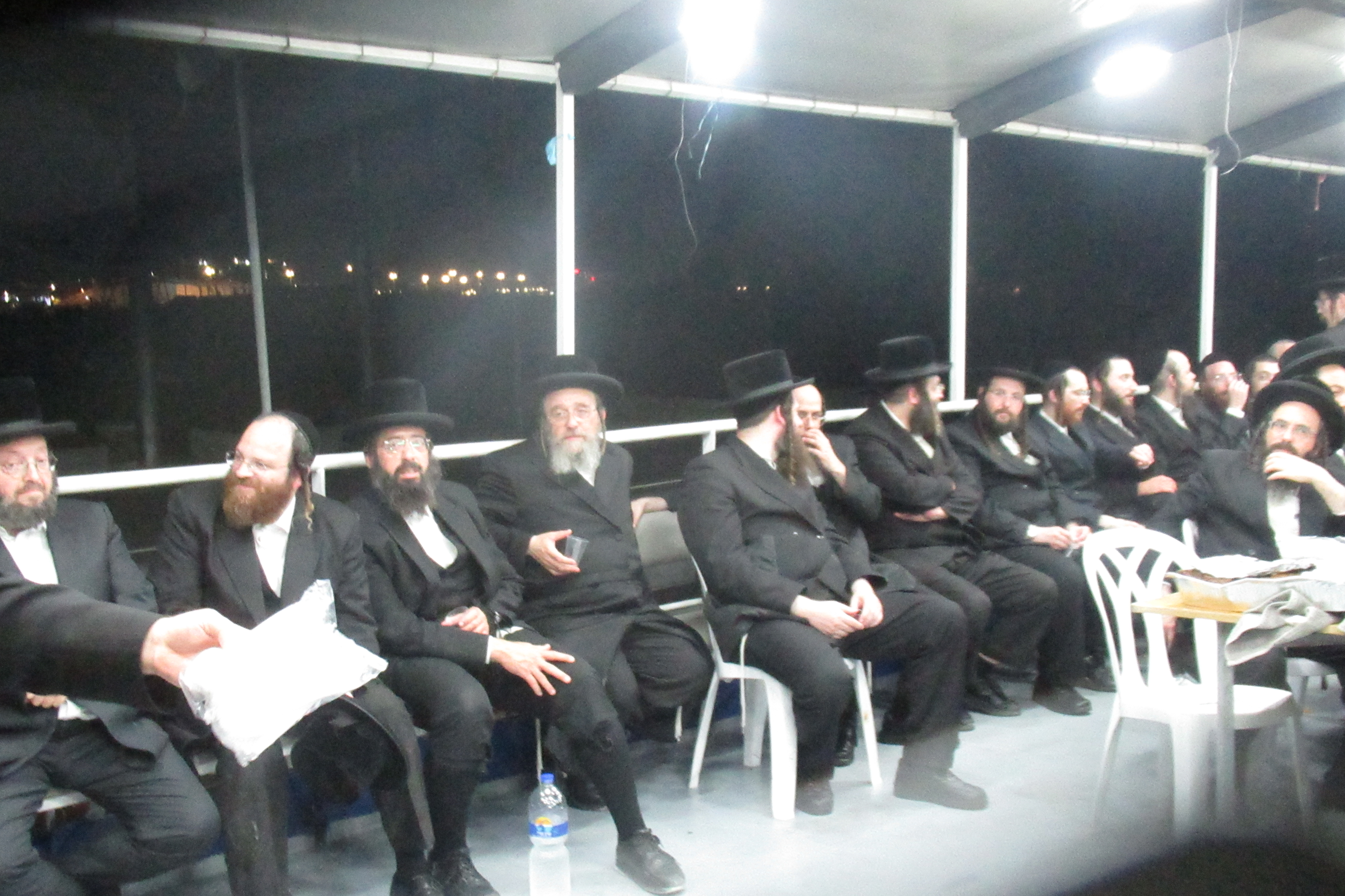 מתפללי בית המדרש דחסידי בעלזא 'בית פנחס' ברובע ז' חגגו אמש סיום מסכת 'בבא מציעא' על יאכטה במרינה בראשות הדומ"צ הגרי"צ רכניצר