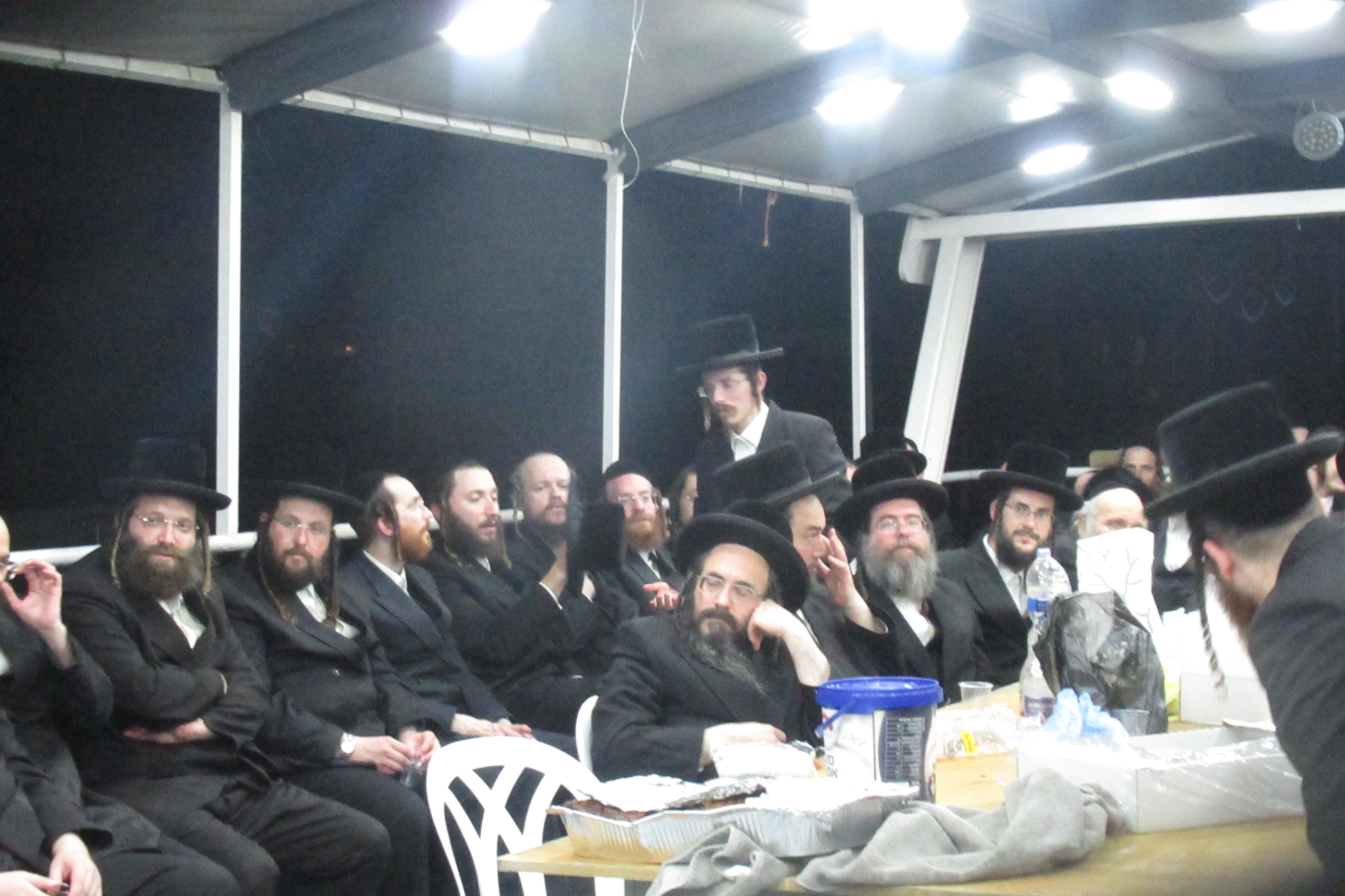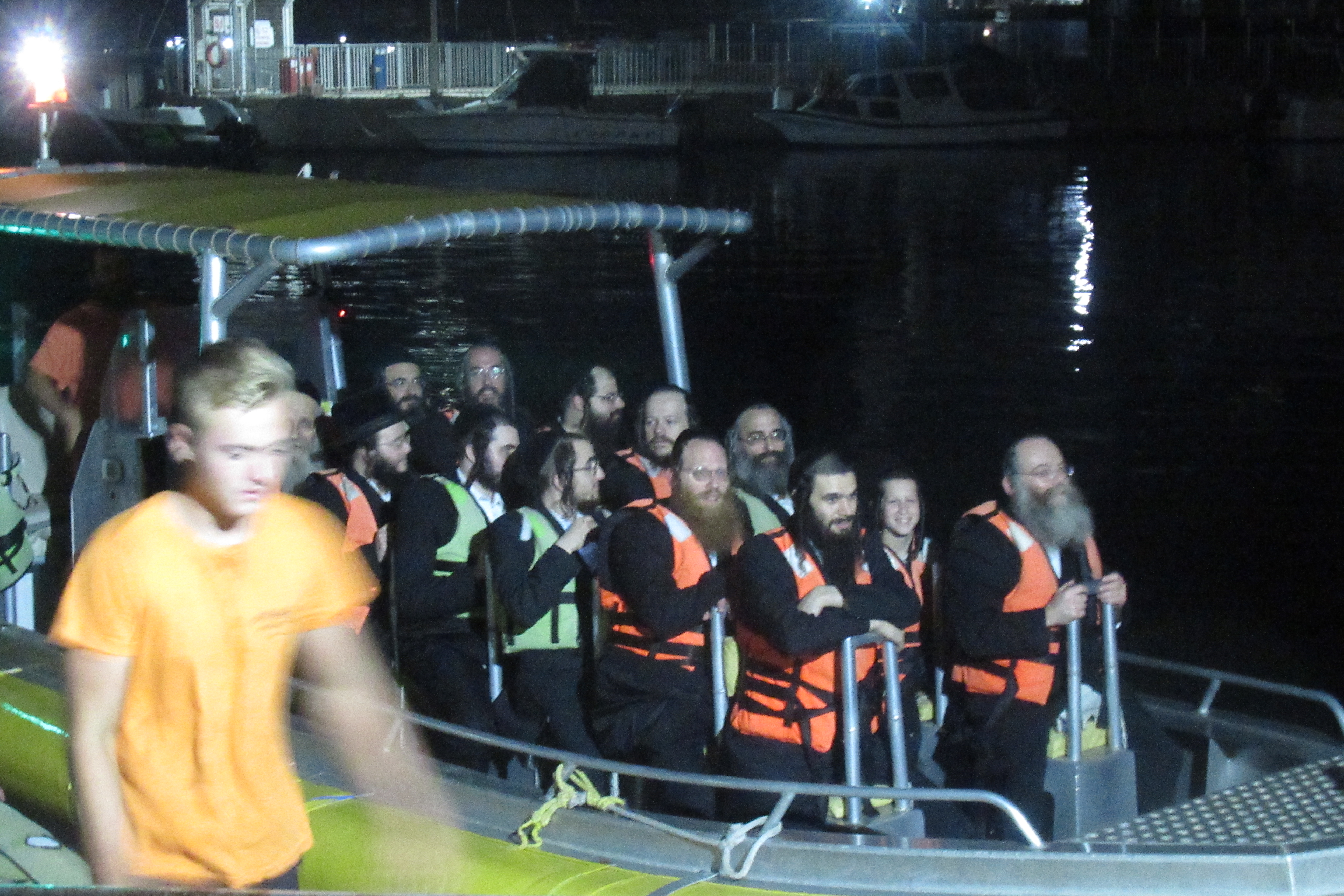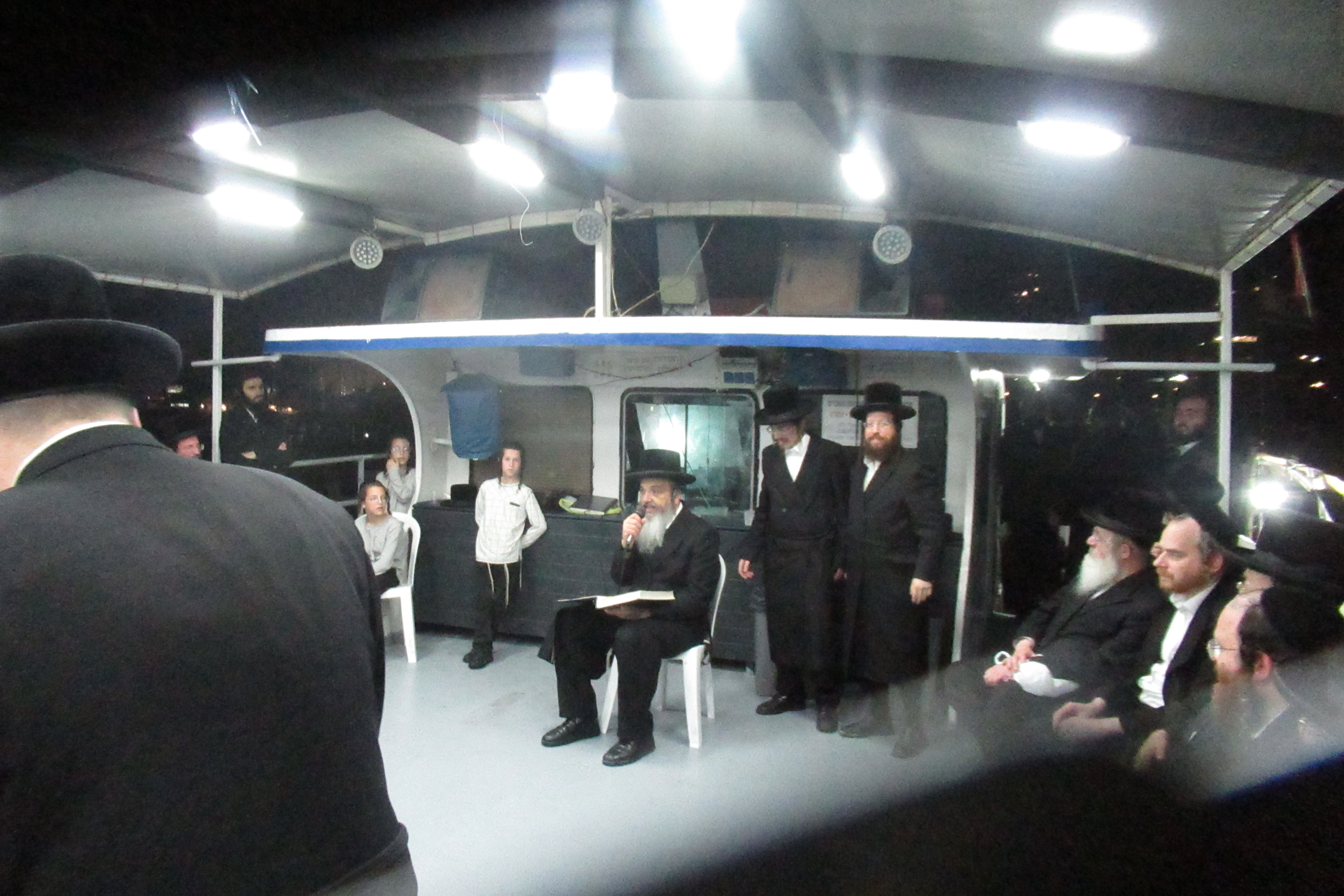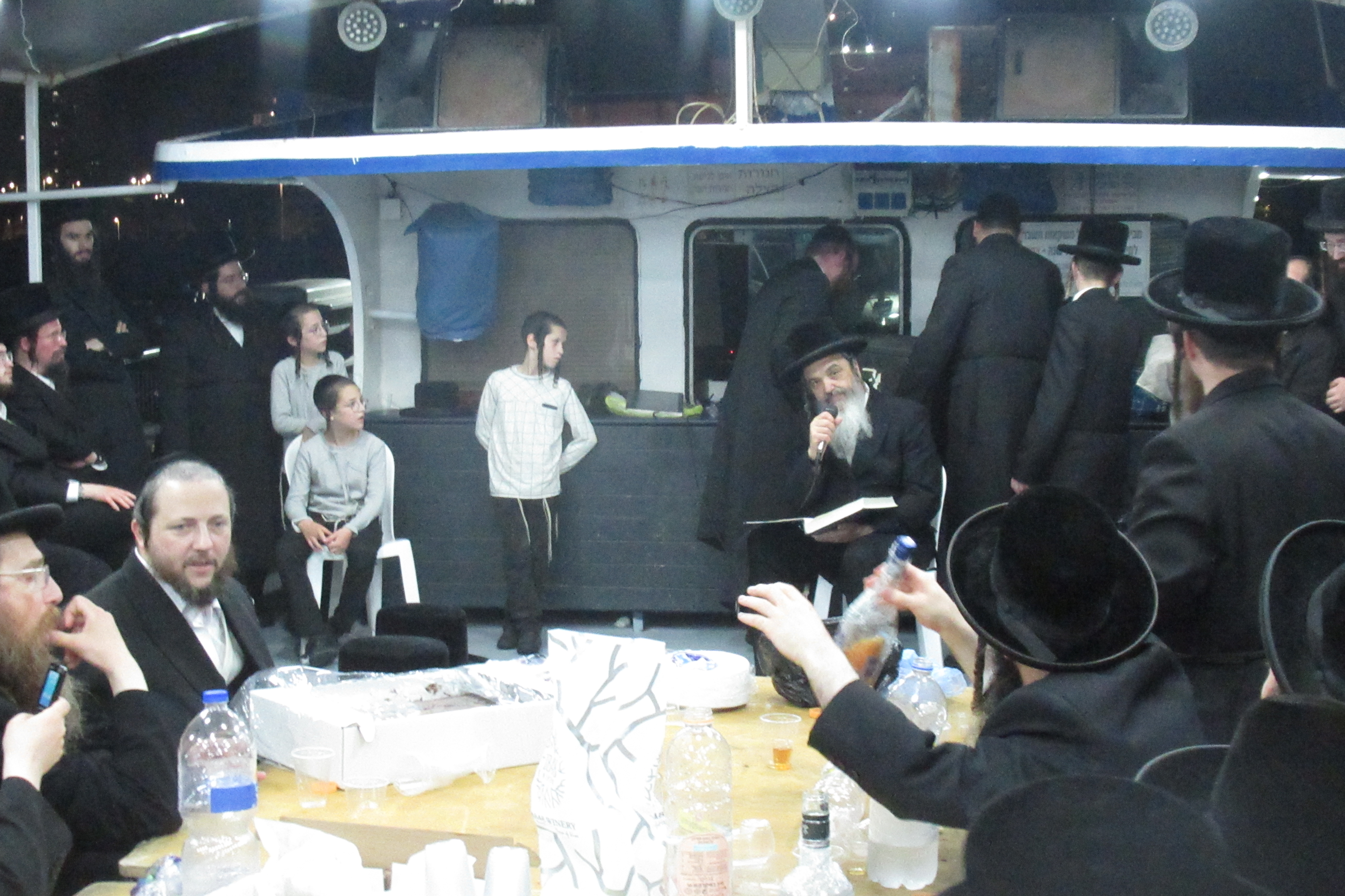מתפללי בית המדרש דחסידי בעלזא 'בית פנחס' ברובע ז' חגגו אמש סיום מסכת 'בבא מציעא' על יאכטה במרינה בראשות הדומ"צ הגרי"צ רכניצר