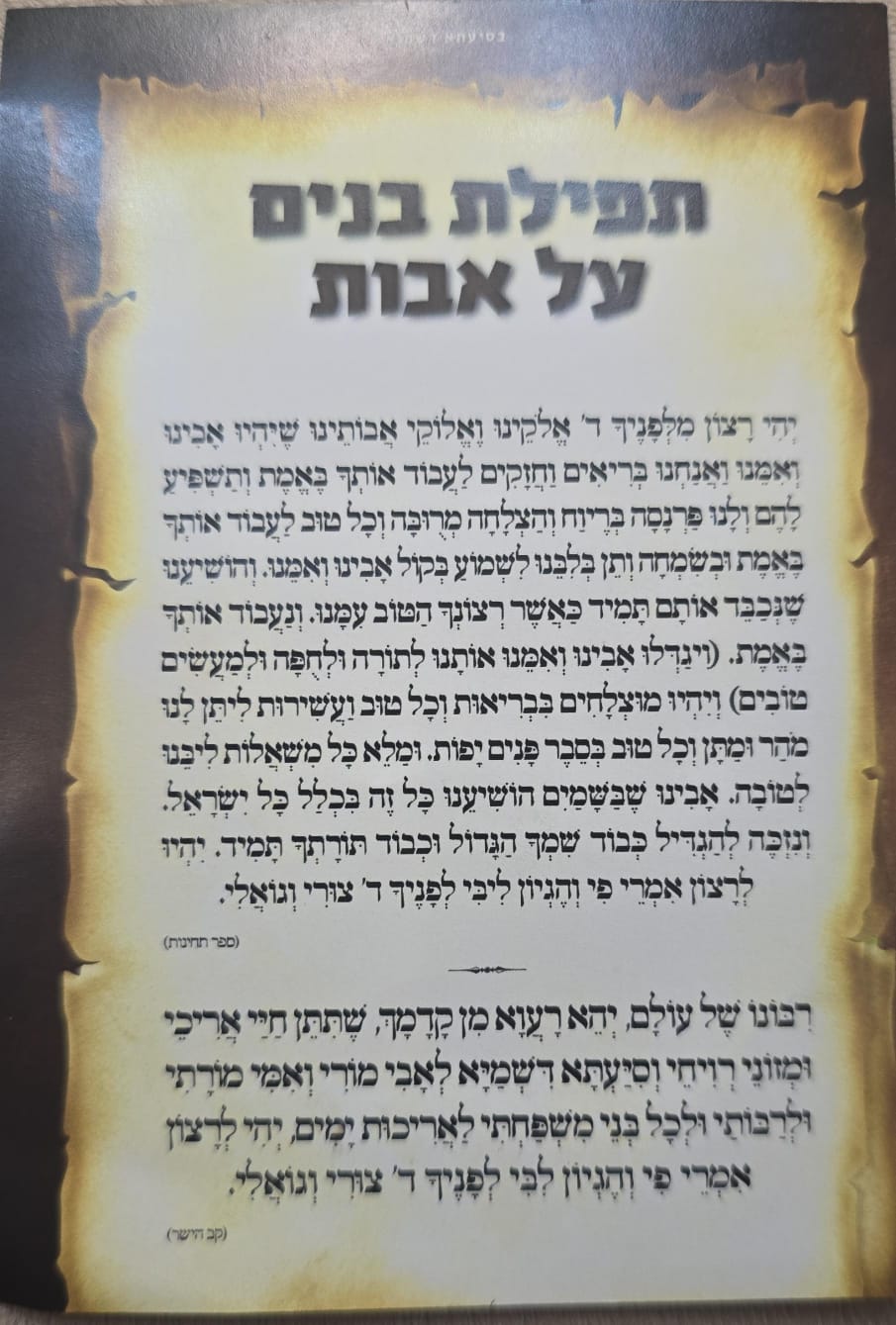 והנה הדפים ובהם התפילה המיוחדת שחילק ר' דוד למתפללים: תפילת בנים על אבות.