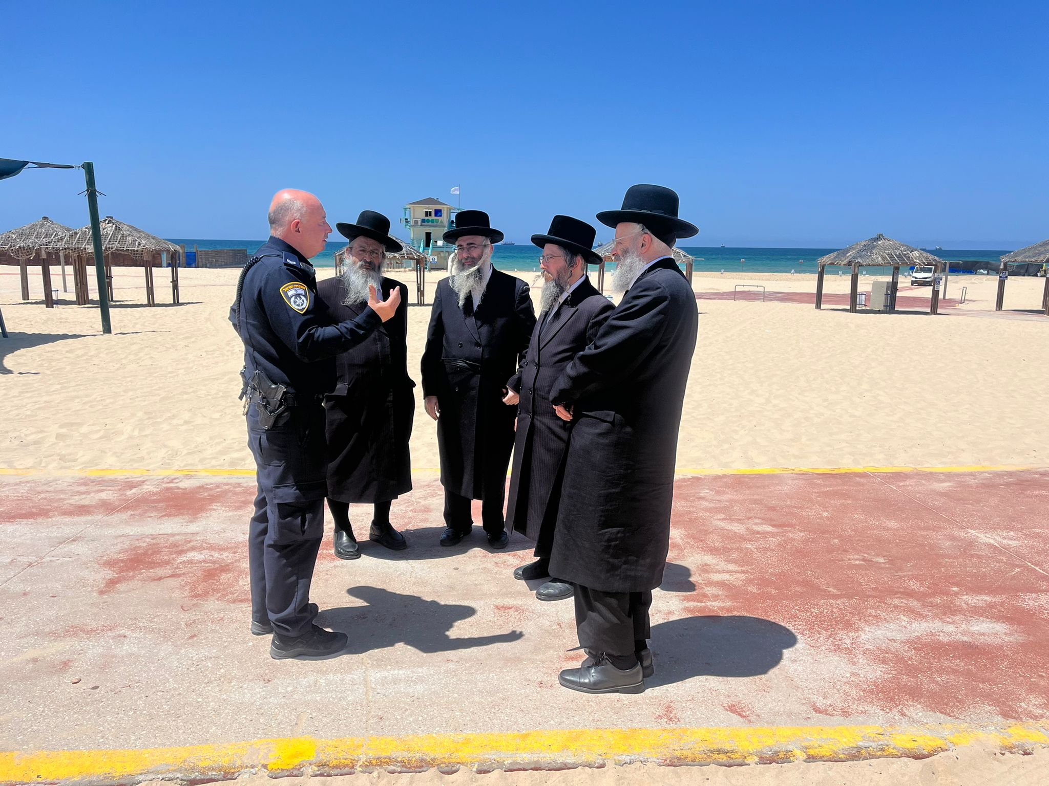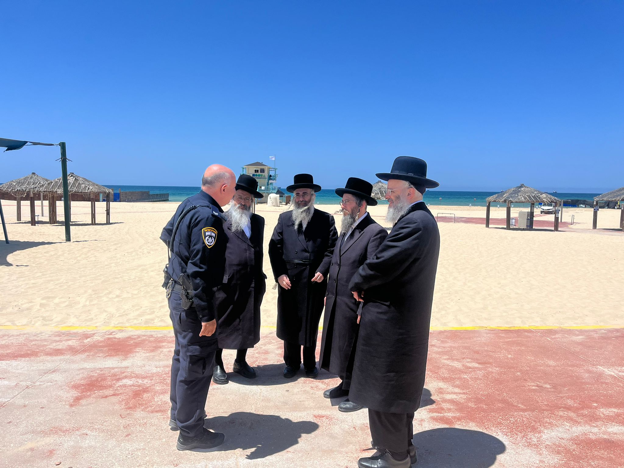 על רקע פתיחת עונת הרחצה רבני אגודת ישראל ביקרו בחוף הנפרד כדי להבטיח כי גדרי הצניעות נשמרים במקום * בסיור השתתף סגן ראש העיר הרב יחיאל ווינגרטן ויור קוגן, שוטר החופים האחראי על חופי העיר