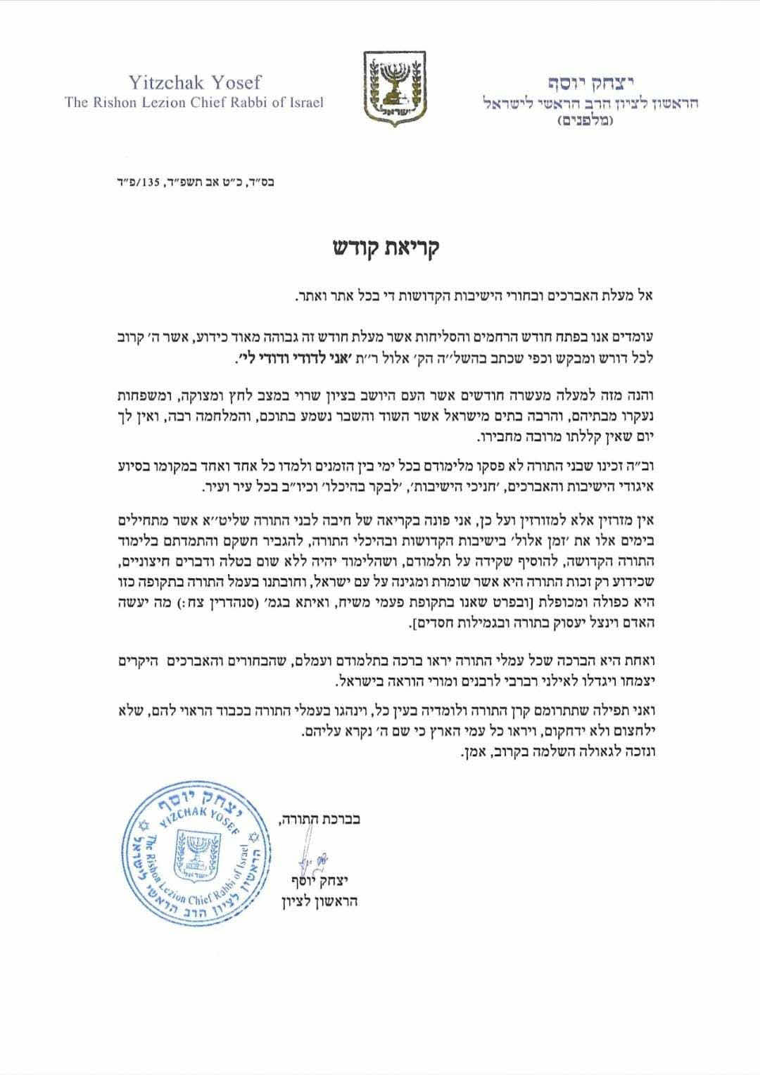 היוזמה זכתה למכתב תמיכה מיוחד של הראשל"צ הרה"ג רבי יצחק יוסף שליט"א.