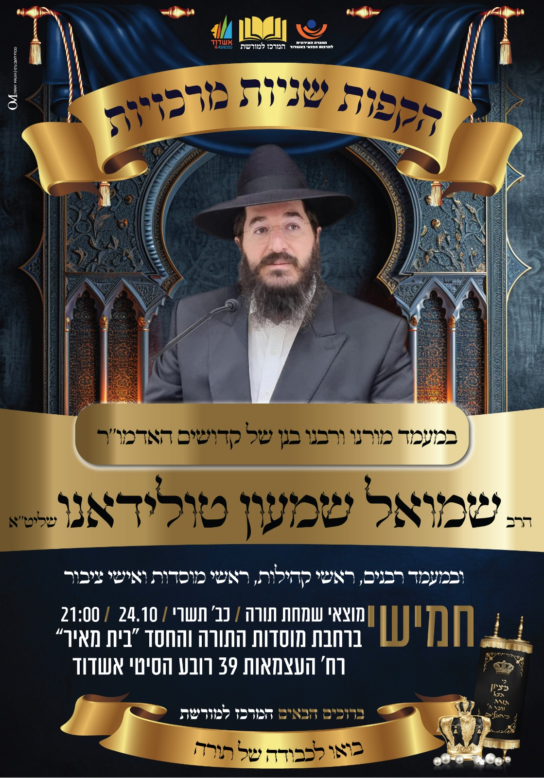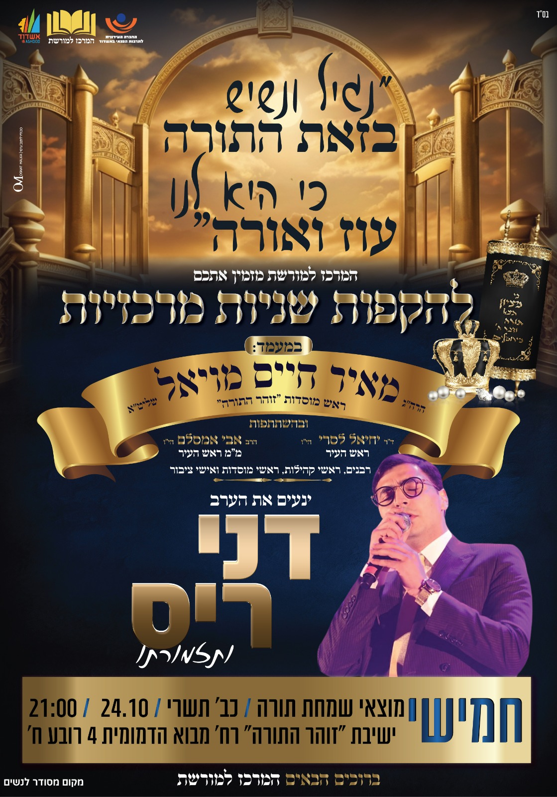 3. הקפות שניות מרכזיות מבית "המרכז למורשת" יתקיימו ביום חמישי, כ"ב תשרי, מוצאי שמחת תורה, ברחבת בית הכנסת אהבת השם, רח' דוד בוזגלו 21 רובע ט', בשעה 21:30, עם שר השמחה עמי מימון ובמעמד הרה"ג שמעון כהן שליט"א ראש מוסדות 'עמוד החסד' ובהשתתפות רבנים, ראשי קהילות, ראשי מוסדות אישי ציבור וקהל רב.