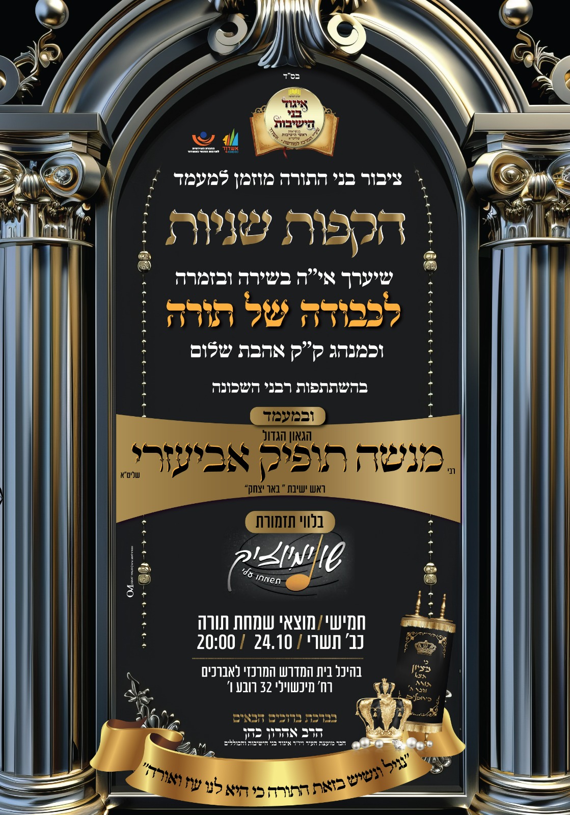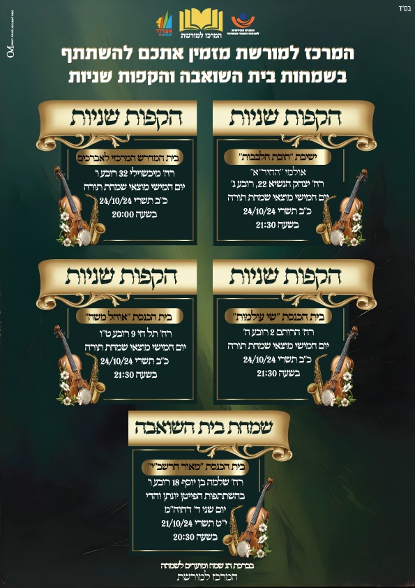 6. "איגוד בני הישיבות" ו"המרכז למורשת" מזמין את ציבור בני התורה להקפות שניות לכבודה של תורה כמנהג ק"ק 'אהבת שלום' שיתקיימו ביום חמישי, כ"ב תשרי, מוצאי שמחת תורה, בהיכל בית המדרש המרכזי לאברכים רח' מיכשווילי 32 רובע ו', בשעה 20:00, במעמד רבני השכונה ובראשות הרה"ג מנשה טופיק אביעזרי שליט"א ראש ישיבת 'באר יצחק'. את הערב תנעים תזמורת מיוחדת.