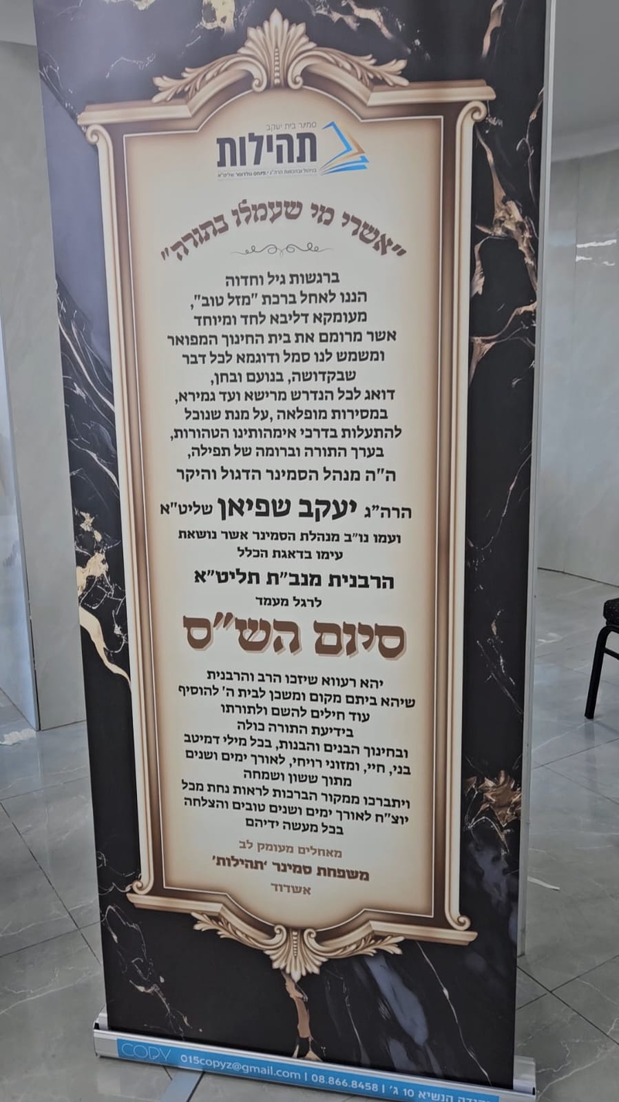 הדרן עלך לסיום הש"ס: במעמד צנוע ומרגש התקיים סיום הש"ס ע"י הרב יעקב שפיאן שליט"א מנהל סמינר "תהילות" – אירוע שהפך לסמל של כבוד התורה. האירוע התקיים באולם שע"י בית המדרש "כנסת ישראל", בנשיאותו של הרה"ג ר' אברהם בן חמו, ובהשתתפות רבנים, ידידים, הורי תלמידות סמינר תהילות, רבנים חשובים ואישי ציבור.