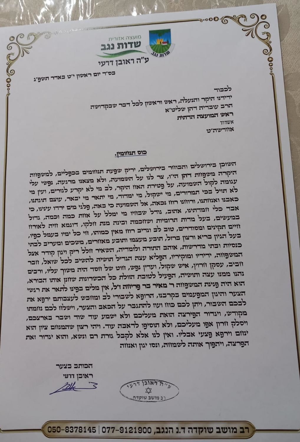 במכתבו ציין את הכאב בפטירתו של האח המנוח מאיר ז"ל ועקב לו"ז עמוס והתחייבויות קודמות, נבצר ממנו לבוא ולהשתתף אישית בצערכם. וסיים שיהיה רצון מלפני השי"ת, מן השמים תנוחמו ולא תוסיפו לדאבה עוד, ותזכו לראות בנחמת ציון וירושלים, ויקויים הפסוק: ומחה ה' אלוקים דמעה מעל כל פנים ונזכה לגאולת עולמים במהרה, אמן.