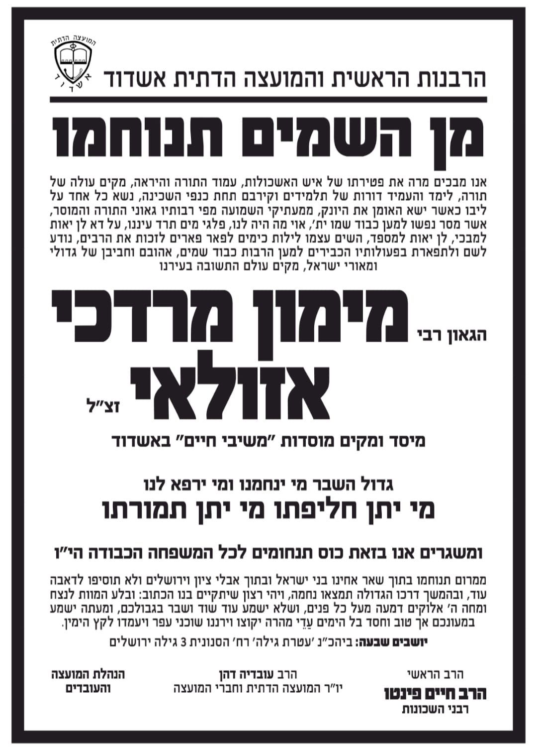 בצער רב הגיעה הידיעה המעציבה על הסתלקותו של דמות אצילית תורנית, אשר לחם ועמד בפרץ למעם הרבות תורה, מסר נפשו כל חייו לתורה ולגמילות חסדים, זכה לקרב יהודים רבים לאביהם שבשמים במאור פנים והעמידם בקרן אורה הרה"ג ר' מימון מרדכי אזולאי זצ"ל מקים ומיסד הישיבה לבעלי תשובה "משיבי חיים" ברובע ב', אשר השיב נשמתו לבוראה לאחר יסורים קשים ומרים ביום הפורים יום שישי וערש"ק כשהוא בן עז' שנים.