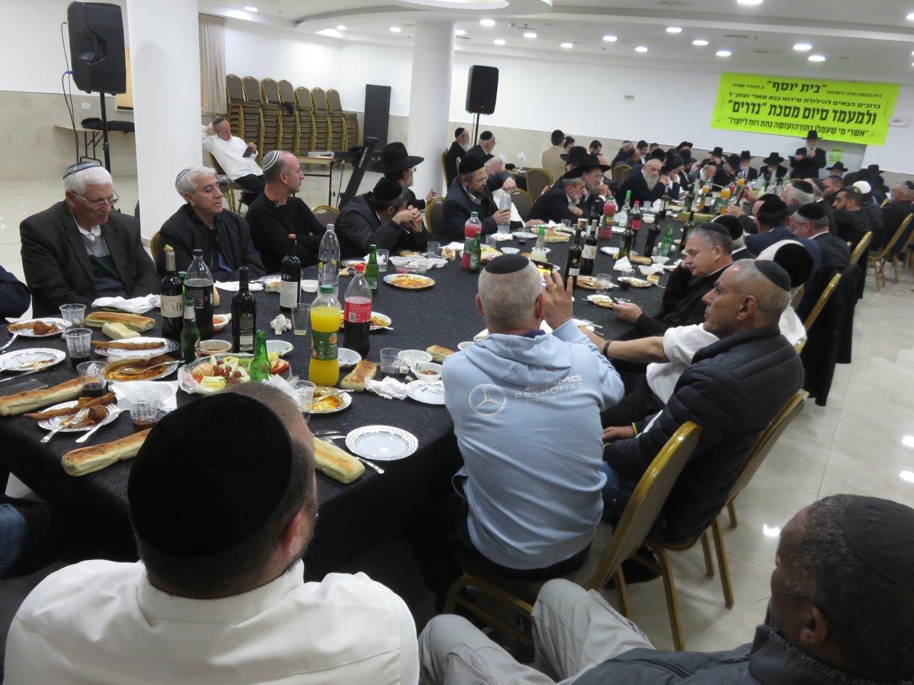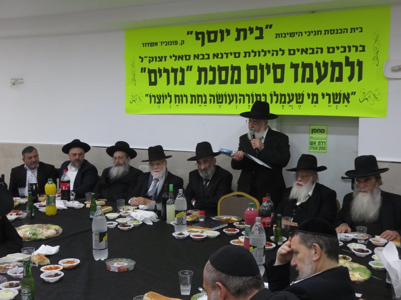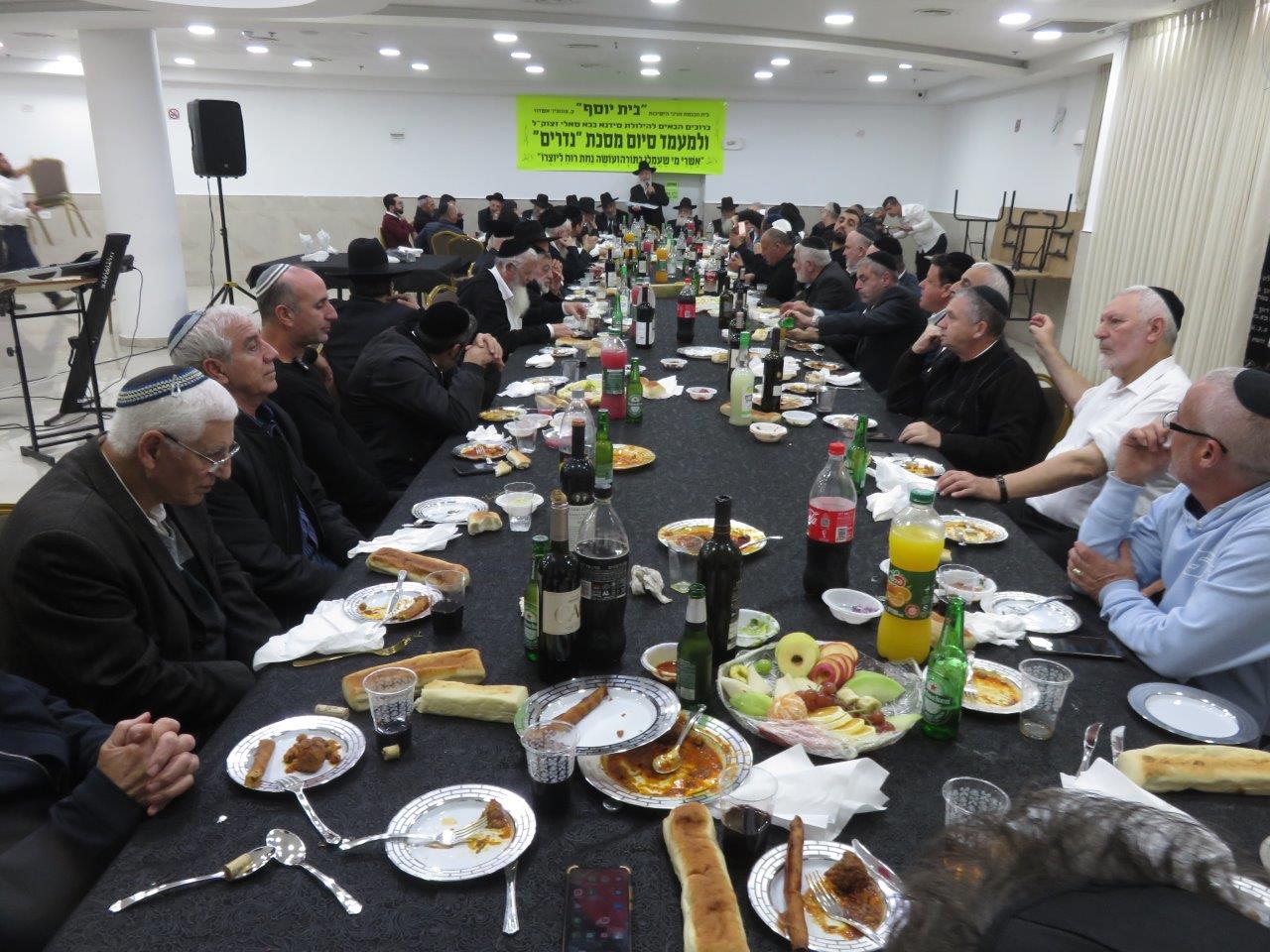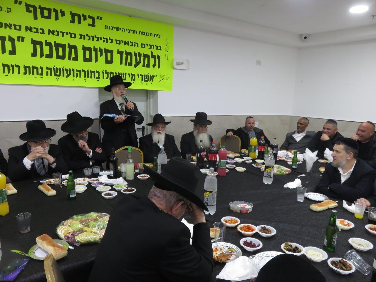 משתתפי השיעור הקבוע במסגרת הלימוד בדף היומי בבית הכנסת חניכי הישיבות "בית יוסף" חגגו סיום על מסכת "נדרים" באולם שע"י בית הכנסת "נר דוד ואוהל רחמה" ברובע ט', סביב שולחנות ערוכים מכל טוב כיאה לכבודה של תורה כשהם מציינים יחד גם את הילולת האדמו"ר סידנא בבא סאלי זצוק"ל.