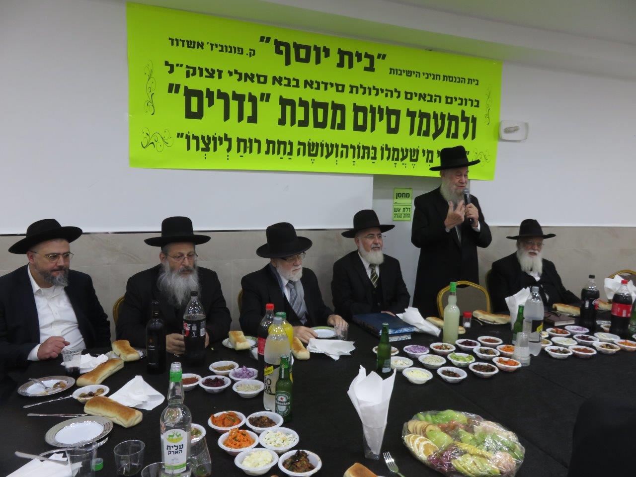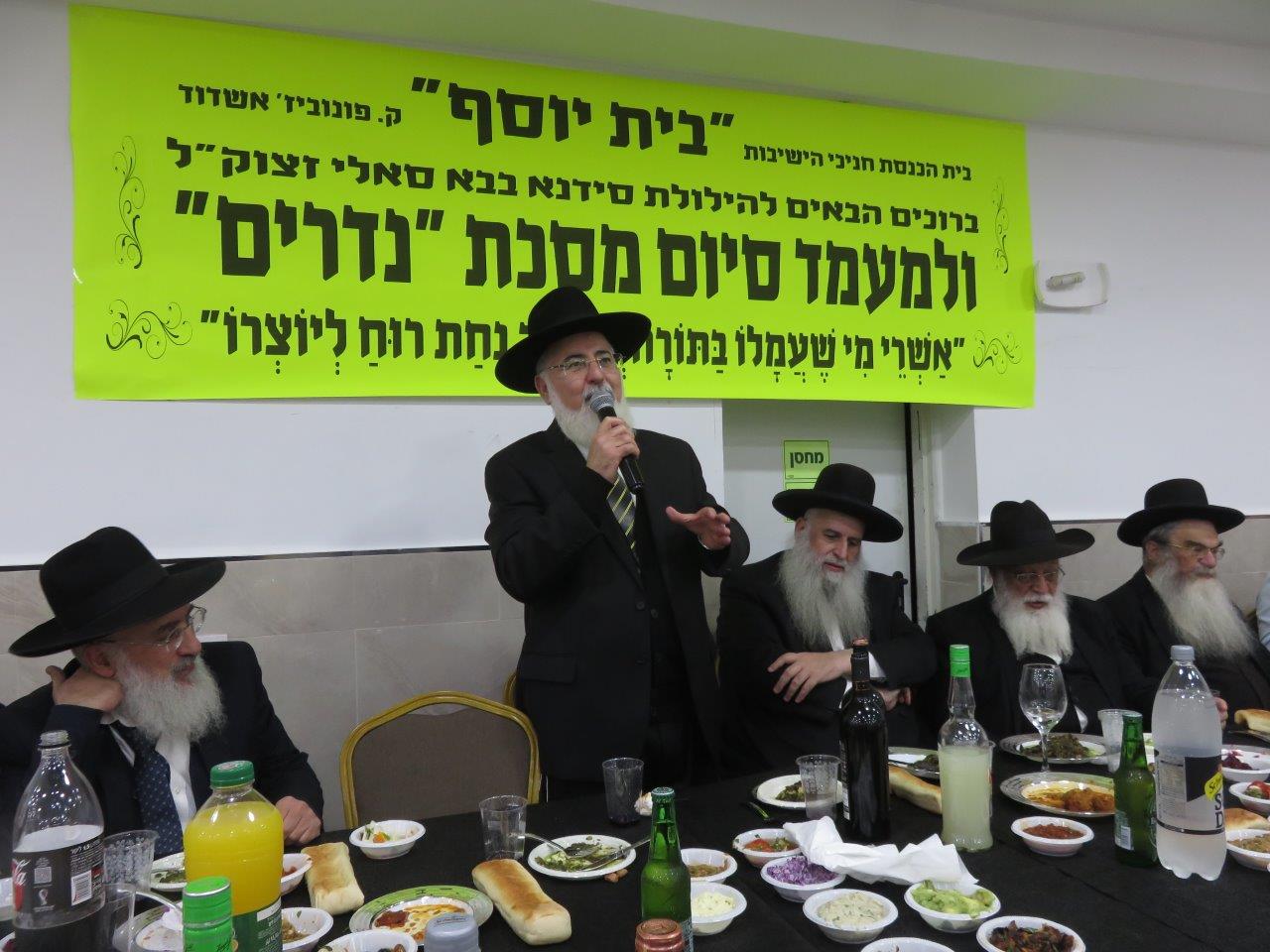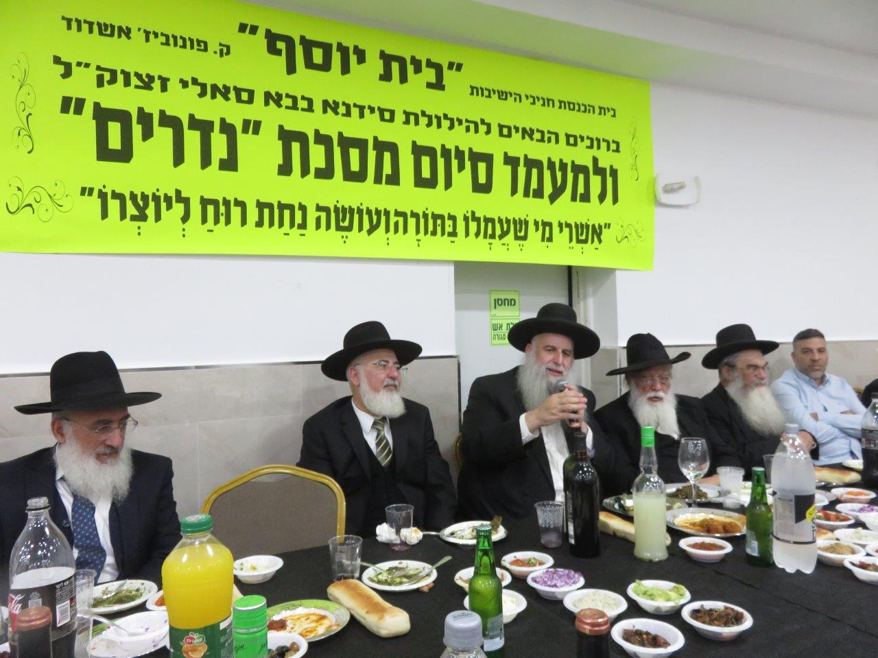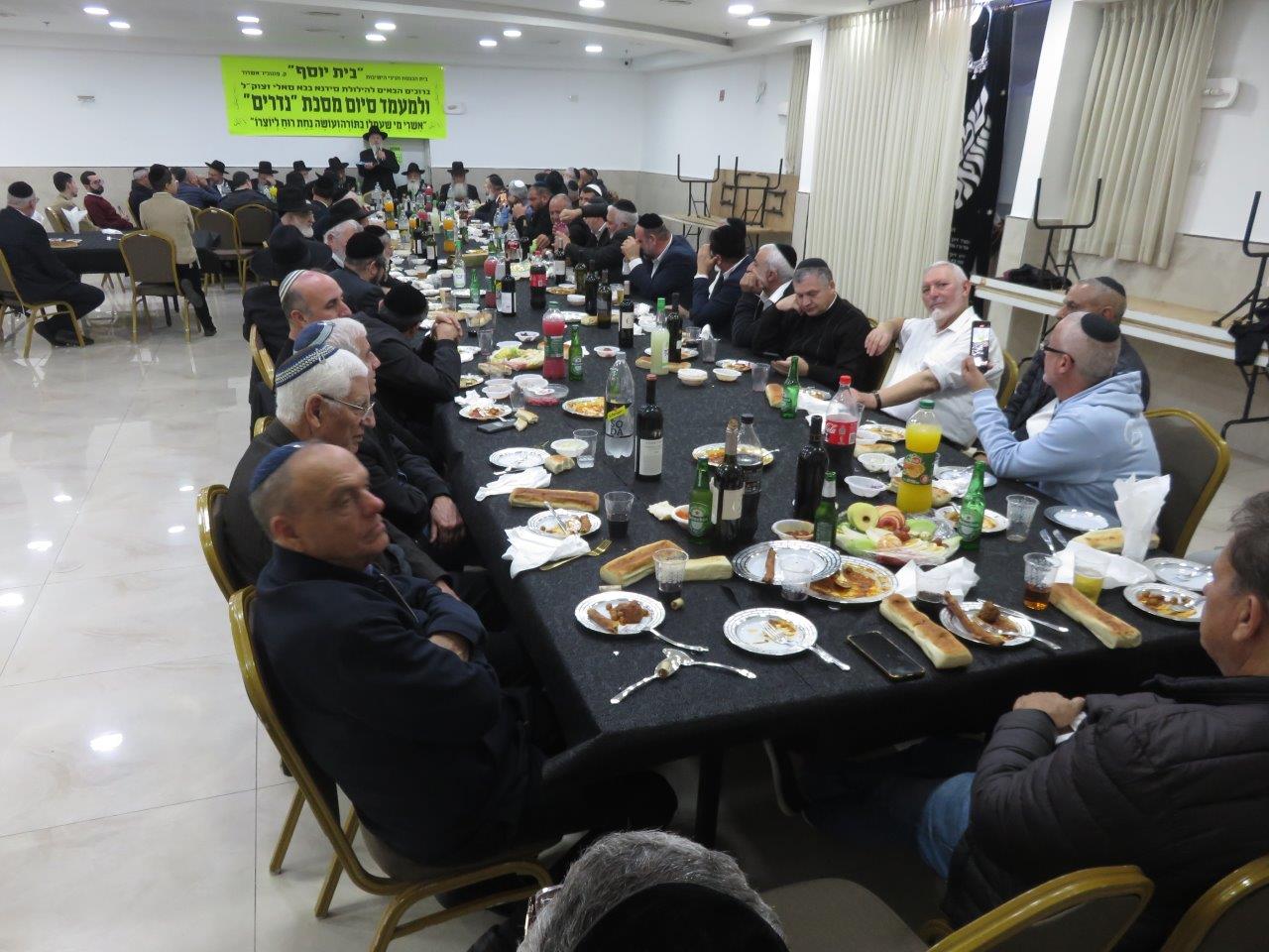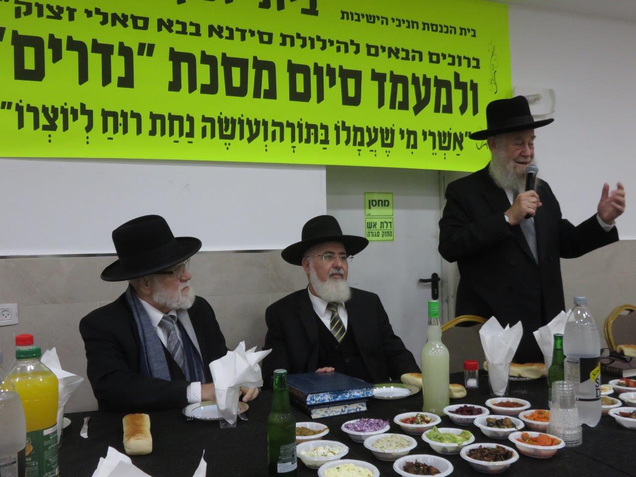 משתתפי השיעור הקבוע במסגרת הלימוד בדף היומי בבית הכנסת חניכי הישיבות "בית יוסף" חגגו סיום על מסכת "נדרים" באולם שע"י בית הכנסת "נר דוד ואוהל רחמה" ברובע ט', סביב שולחנות ערוכים מכל טוב כיאה לכבודה של תורה כשהם מציינים יחד גם את הילולת האדמו"ר סידנא בבא סאלי זצוק"ל.