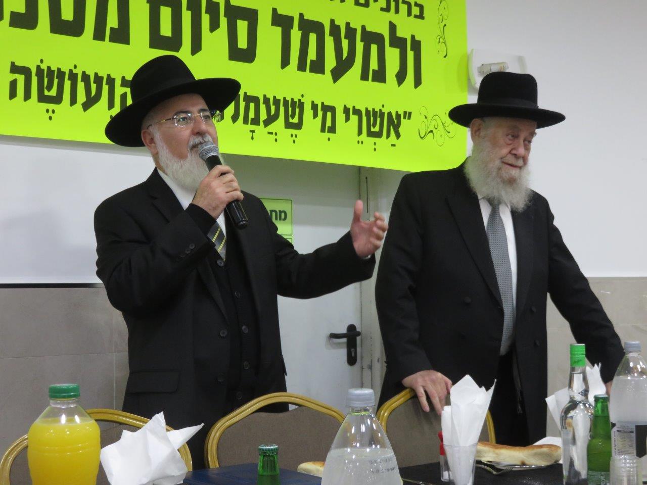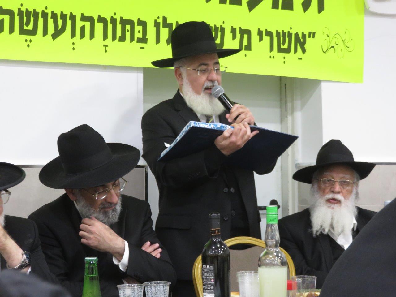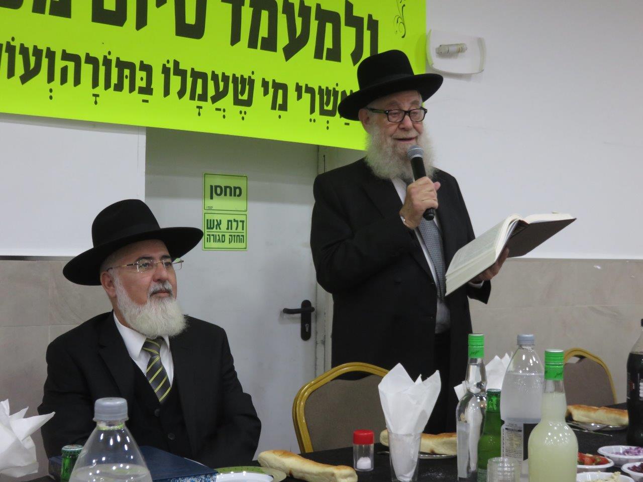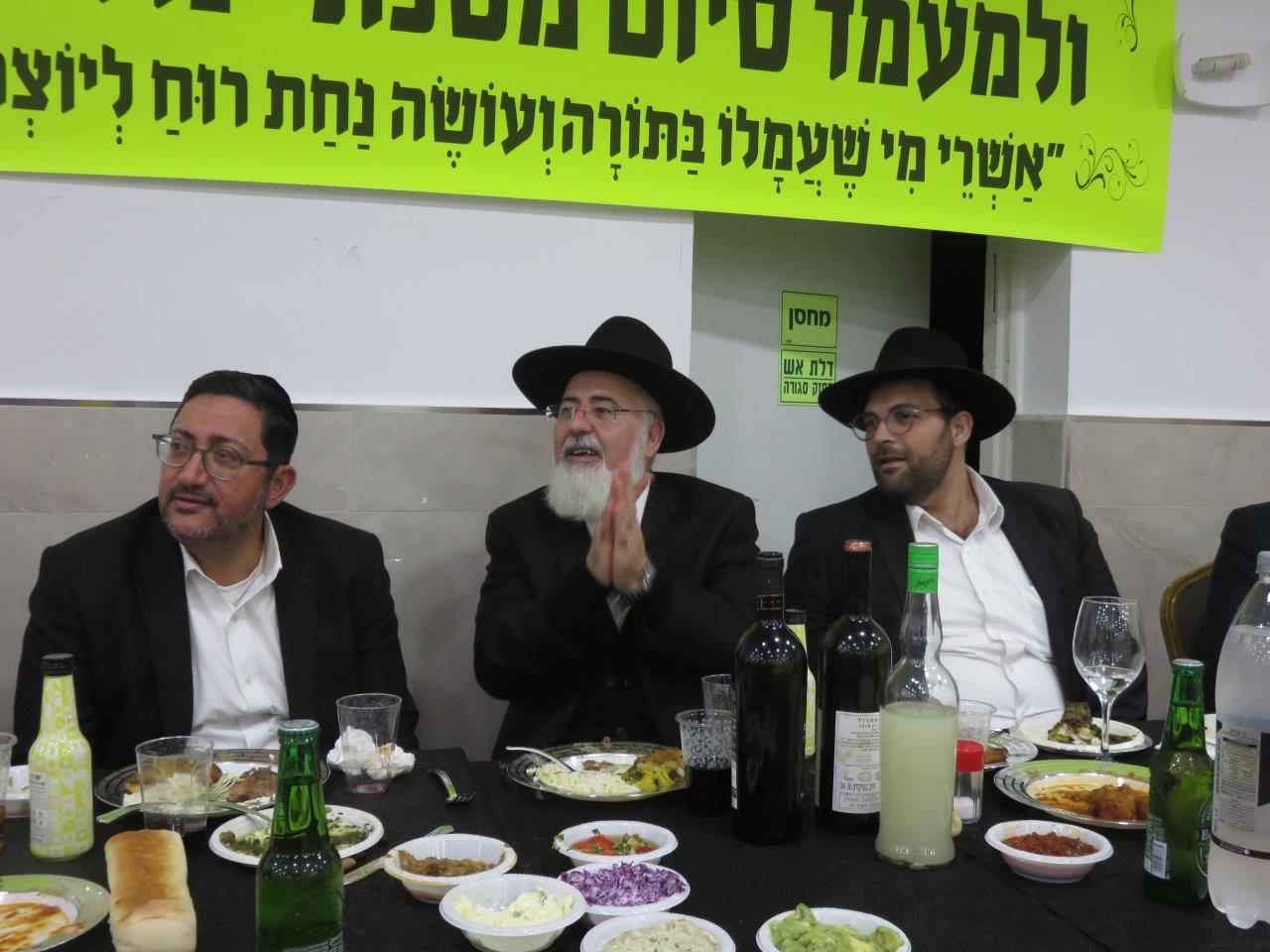 לאחר מכן, הציבור היסב לסעודת מצוה כיד המלך, כשבמהלכה נשאו דברי תורה וההערכה לכבודה של תורה. הרבנים החשובים: הרב מאיר אבוחצירא רבה של הסיטי, הרב חיים קלמנוביץ חבר לשכת הרה"ר רב שכונה ורב מחלקת עירובין, הרב מאיר כהן רב בית הכנסת הריב"ז ומחבר הספרים "אוצר פסקי הלכה", הרב מרדכי עמאר רבה של ק"ק "איפיני" בצרפת, הרב אברהם בן-חמו ראש כולל "כנסת ישראל – שמחת אליהו", הרב חיים בן- חמו מרבני המועצה הדתית, ר' מני אזולאי חבר מועצת העיר ויו"ר מהו"ת, ר' יחיאל וינגרטן סגן ראה"ע, הרב חיים אמסילי חבר מועצת העיר, וממונה מחלקת חינוך חרדי, עו"ד יאיר לחן, ר' דוד בן-מנחם ויעקב שטרית מ"מ יו"ר המועה"ד.