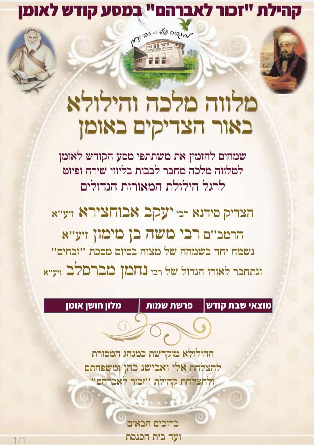 גולת הכותרת של המסע תהיה שבת מרוממת בציון רבי נחמן, באווירה מיוחדת של אחדות, שירה ותפילה. הקהילה תתארח במלון חושן המפואר שיעמוד כולו לרשות הקהילה. ר' אלי מציין בהתרגשות כי בשנה זו יזכה יחד עם רעייתו לקיים באומן, במוצאי שבת קודש פרשת שמות את ההילולא המסורתית לכבוד הצדיקים סידנא רבי יעקב אבוחצירא זיע"א בשירה ופיוט "יגל יעקב ישמח ישראל" והרמב"ם רבי משה בן מימון זיע"א. ההילולא שהפכה ברבות השנים למסורת תוקדש להצלחת *אלי ואבישג כהן ולקהילת זכור לאברהם