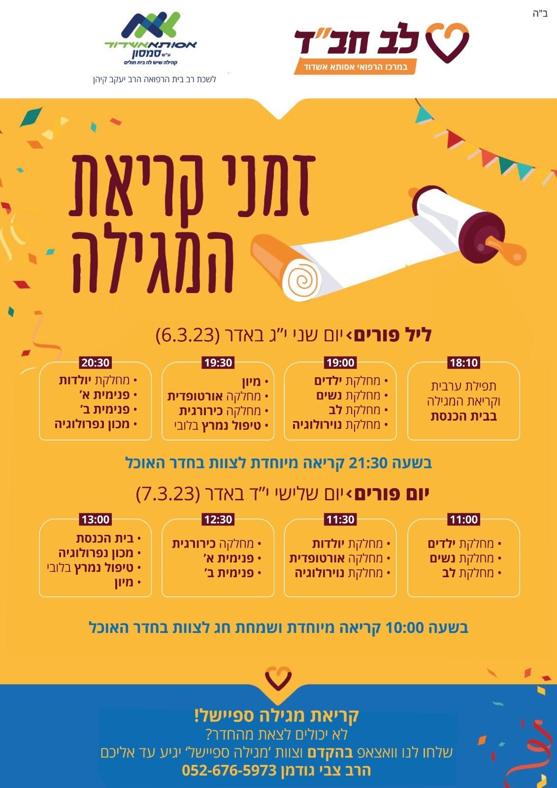 כן תתקיים קריאת מגילה מיוחדת לצוות הרופאים, וזאת לצד מבצע 'משלוח מנות' שיערך בבית החולים בידי הרב גודמן.