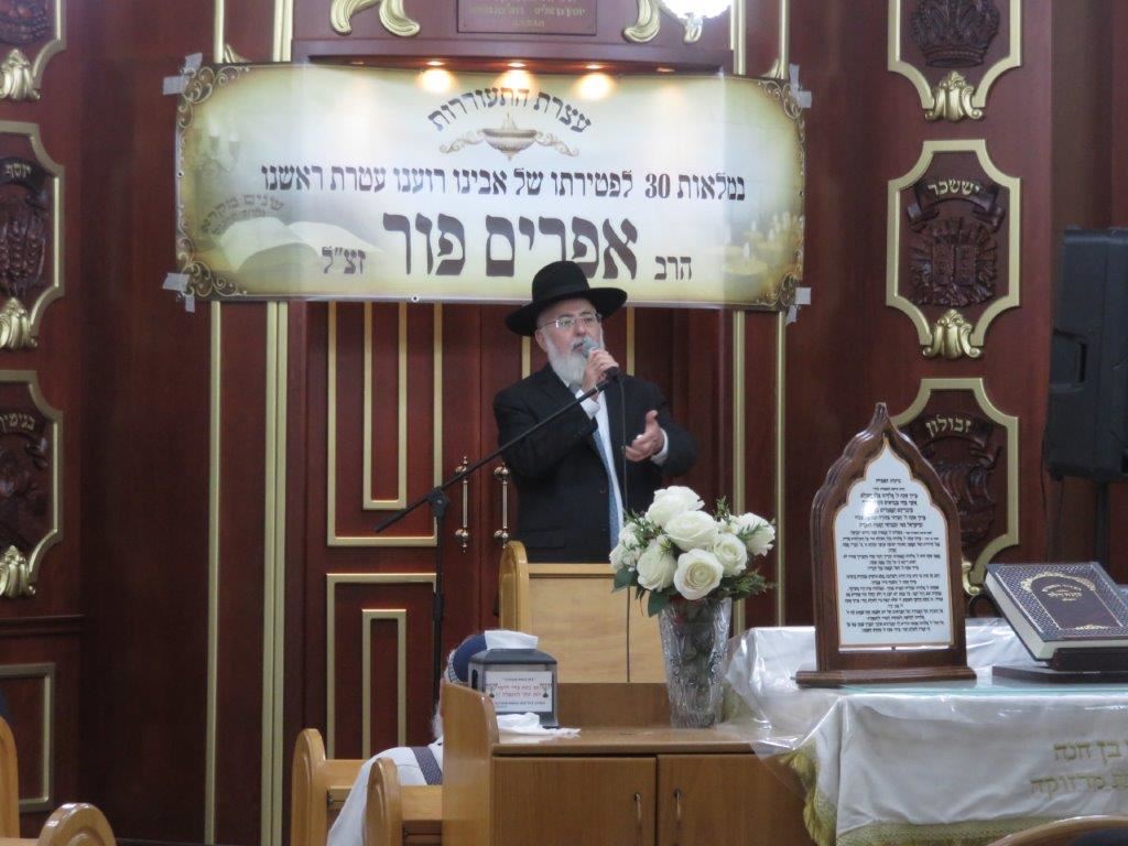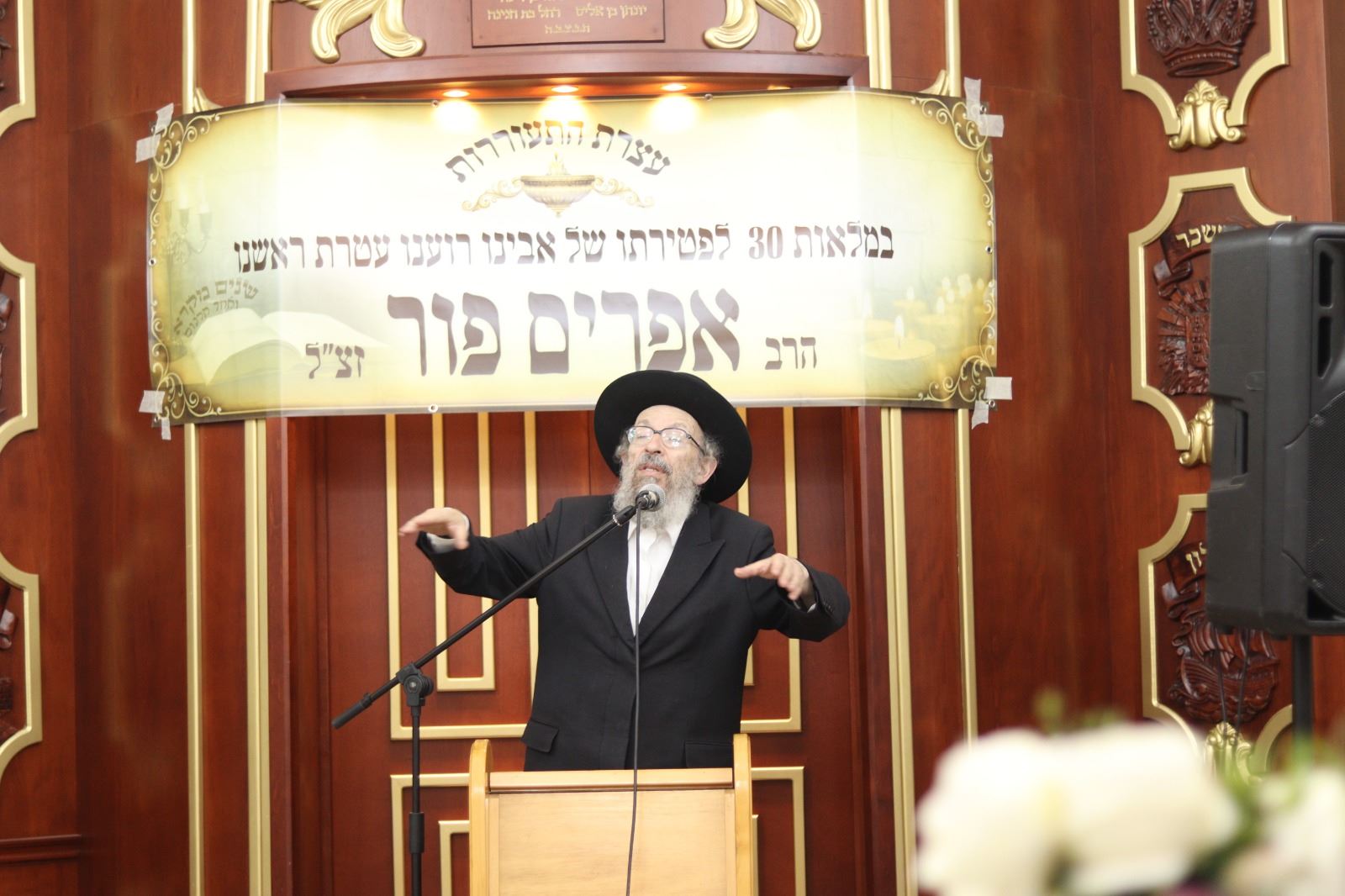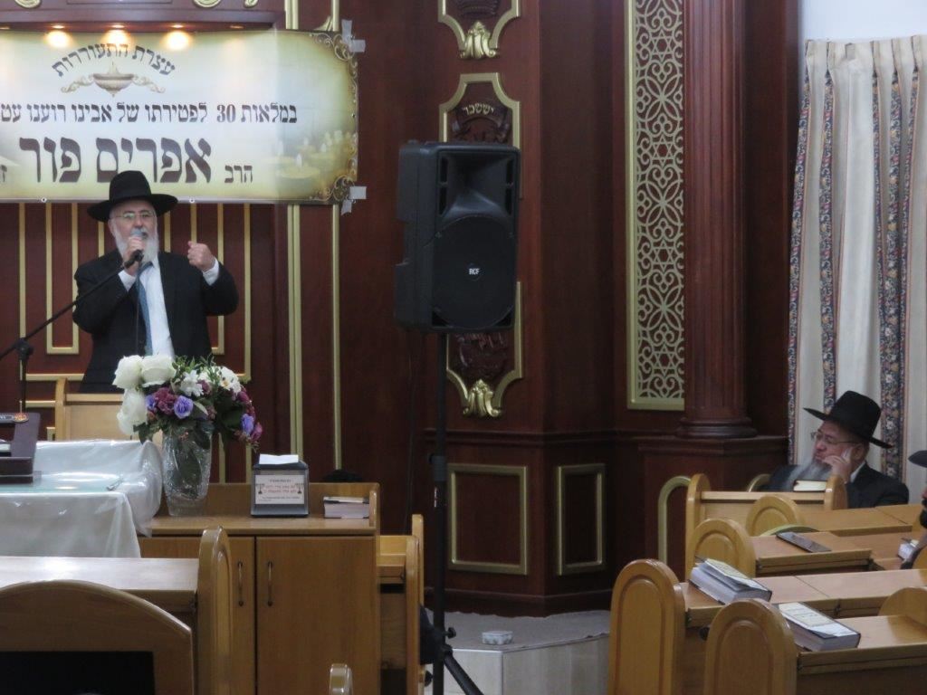 עם כלות השלושים להרב אפרים פור זצ"ל שהיה צורבא מרבנן, אוהב תורה וחסד התקיימה עצר חיזוק והתעוררות בבית הכנסת "עמוד החסד" רובע ט' בראשותו של הרה"ג ר' שמעון כהן שליט"א במעמד רבנים חשובים.