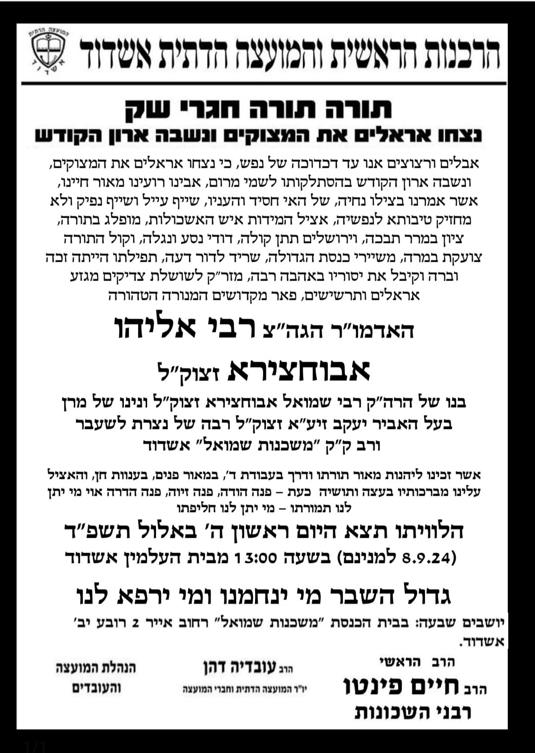 אבלים ורצוצים אנו עד דכדוכה של נפש, בהסתלקותו לשמי מרום, של האי חסיד והעניו, שייף עייל ושייף נפיק ולא מחזיק טיבותא לנפשיה, אציל המידות איש האשכולות, מופלג בתורה, משיירי כנסת הגדולה, שריד לדור דעה, תפילתו הייתה זכה וברה וקיבל את יסוריו באהבה רבה, מזרע קודש לשושלת צדיקים מגזע אראלים ותרשישים, פאר מקדושים המנורה הטהורה האדמו"ר הגה"צ רבי אליהו אבוחצירא זצוק"ל זקן רבני ואדמו"רי משפחת אבוחצירא שכיהן מלפנים כרבה הראשי של 'נצרת' ורב ק"ק "משכנות שמואל" באשדוד שהשיב את נשמתו הטהורה והוא בן צ"ב שנים.
