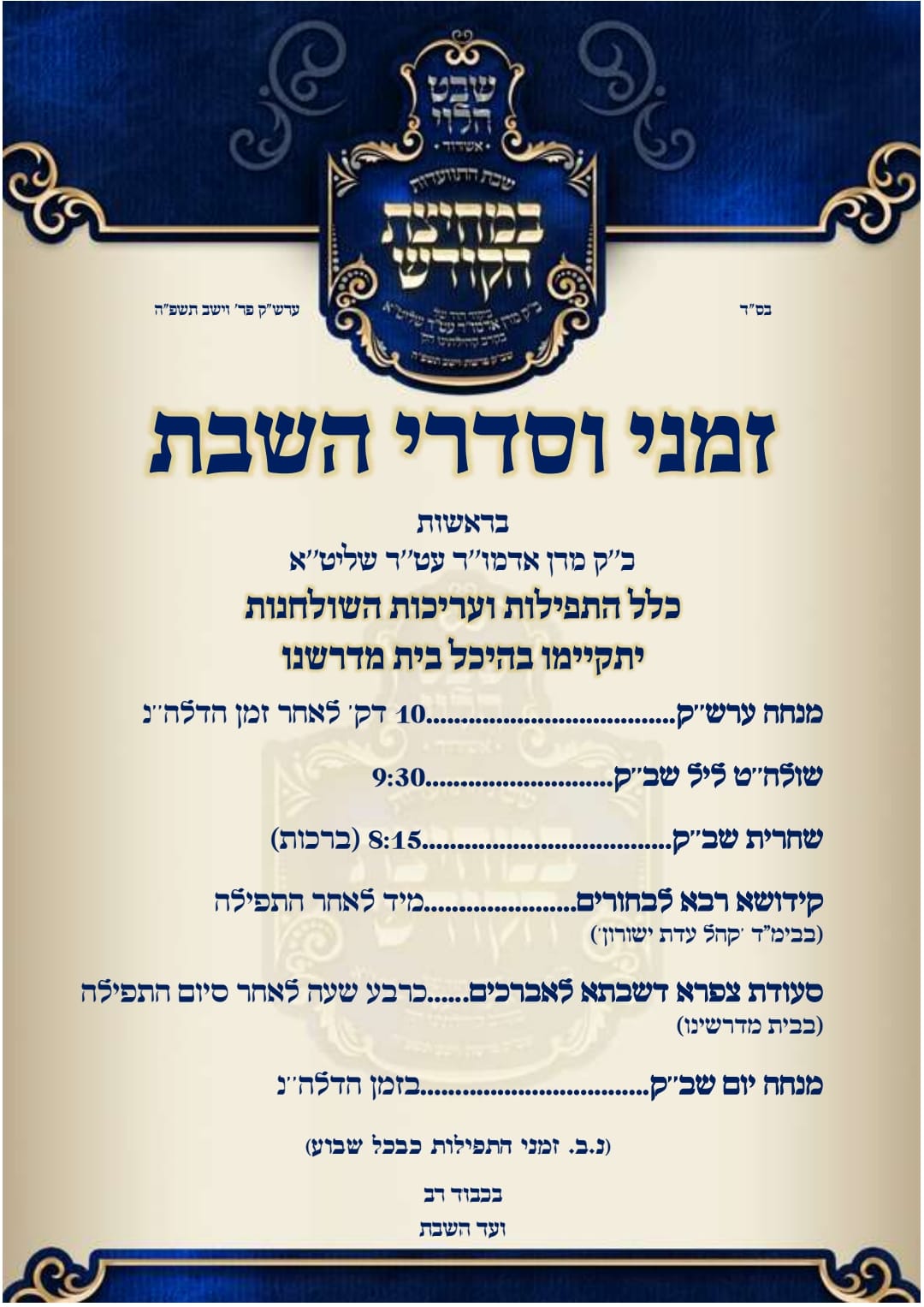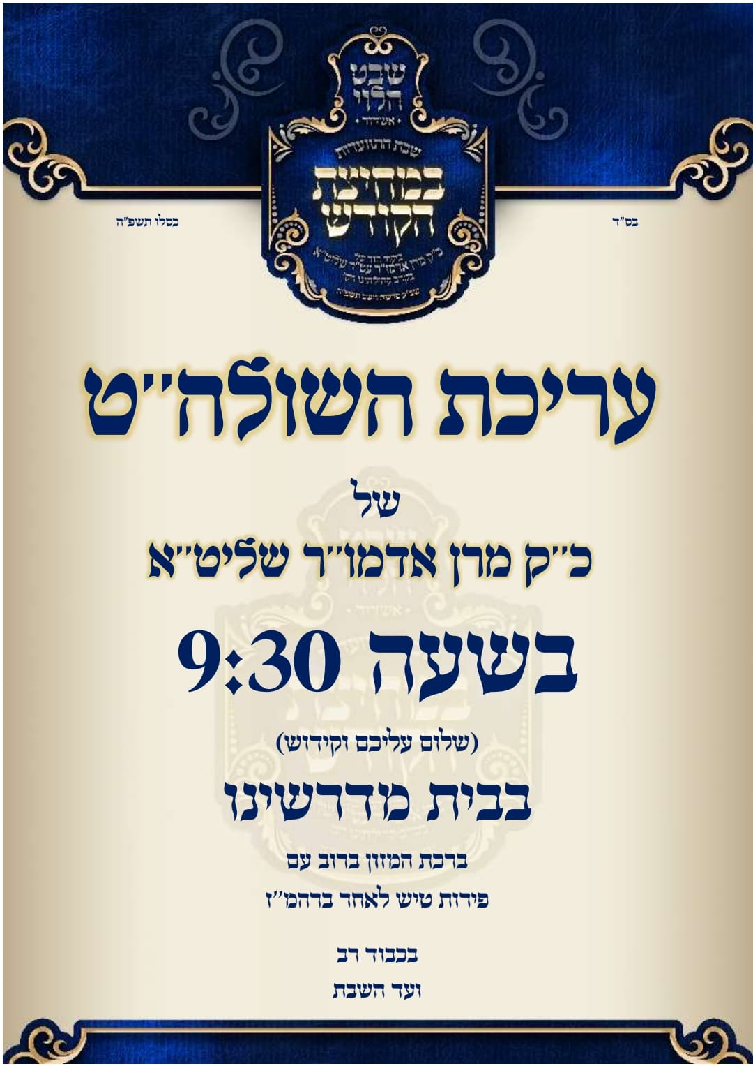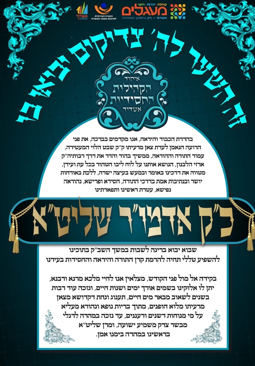 השבת ישבות בעיר האדמו"ר משבט הלוי שליט"א. לרגל בואו פירסם איגוד הקהילות החסידיות מודעת ברכה מיוחדת לרגל הארוע.