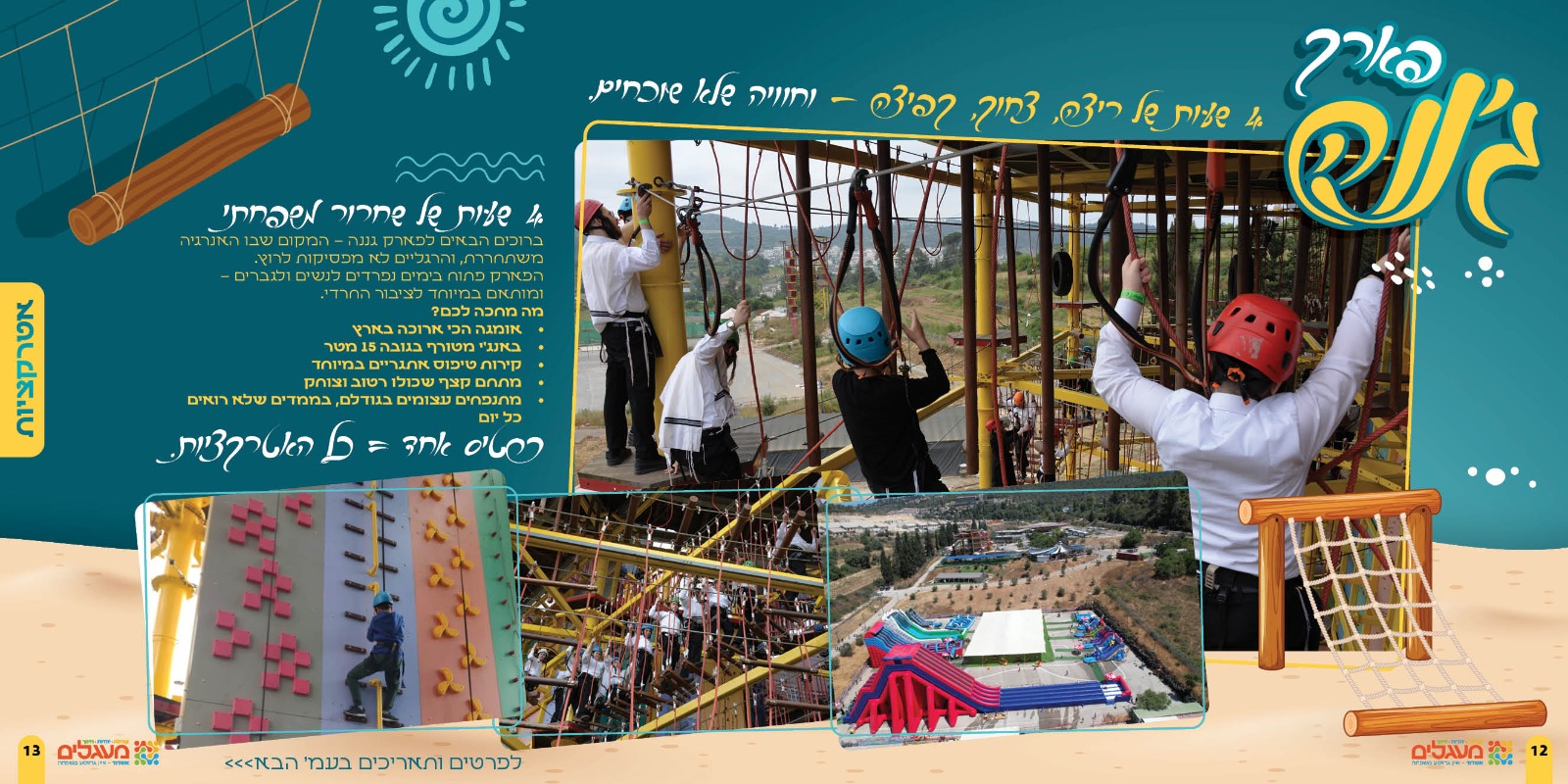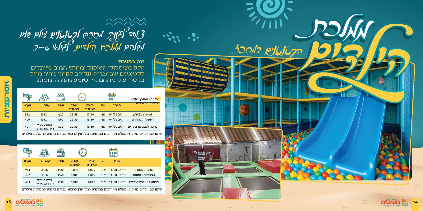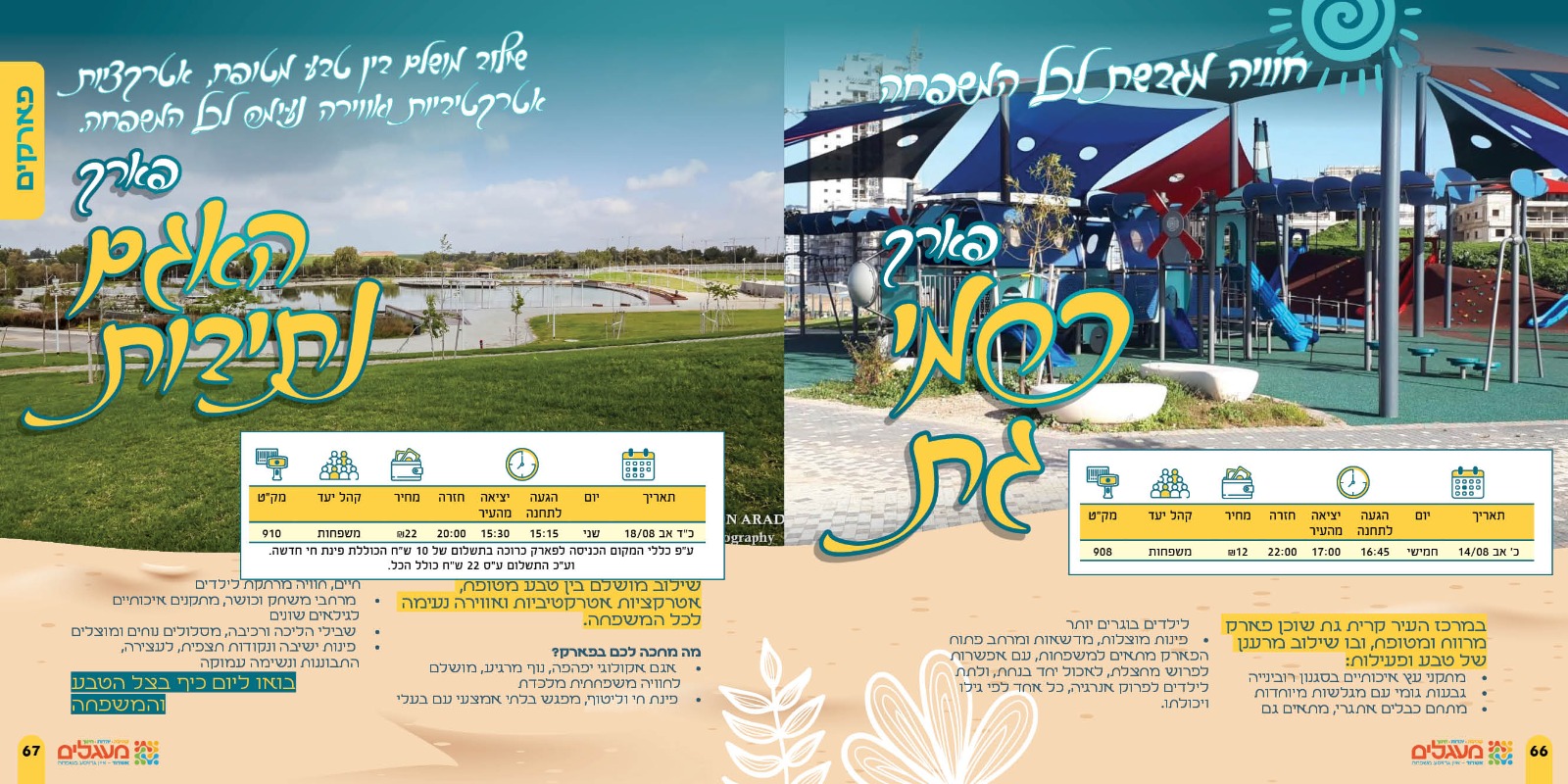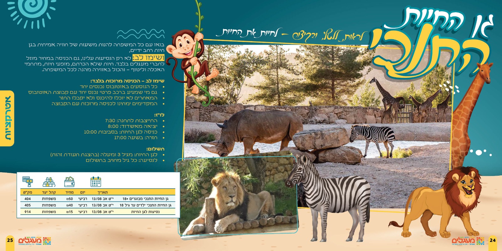 בין האטרקציות ופארקים חווייתיים, פארק ג'ננה, מתחם אקווה כיף בכנרת, מופעי אולם מרתקים במגוון רחב של מופעים, הצגות ופעילויות חינוכיות וייחודיות שיתקיימו באולם 'שילה' ברובע ו', טיולים והרפתקאות לפארקים ברחבי הארץ בדרום ובמרכז, סיור מרגש לעוטף עזה, גן החיות התנכ"י ועוד