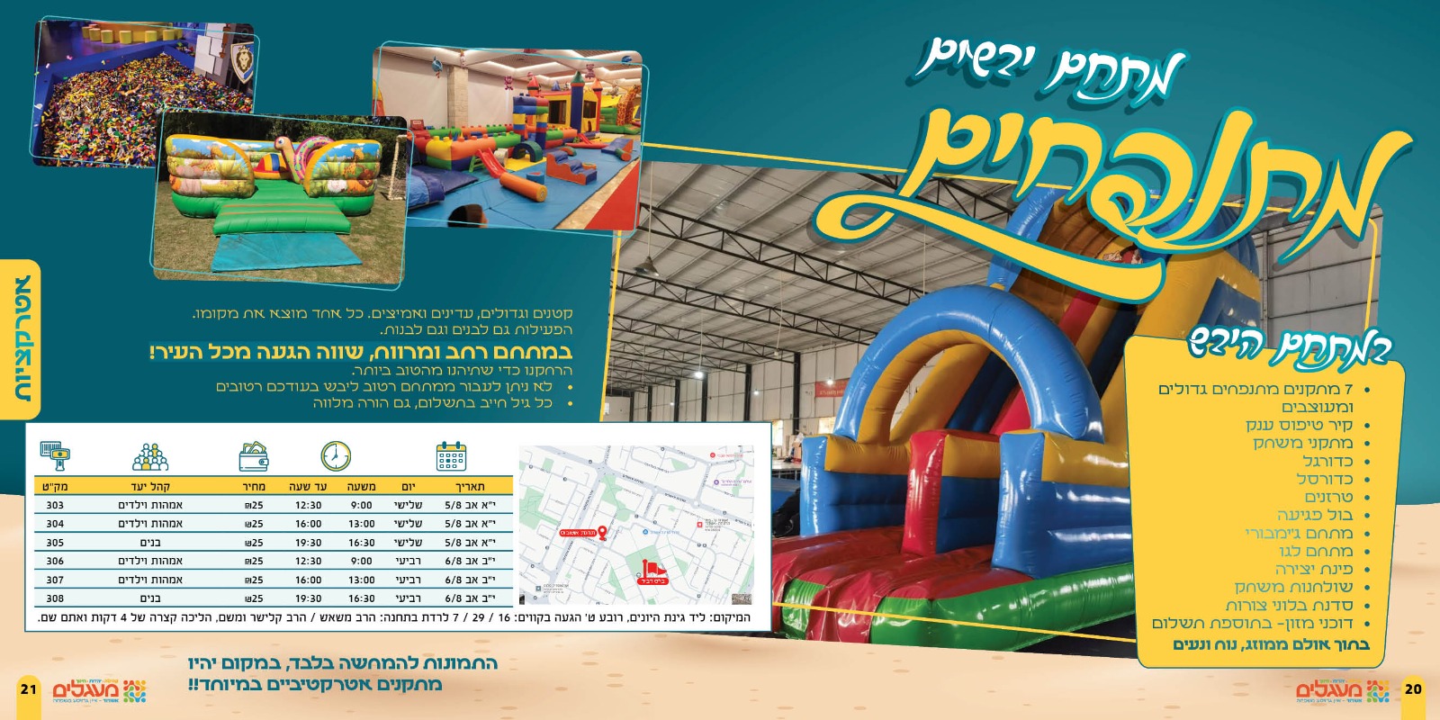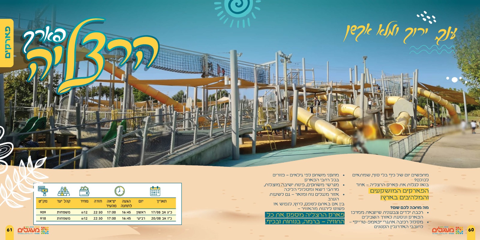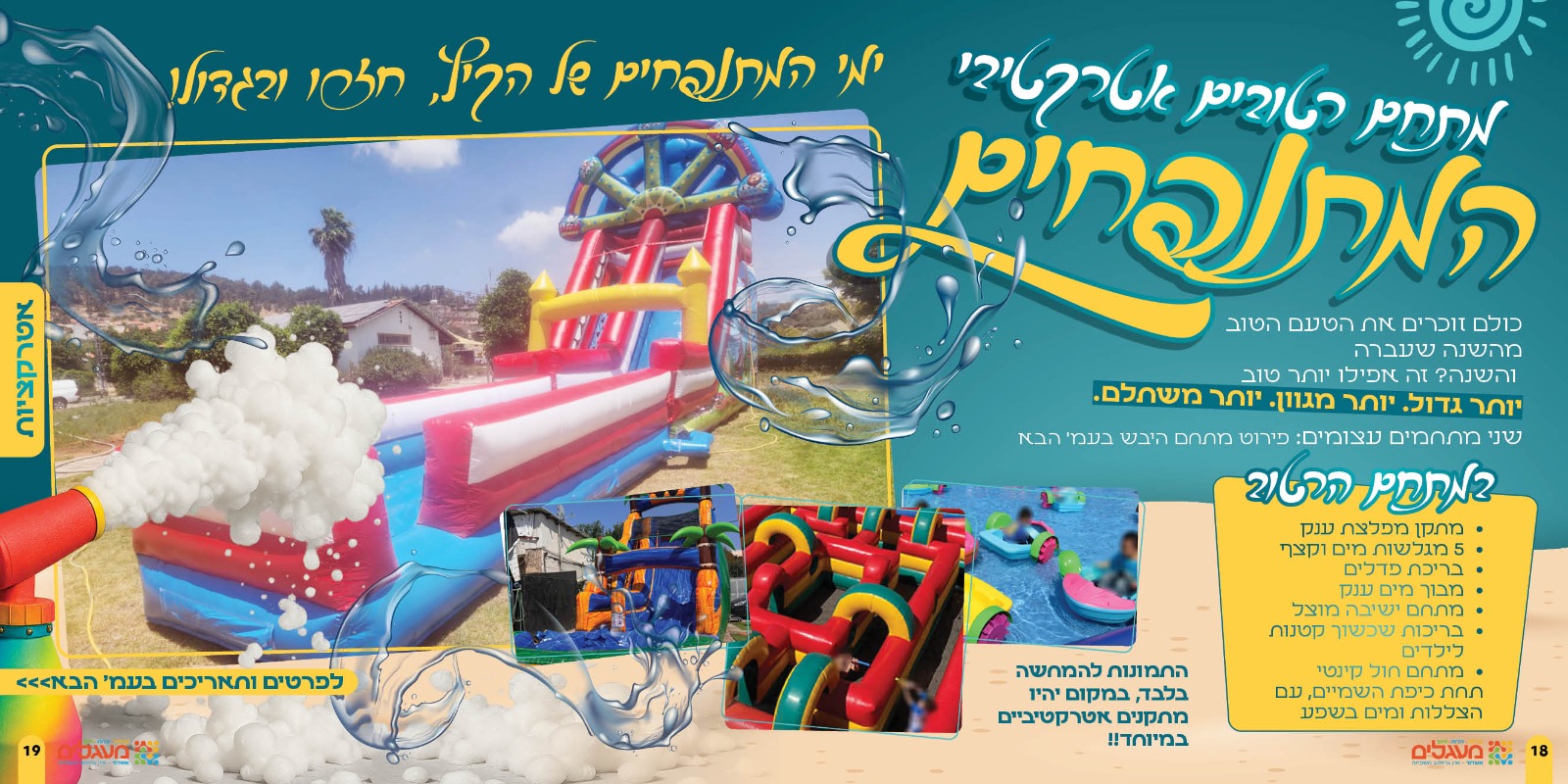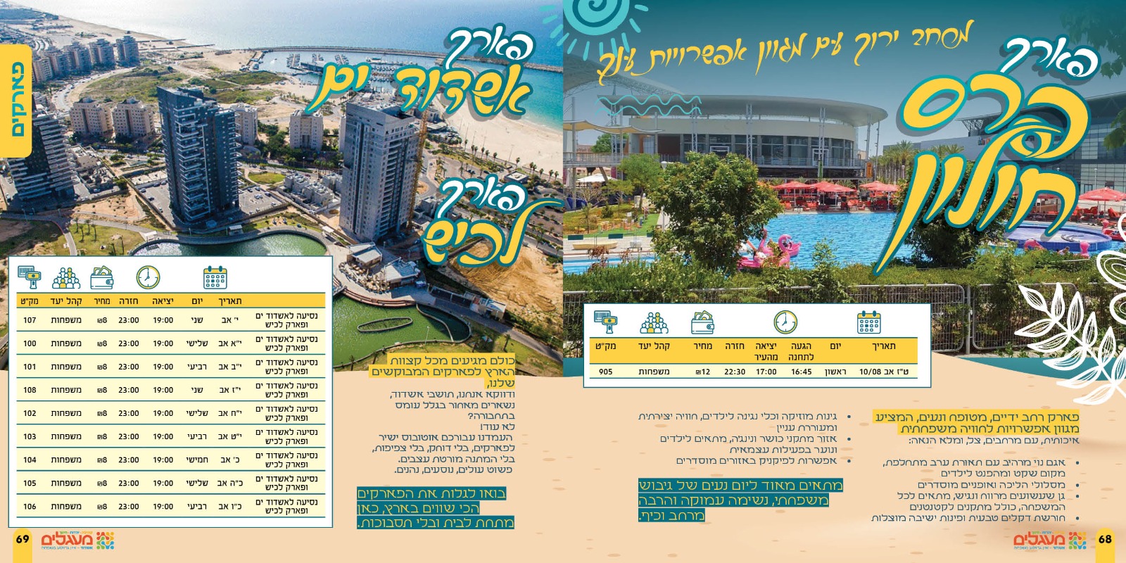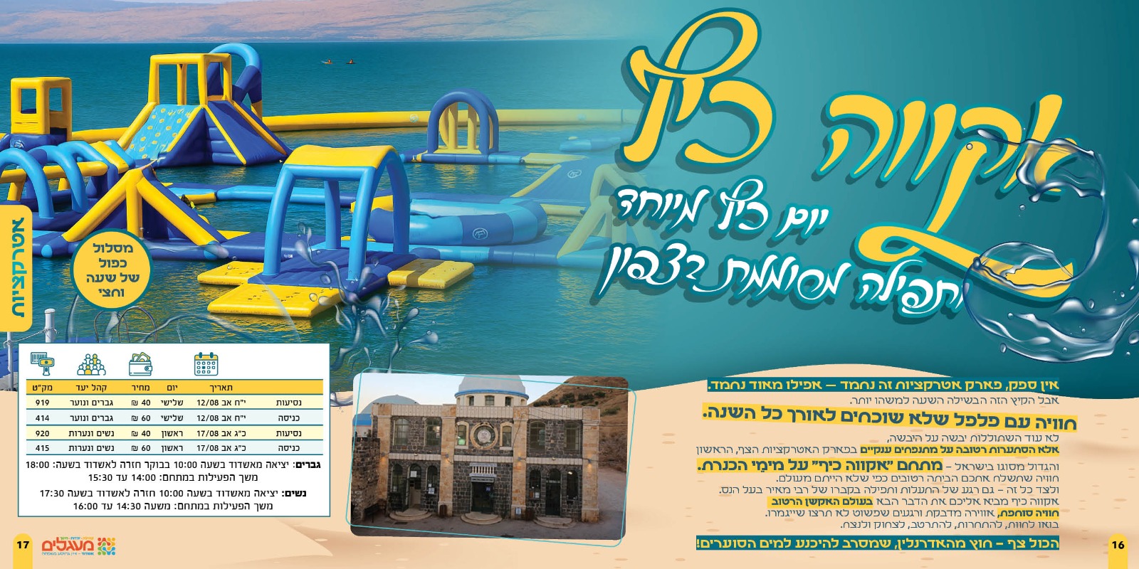 בין האטרקציות ופארקים חווייתיים, פארק ג'ננה, מתחם אקווה כיף בכנרת, מופעי אולם מרתקים במגוון רחב של מופעים, הצגות ופעילויות חינוכיות וייחודיות שיתקיימו באולם 'שילה' ברובע ו', טיולים והרפתקאות לפארקים ברחבי הארץ בדרום ובמרכז, סיור מרגש לעוטף עזה, גן החיות התנכ"י ועוד
