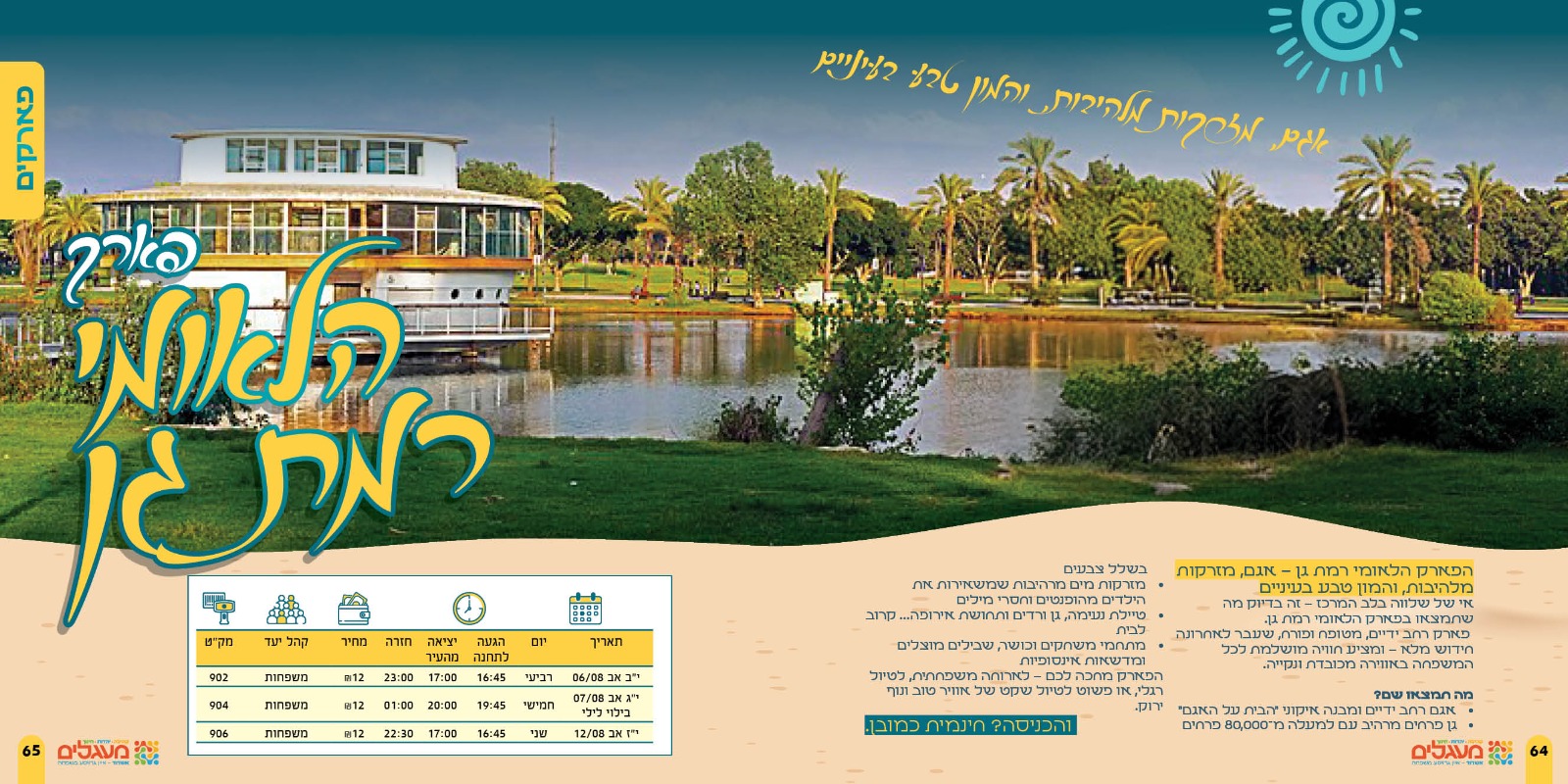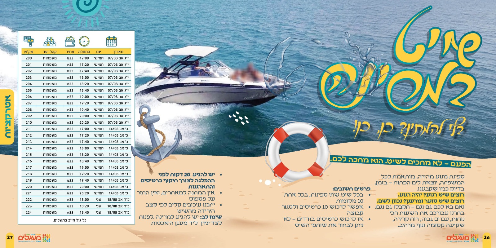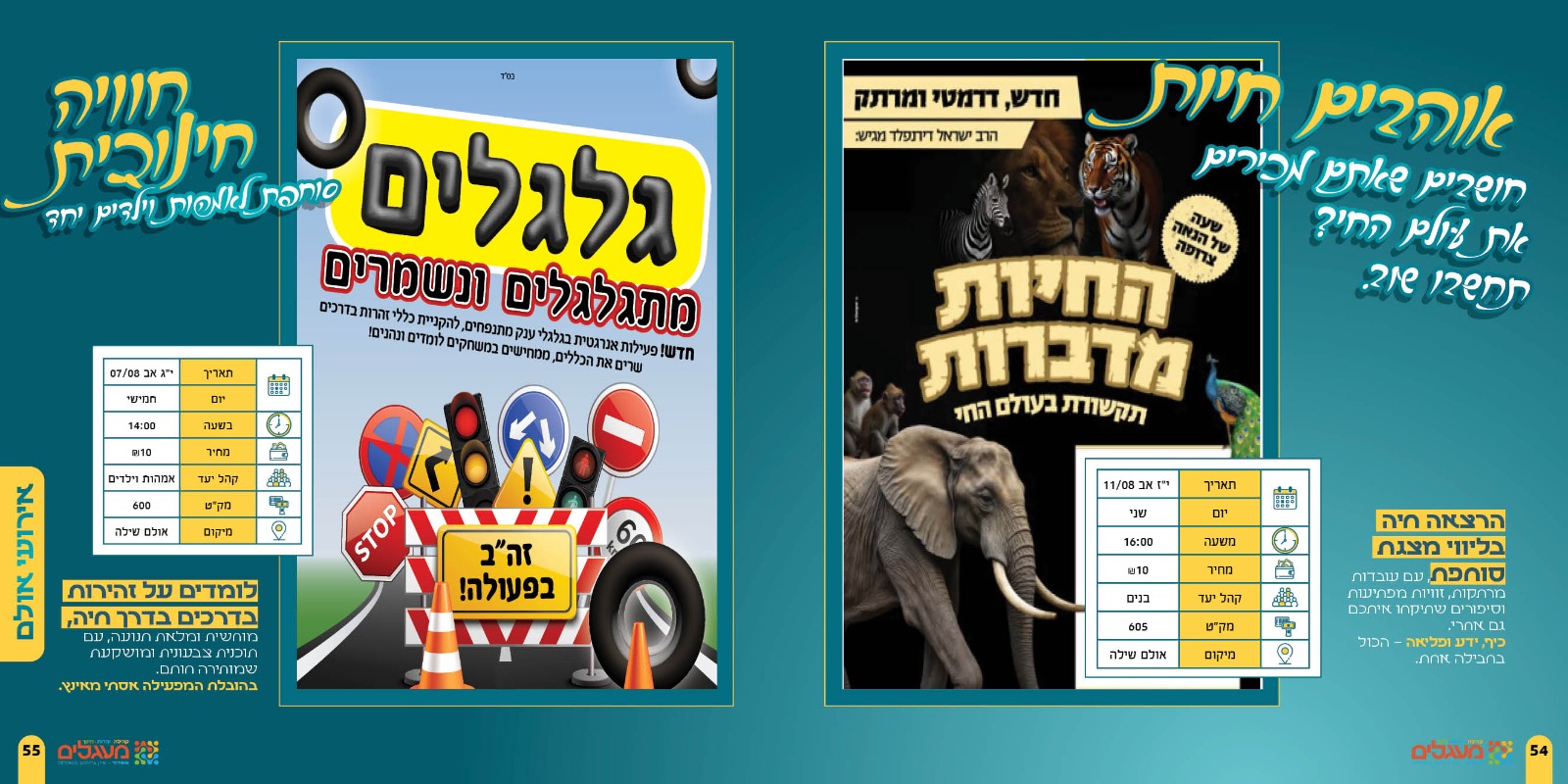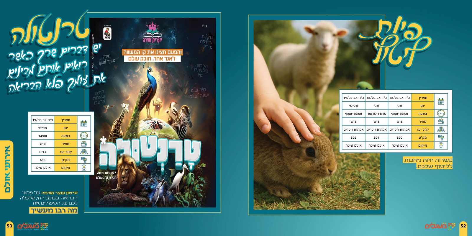 בין האטרקציות ופארקים חווייתיים, פארק ג'ננה, מתחם אקווה כיף בכנרת, מופעי אולם מרתקים במגוון רחב של מופעים, הצגות ופעילויות חינוכיות וייחודיות שיתקיימו באולם 'שילה' ברובע ו', טיולים והרפתקאות לפארקים ברחבי הארץ בדרום ובמרכז, סיור מרגש לעוטף עזה, גן החיות התנכ"י ועוד