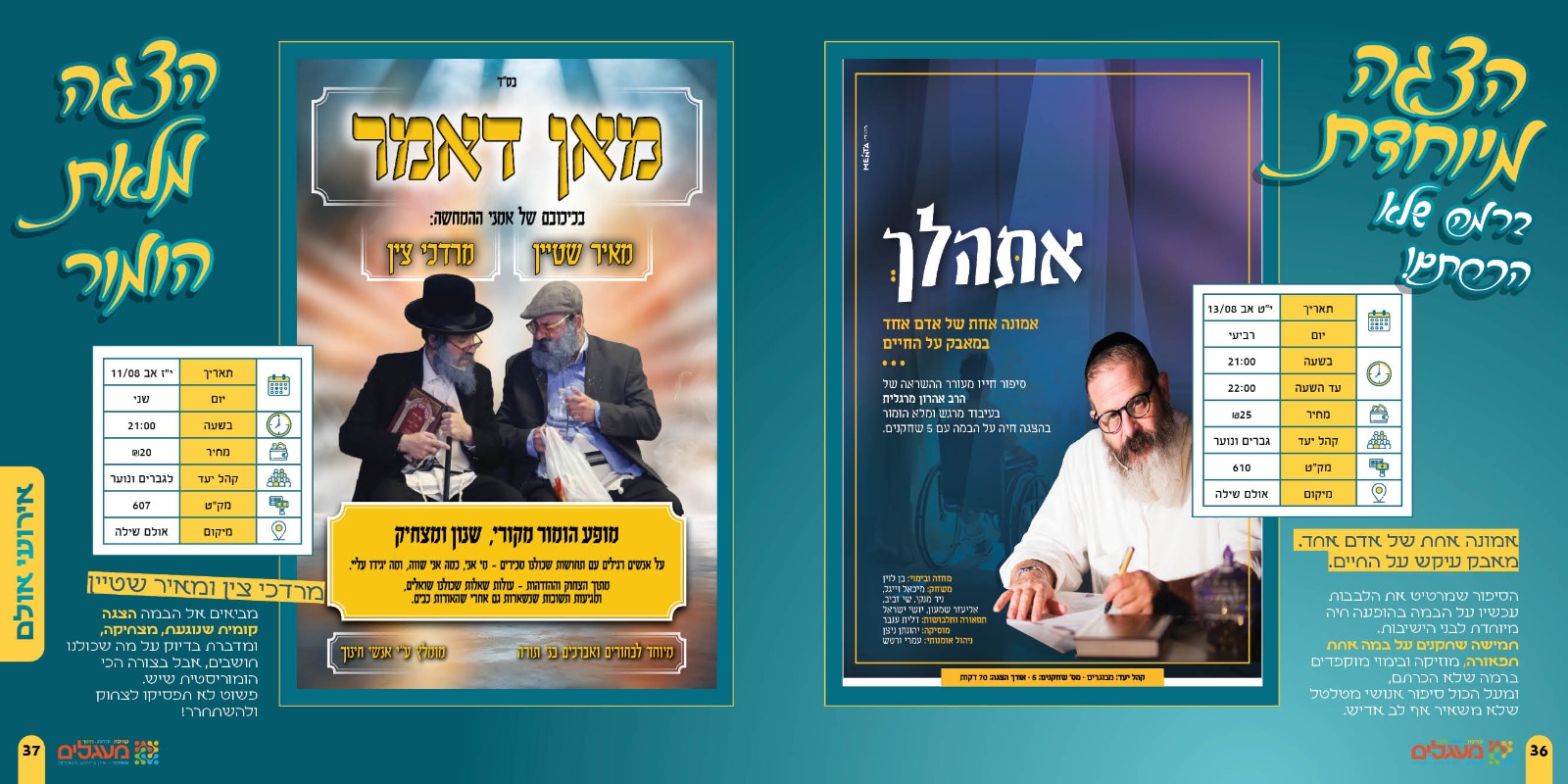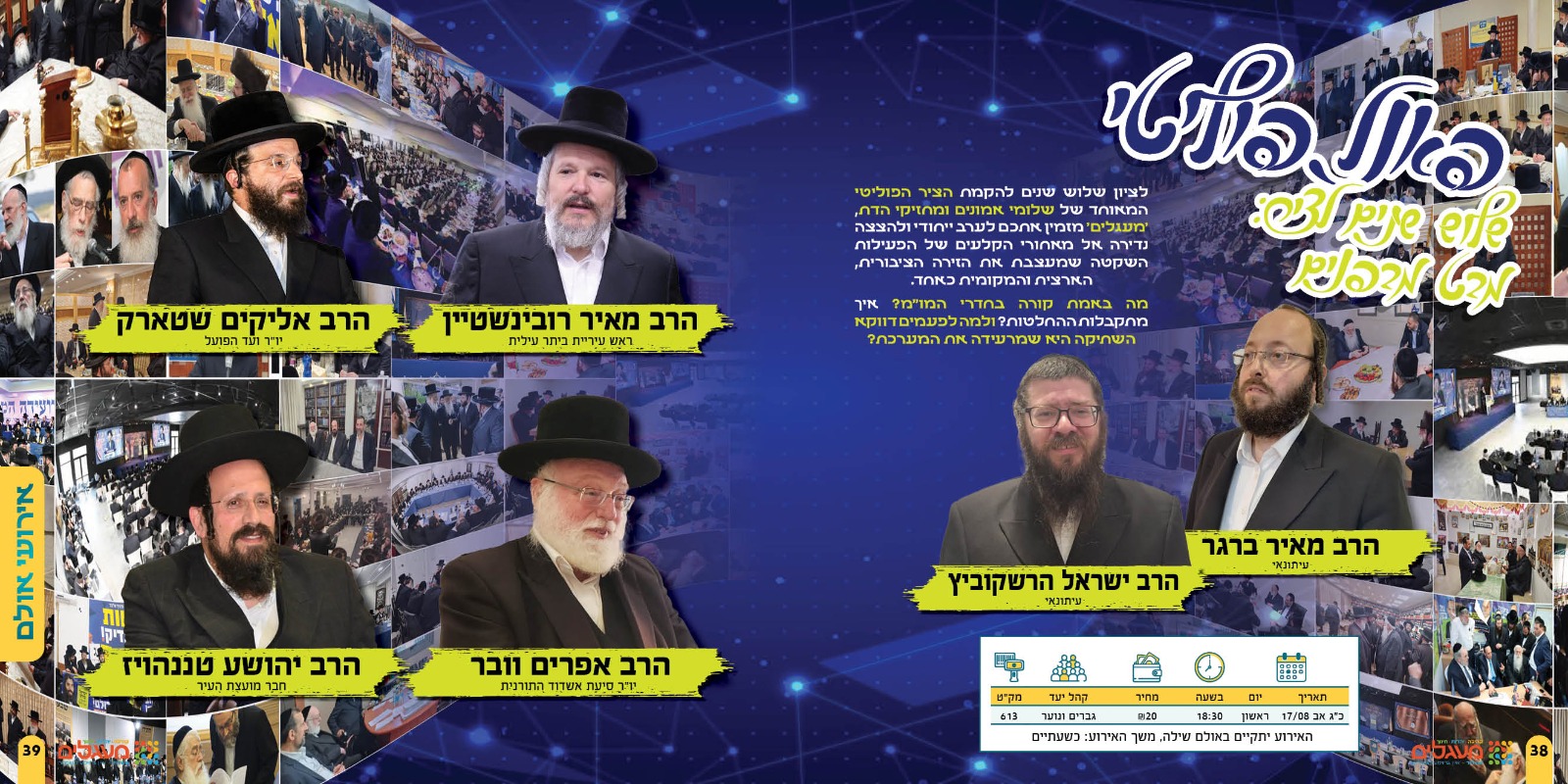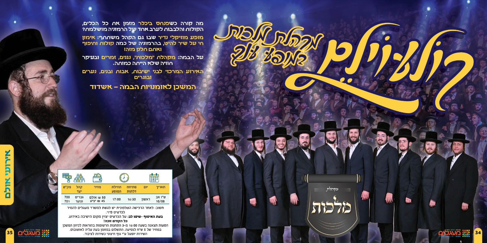 לצד ההופעות יתקיים פאנל פוליטי מרתק עם אנשי תקשורת בכירים ופוליטיים, מופע הענק קוללעוילם עם מקהלת מלכות ועוד מופעים בפיקוח ובהכוונת רבני הקהילות בעיר.