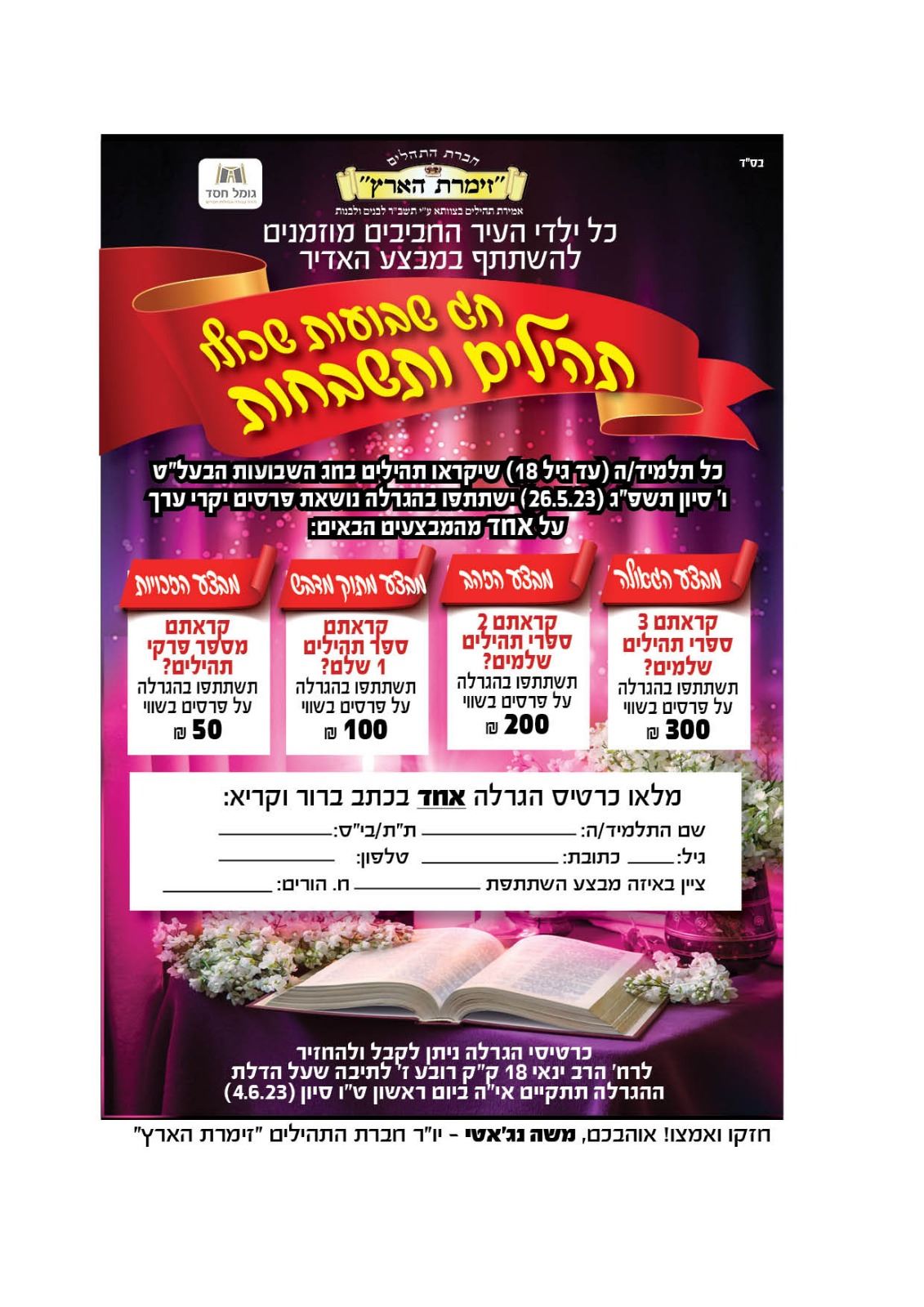 גם הבנות לא תקופחנה, כמובן, ולהן קורא רבי משה לומר פרקי תהלים במהלך החג, כאשר מי שתאמר ספרי תהילים נכנסת להגרלה.