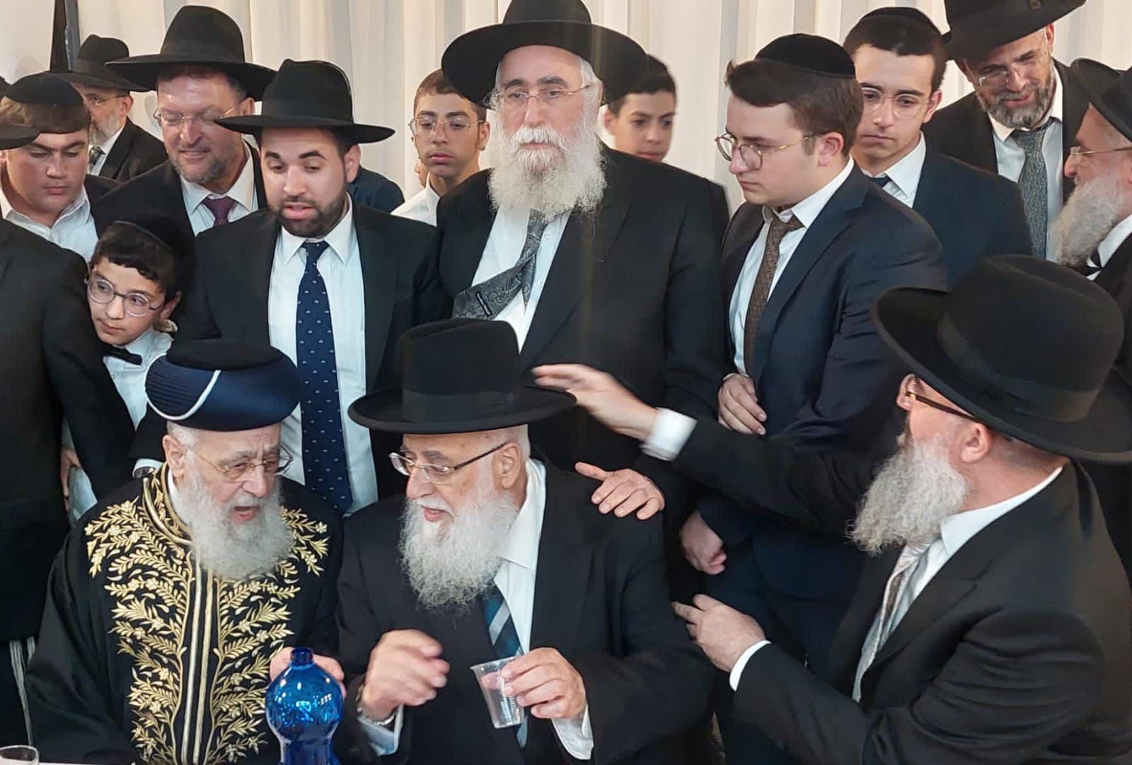 בסידור חופה וקידושין כובד הסבא הדיין הגר"י זמירבמהלך השמחה הופיע הראשון לציון הגר"י יוסף ולאחר ברכת מזל טוב הצטרף לריקודים יחד עם הרבנים.
