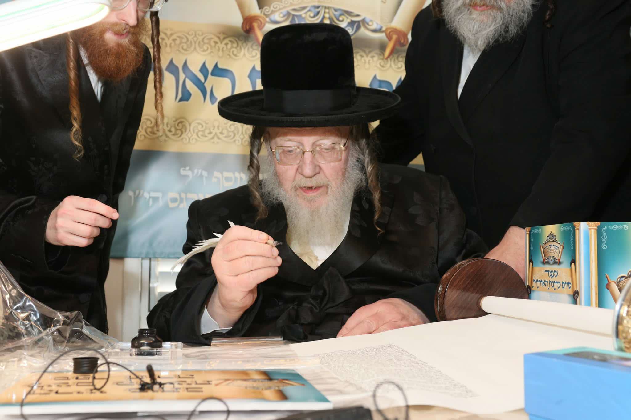 מעמד כתיבת האותיות התקיים בבית משפחת שטיינברג הי"ו בקרית פונוביז', בכתיבת האות האחרונה כובד כ"ק מרן האדמו"ר מבעלזא שליט"א, כאשר בני המשפחה עלו לירושלים ונכנסו לקודש פנימה והניחו בפניו את הספר תורה, לאחר שטבל את הקולמוס בדיו אמר: "לשם קדושת ספר תורה" וכתב אות בספר התורה ולאחר מכן בירך את בני המשפחה.