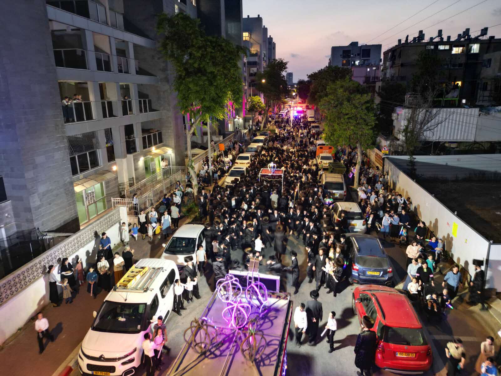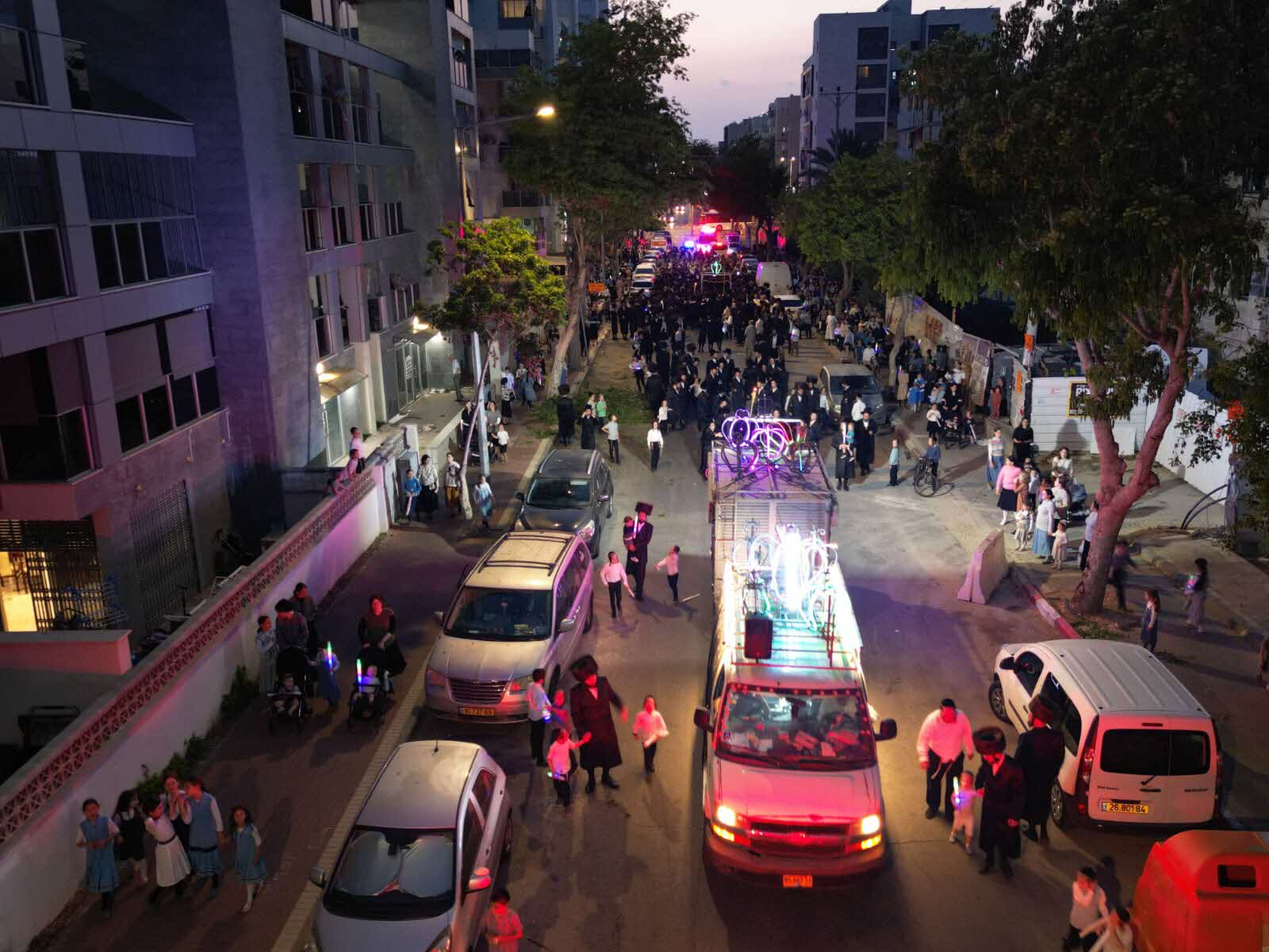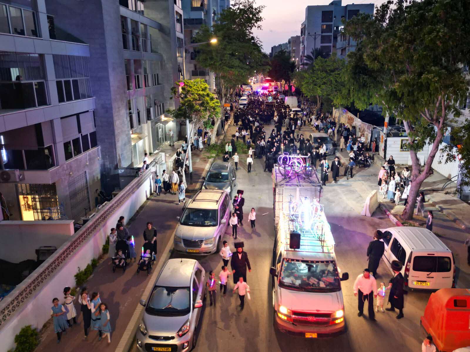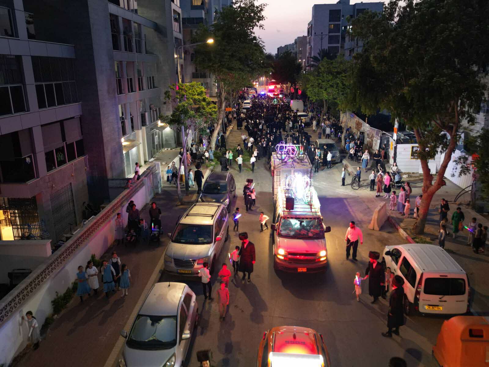 מלפני המלווים, ילדי מתפללי בית הכנסת, צעדו יחד כשרכב תפאורה ענק המקושט בשלל אלפי נורות צבעוניות משמיע כל העת שירים לכבודה של תורה. מידי פעם נטל מי מבין הרוקדים את ספר התורה בזרועו ורקד עימו במרכז המעגלים, לקול צלילי השירה במשך התהלוכה.