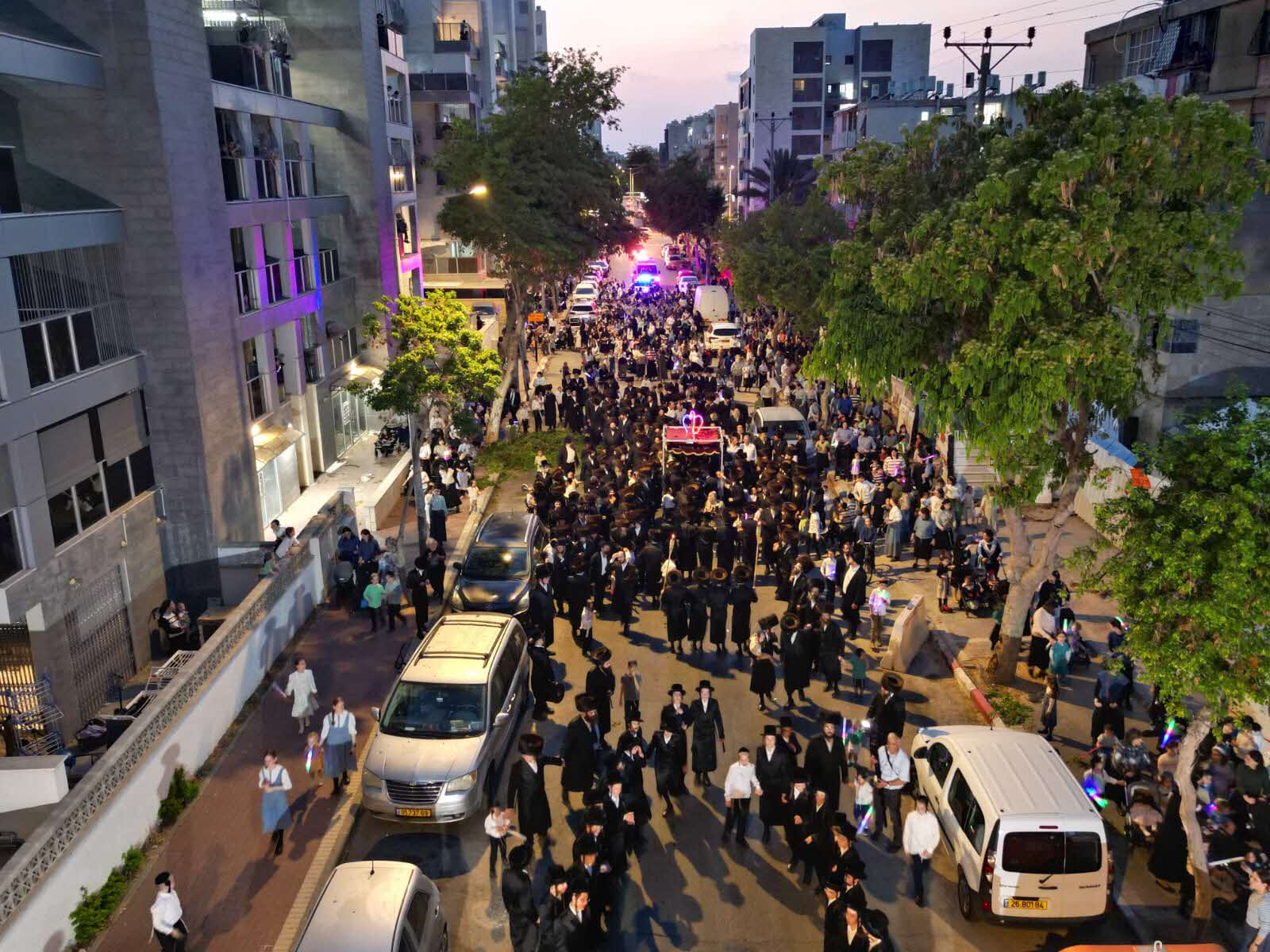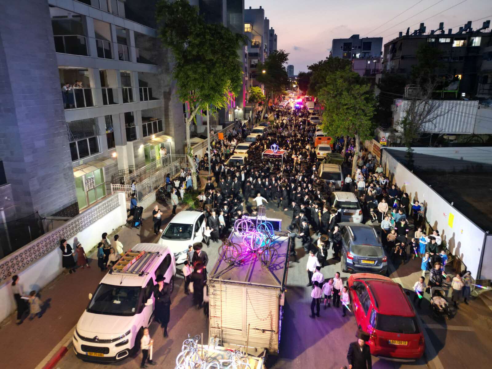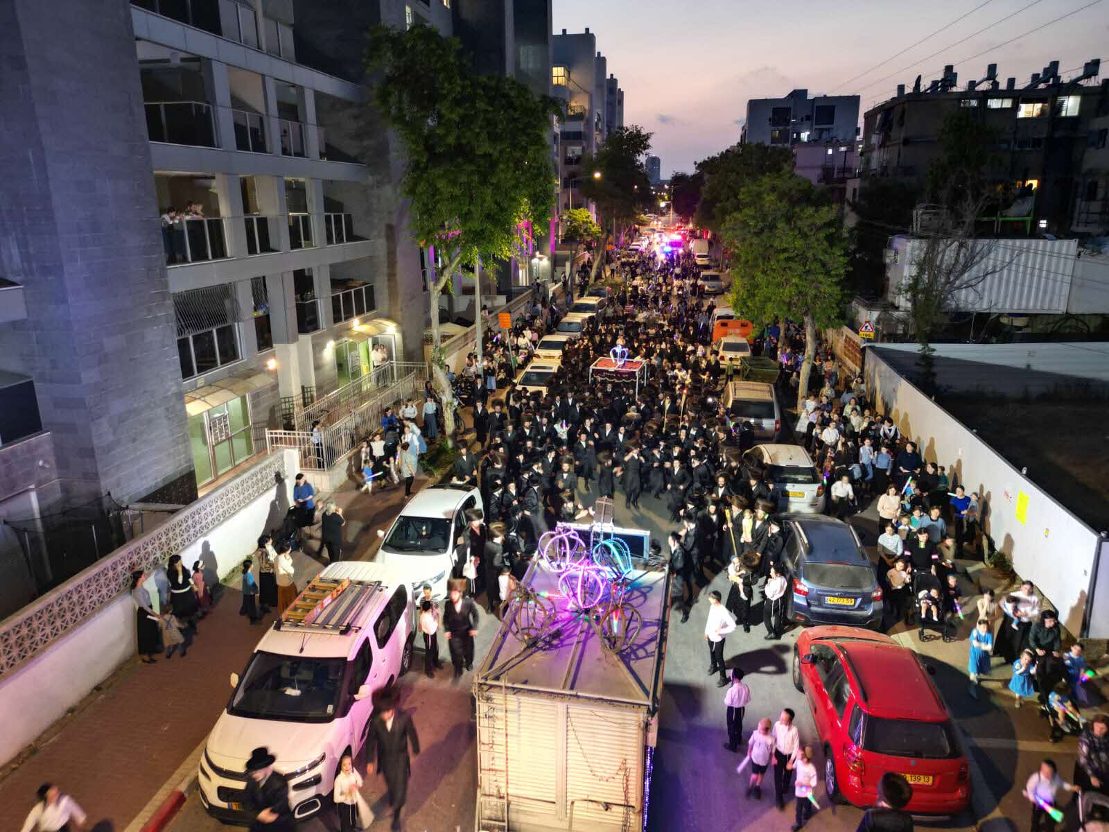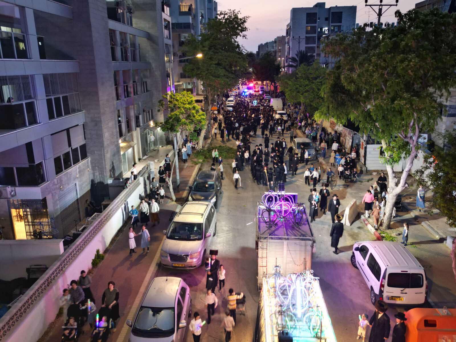 מלפני המלווים, ילדי מתפללי בית הכנסת, צעדו יחד כשרכב תפאורה ענק המקושט בשלל אלפי נורות צבעוניות משמיע כל העת שירים לכבודה של תורה. מידי פעם נטל מי מבין הרוקדים את ספר התורה בזרועו ורקד עימו במרכז המעגלים, לקול צלילי השירה במשך התהלוכה.