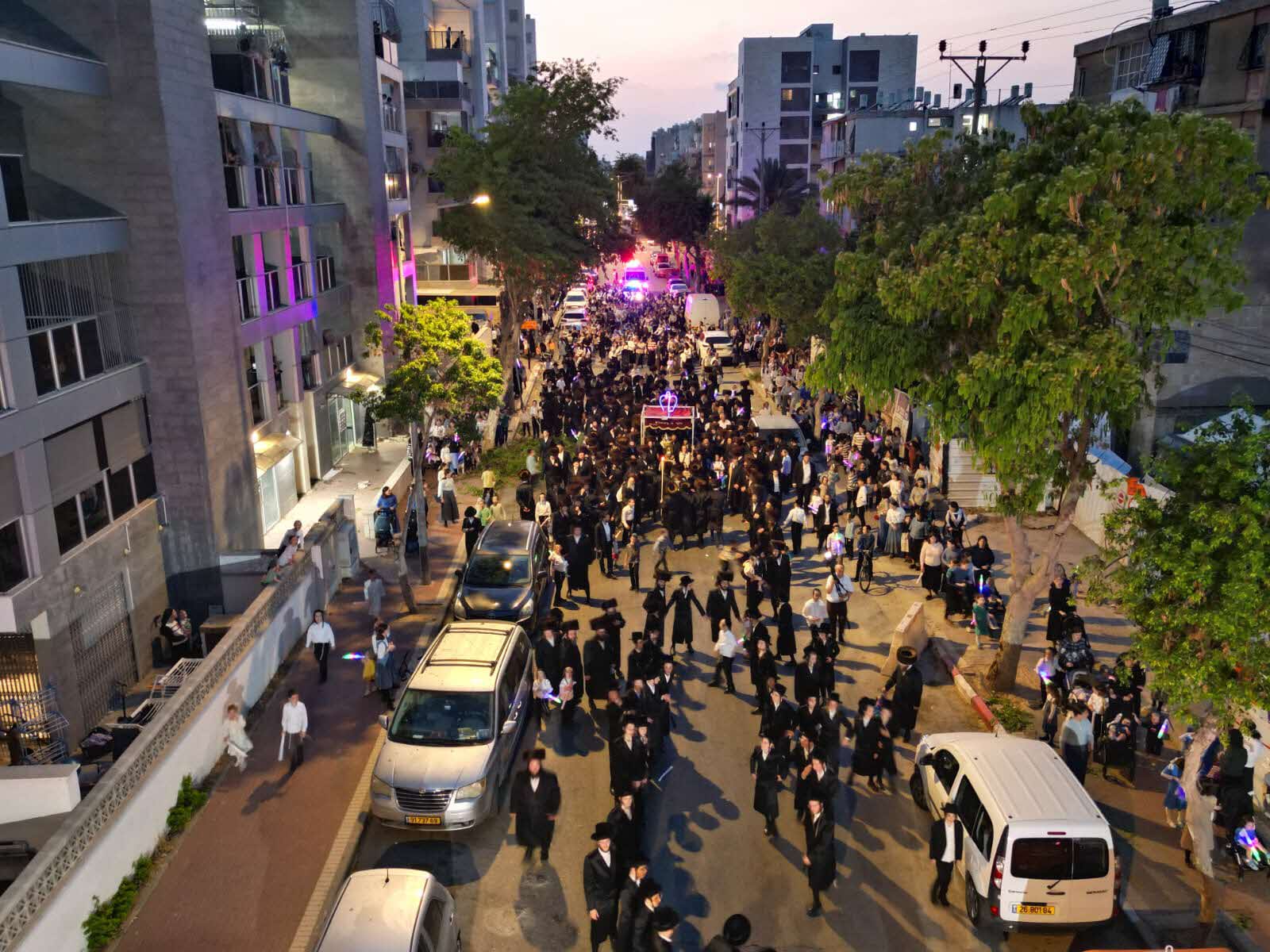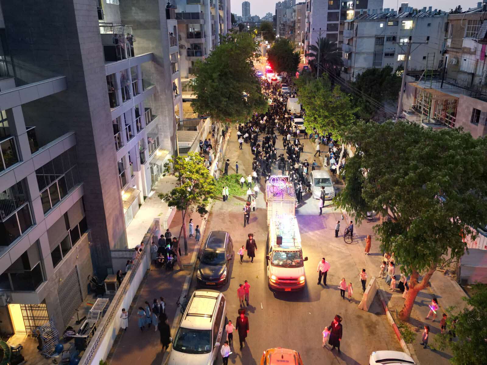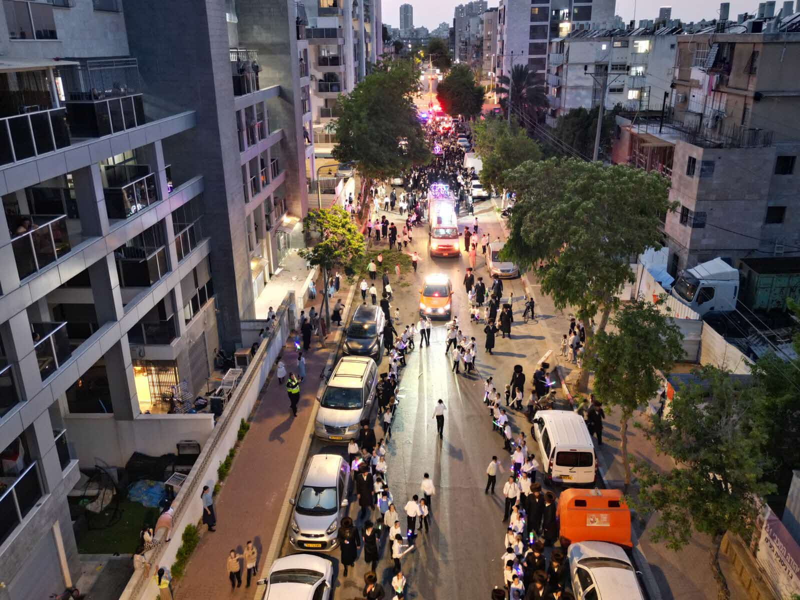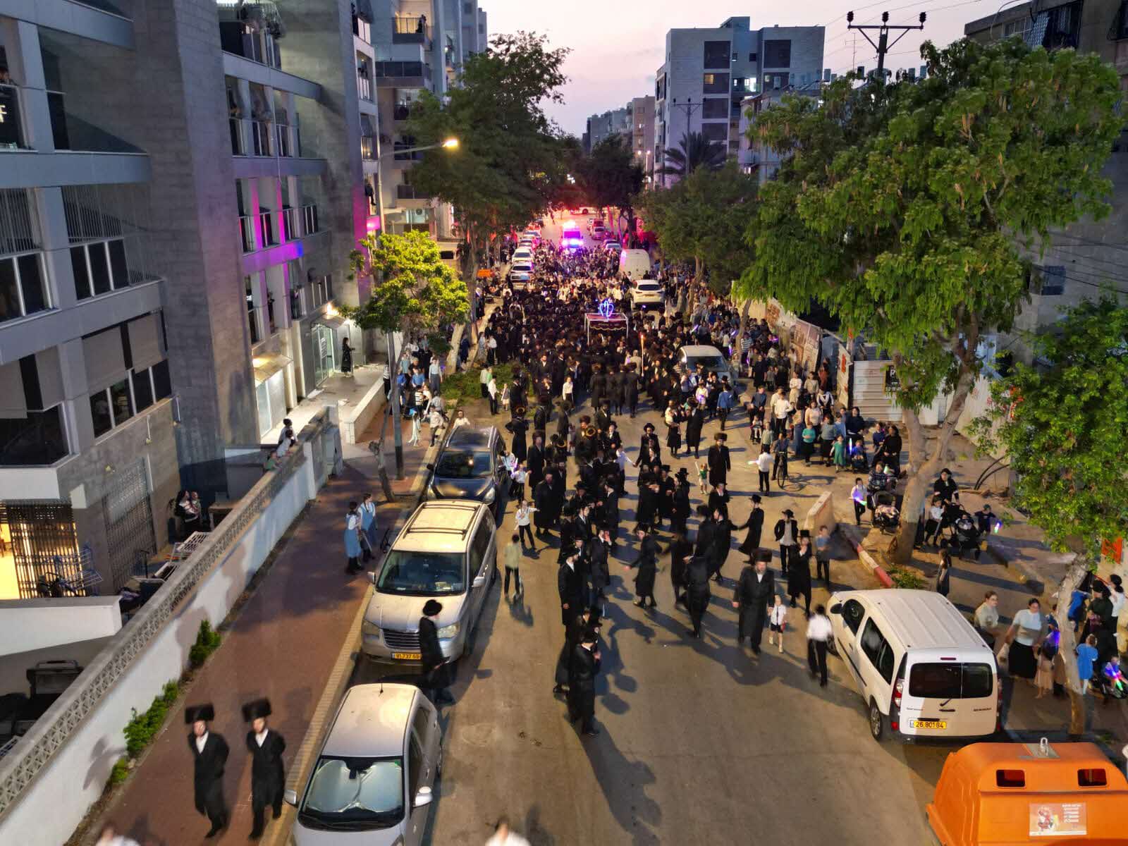 מלפני המלווים, ילדי מתפללי בית הכנסת, צעדו יחד כשרכב תפאורה ענק המקושט בשלל אלפי נורות צבעוניות משמיע כל העת שירים לכבודה של תורה. מידי פעם נטל מי מבין הרוקדים את ספר התורה בזרועו ורקד עימו במרכז המעגלים, לקול צלילי השירה במשך התהלוכה.