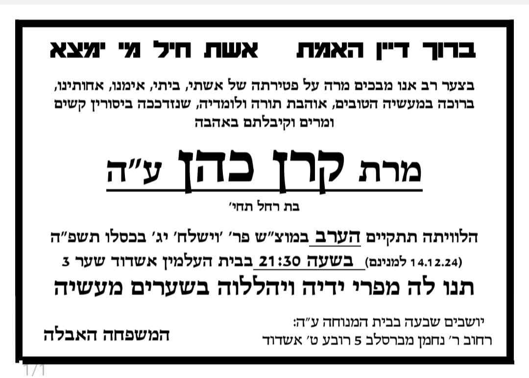 היית האור בעיניים שלנו והטעם שלי לחיות. היום בבוקר בעיצומה של שבת קודש, נגזר שייסורייך הספיקו ואת צריכה לחזור לאבא שבשמיים. וקרן כמו קרן עשית לנו הכנה של כמה ימים כדי שנעקל את זה. במסיכת סנהדרין כתוב שלכל דבר יש תמורה בעולם, חוץ מאשת נעורים שנפטרה.