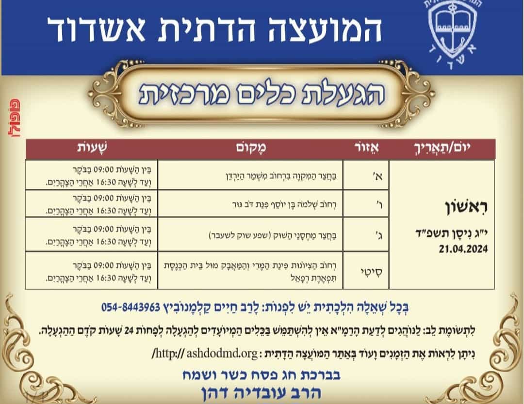 היום ראשון יג' בניסן 21.4.2024 יתקיים "הגעלת כלים" ללא תשלום שע"י המועצה הדתית במקומות הבאים כדלהלן: