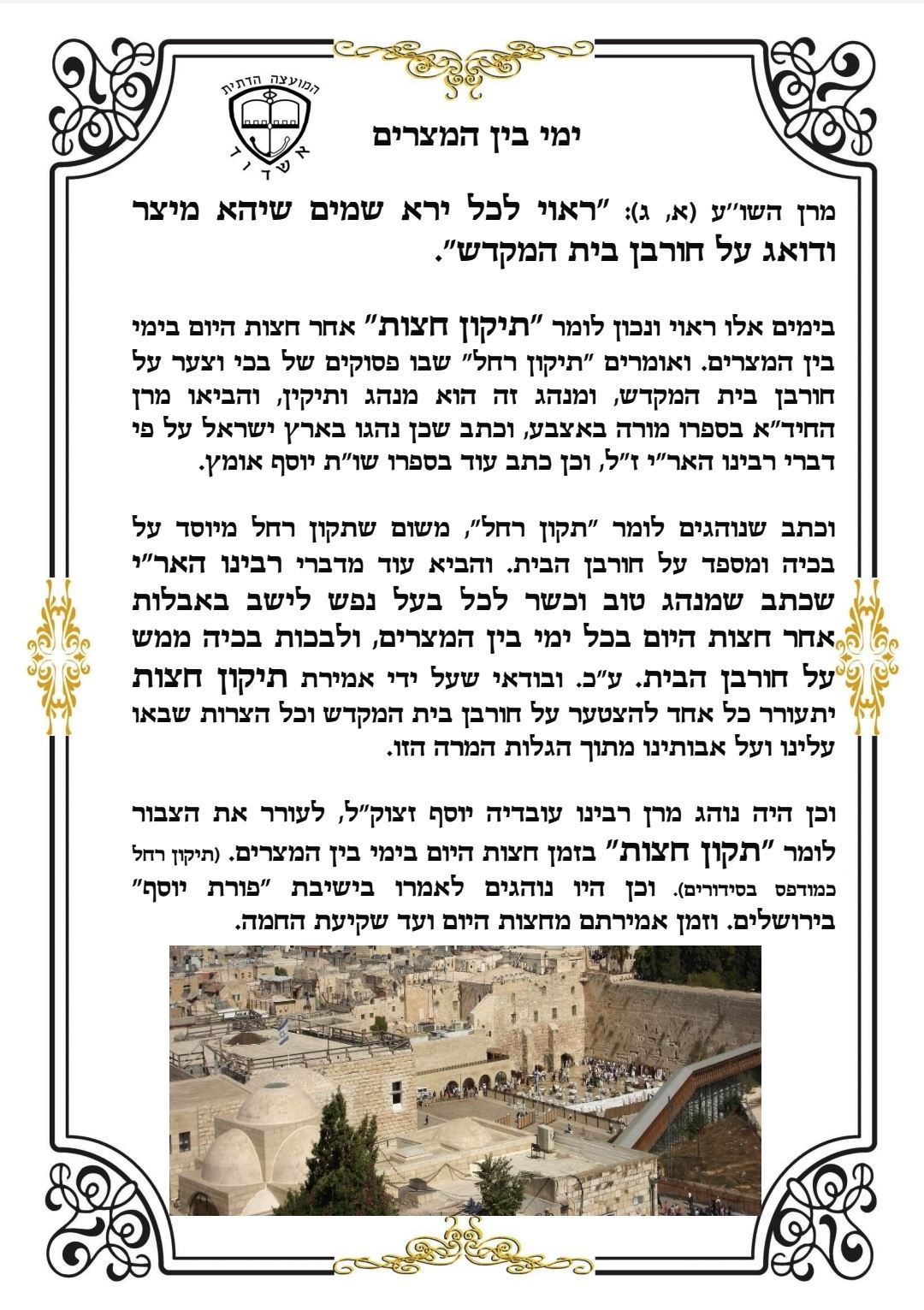 במועצה הדתית הפיצו עלון שחולק לבתי הכנסת המעורר את החשיבות לומר "תיקון חצות" לאחר תפילת מנחה בכל יום בצהריים בימים אלו של בין המצרים עד ערב תשעה באב.