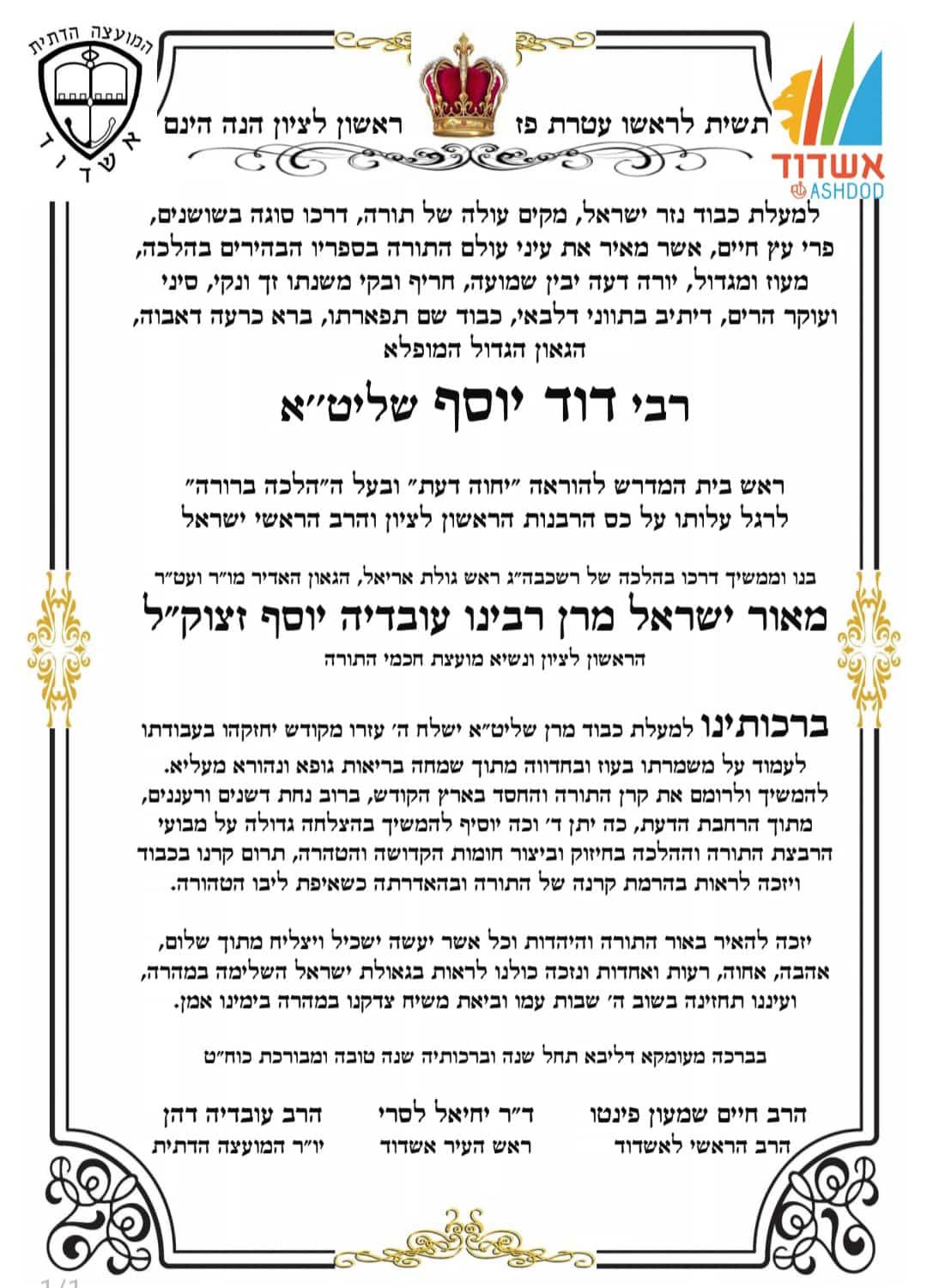 עם בחירתו של הגאון הגדול רבי דוד יוסף שליט"א להראשון לציון ולרב הראשי לישראל, חברי גוף הבוחר מעירנו כבוד המרא דאתרא הגה"צ רבי חיים שמעון פינטו שליט"א, הרב עובדיה דהן הי"ו יו"ר המועצה הדתית אשדוד וראש העיר ד"ר יחיאל לסרי הי"ו שלחו איגרת איחולי ברכה להראשון לציון רבי דוד יוסף שליט"א.