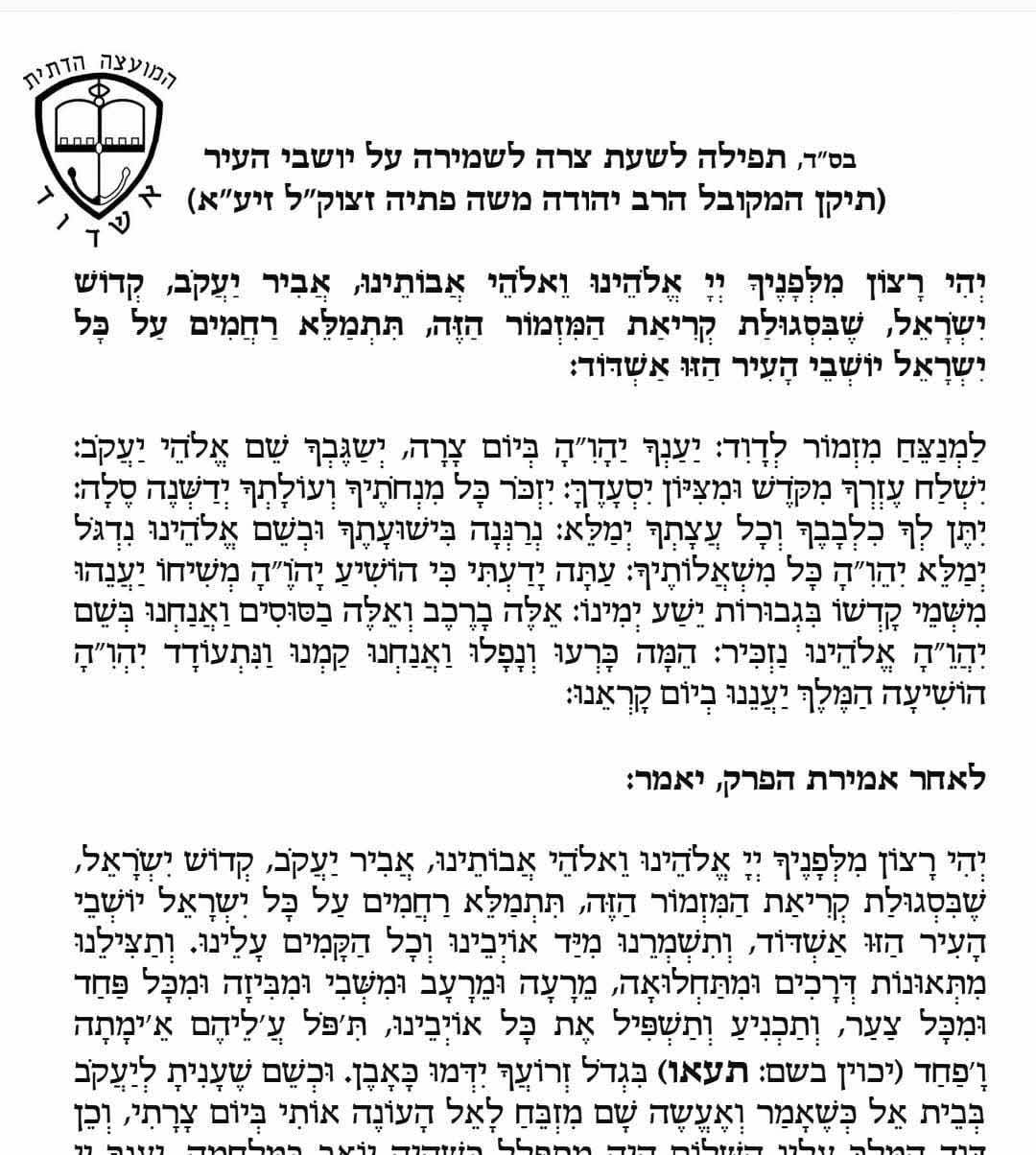 בתפילה מוזכרים המילים: שֶׁבִּסְגוּלַת קְרִיאַת הַמִּזְמוֹר הַזֶּה, תִּתְמַלֵּא רַחֲמִים עַל כָּל יִשְרָאֵל ויוֹשְׁבֵי הָעִיר הַזּוּ אַשְׁדּוֹד, וְתִשְׁמְרֵנוּ מִיַּד אוֹיְבֵינוּ וְכָל הַקָּמִים עָלֵינוּ. וְתַצִּילֵנוּ מִתְּאוּנוֹת דְּרָכִים וּמִתַּחְלוּאָה...